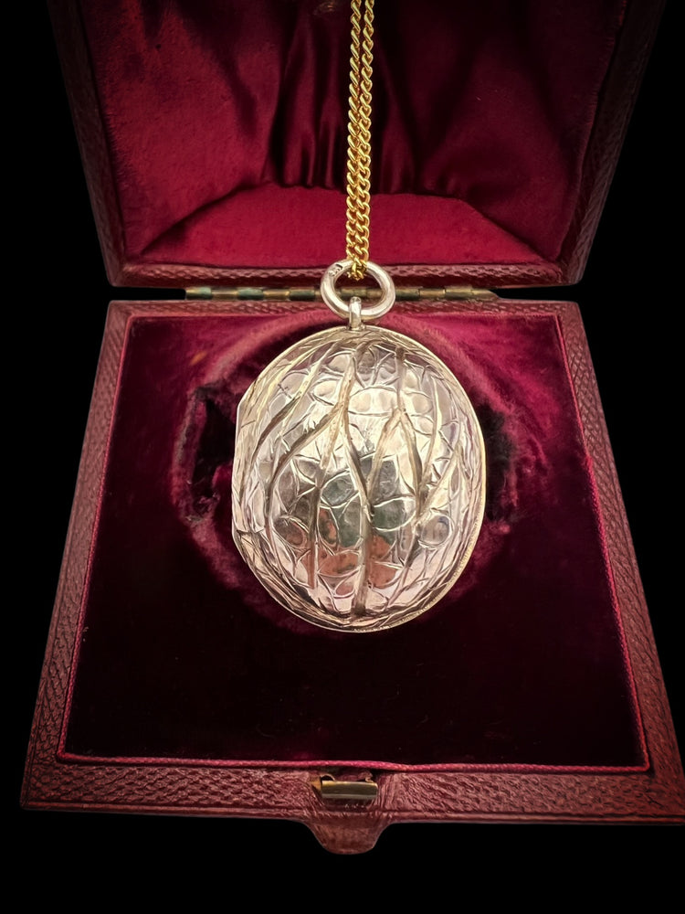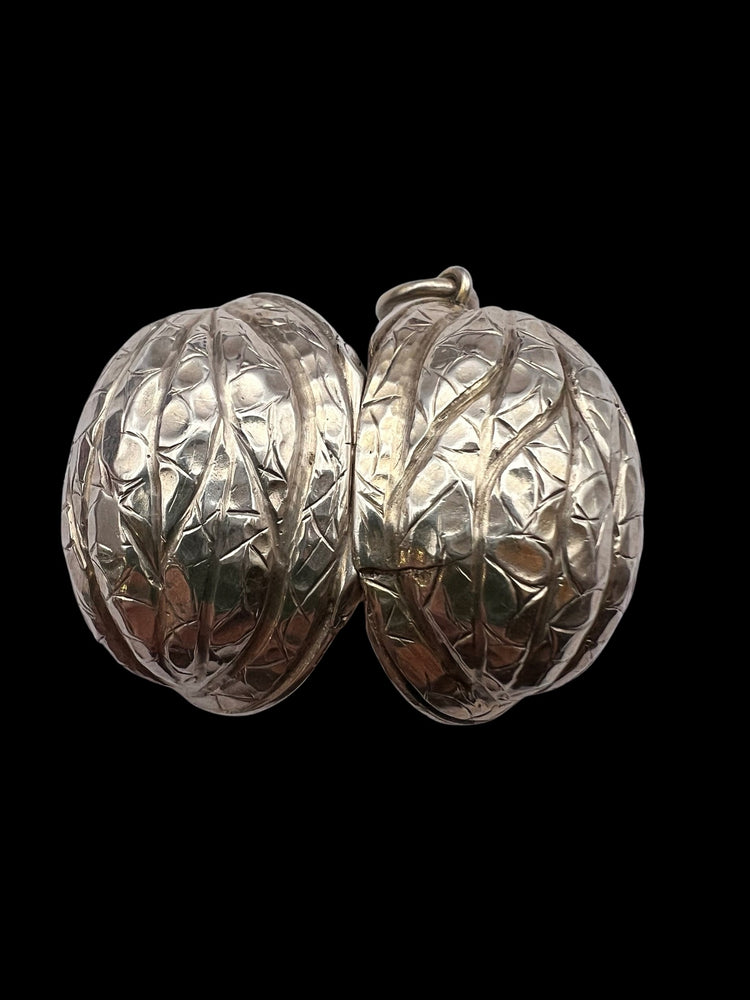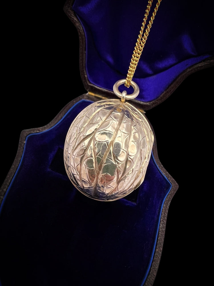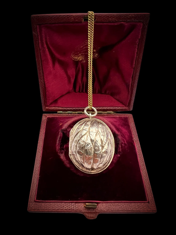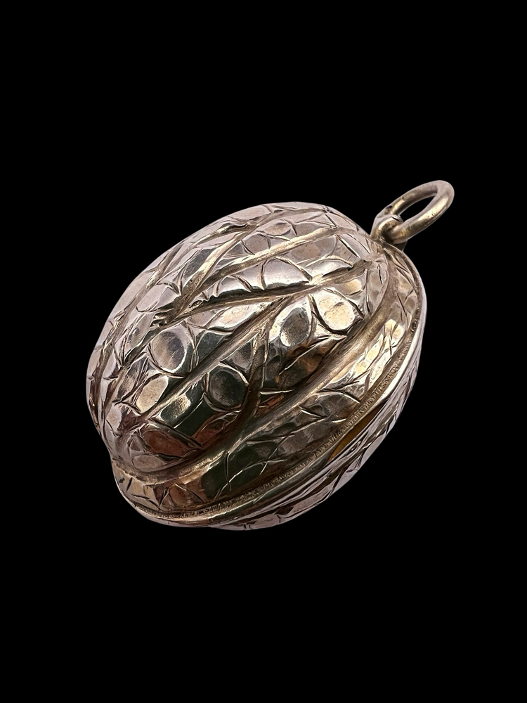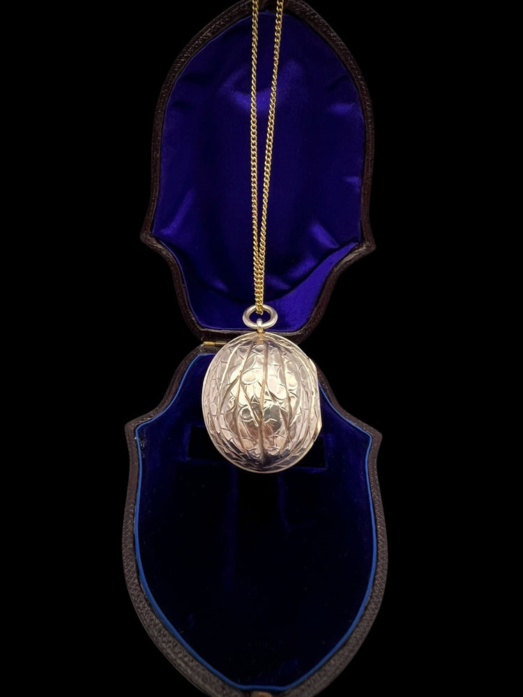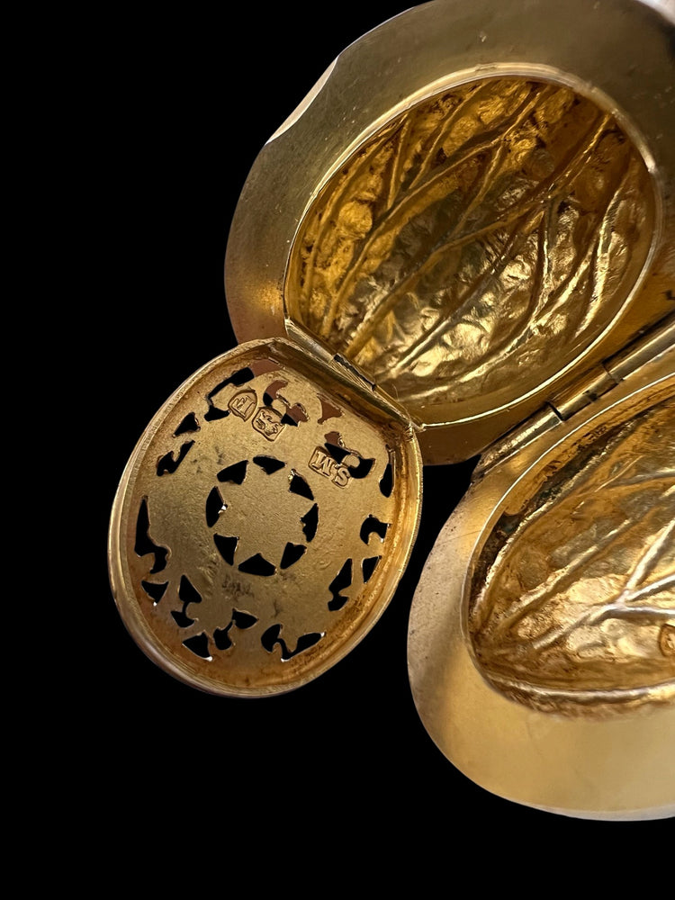 Hinged at the centre, the Walnut opens to reveal a silver gilt interior with an elaborately pierced grille which open and closes securely.