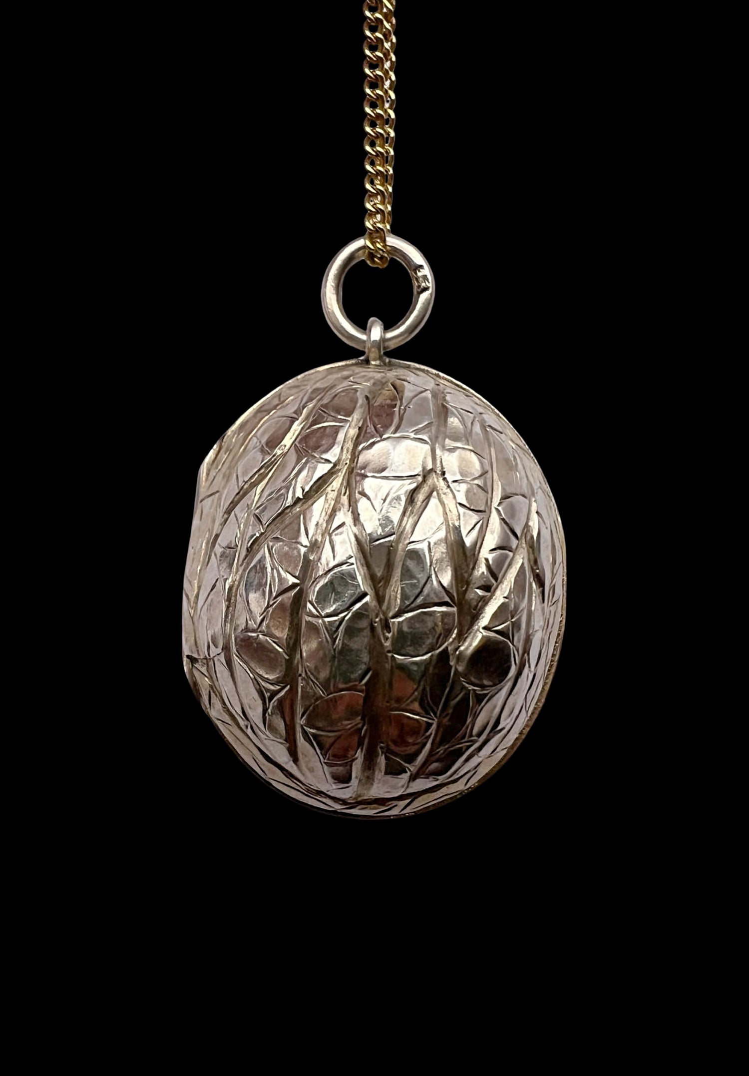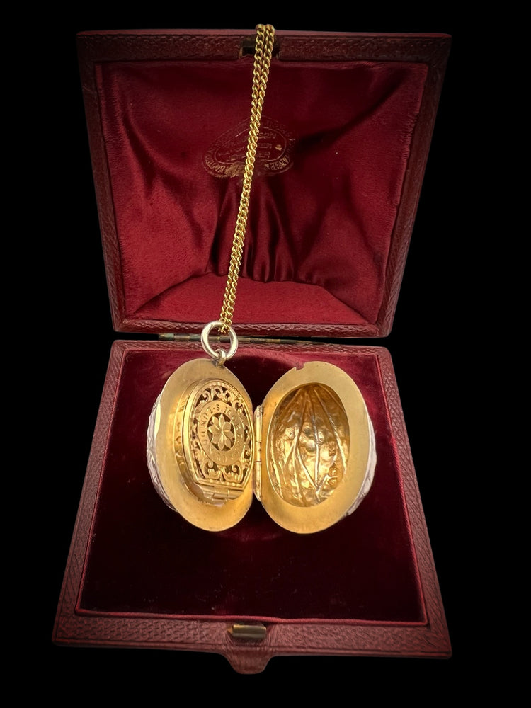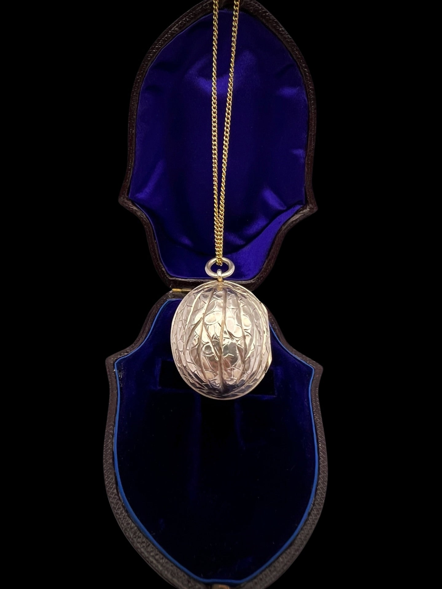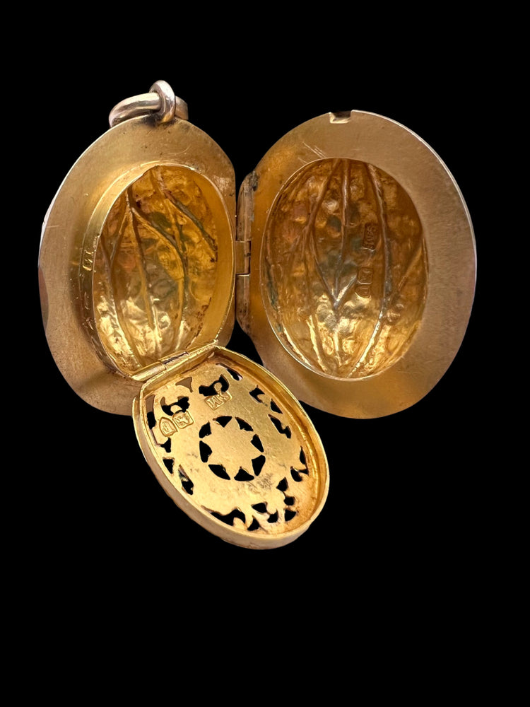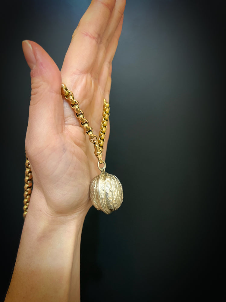 Hinged at the centre, the Walnut opens to reveal a silver gilt interior with an elaborately pierced grille which open and closes securely.