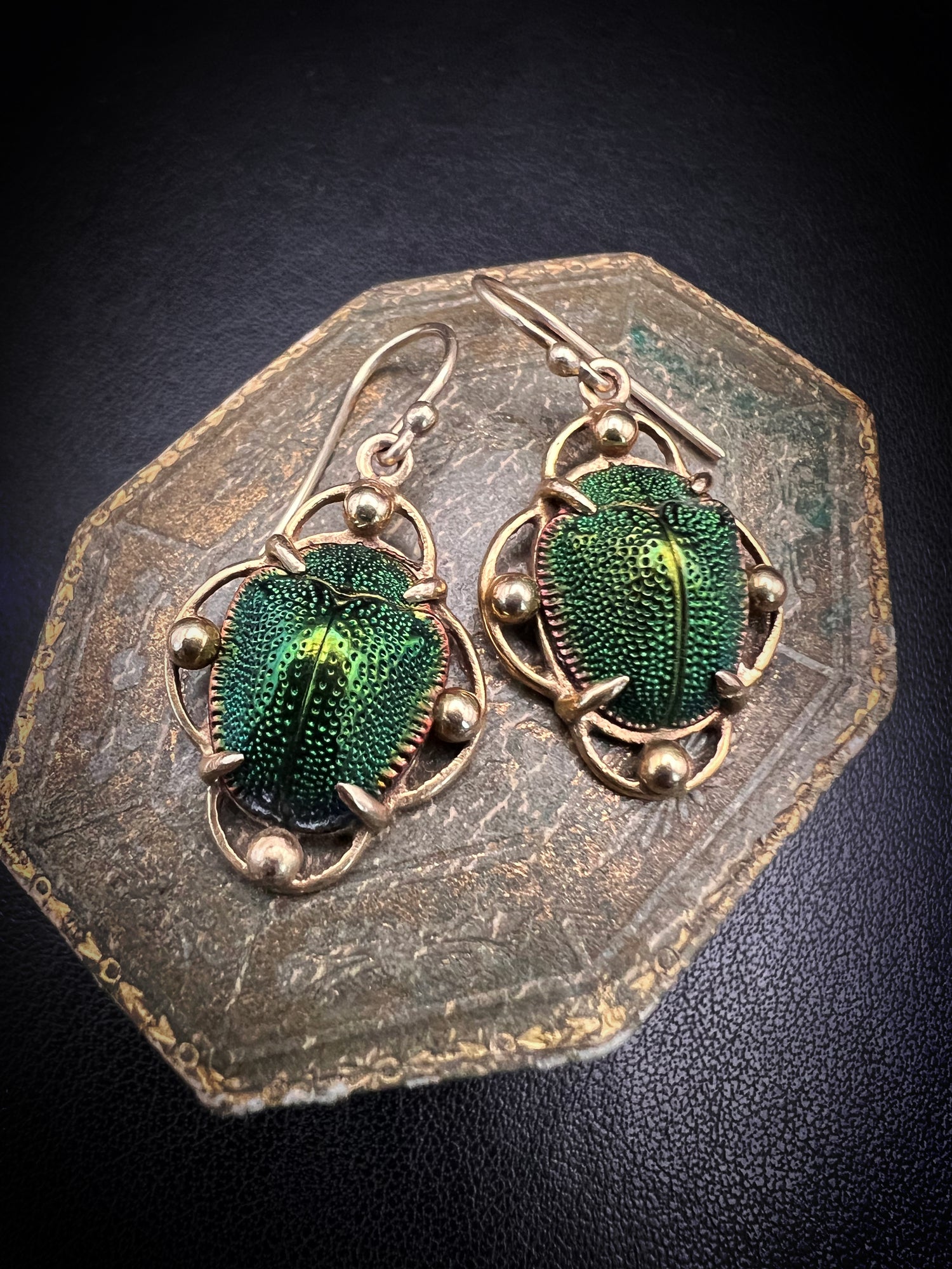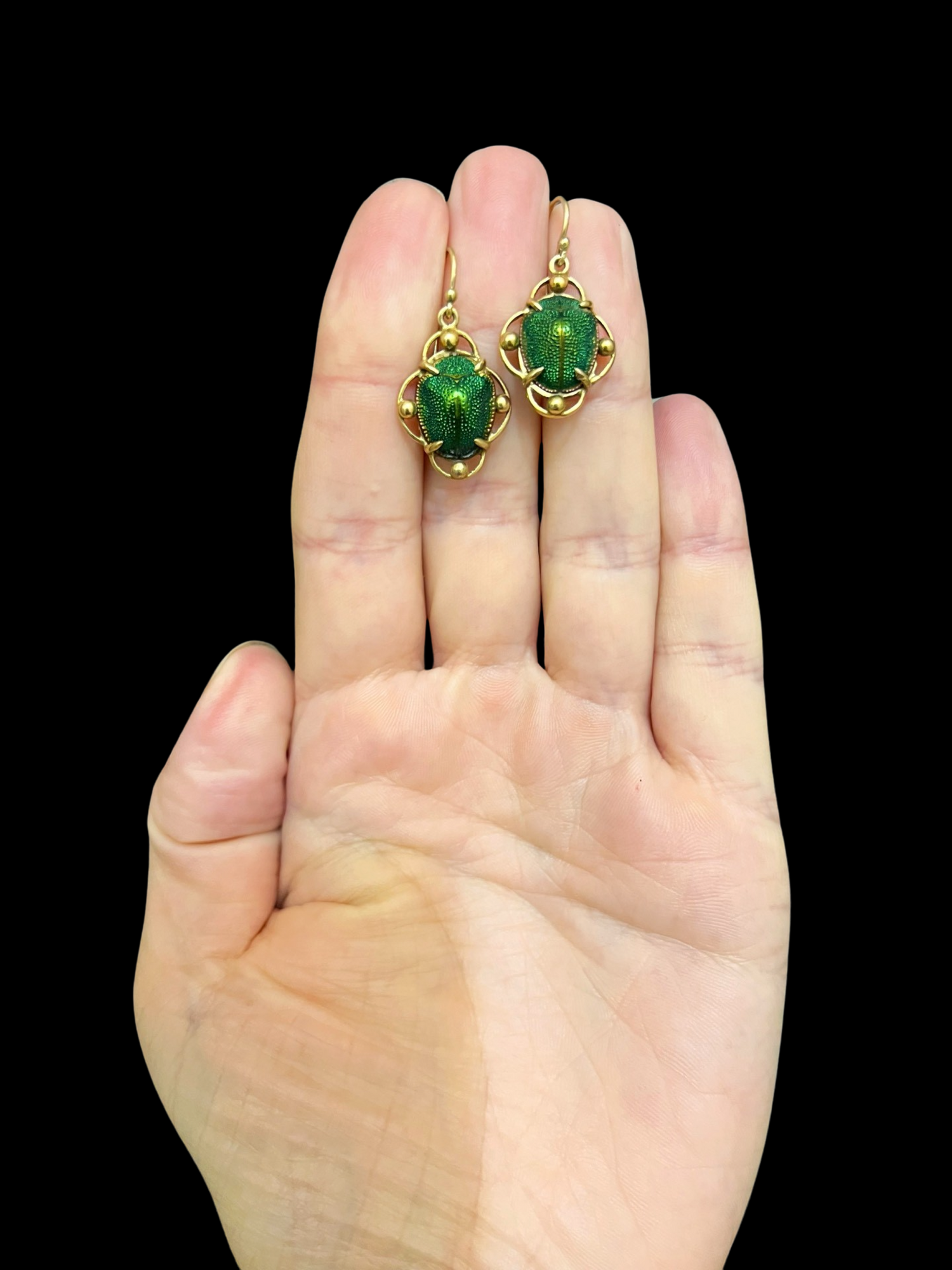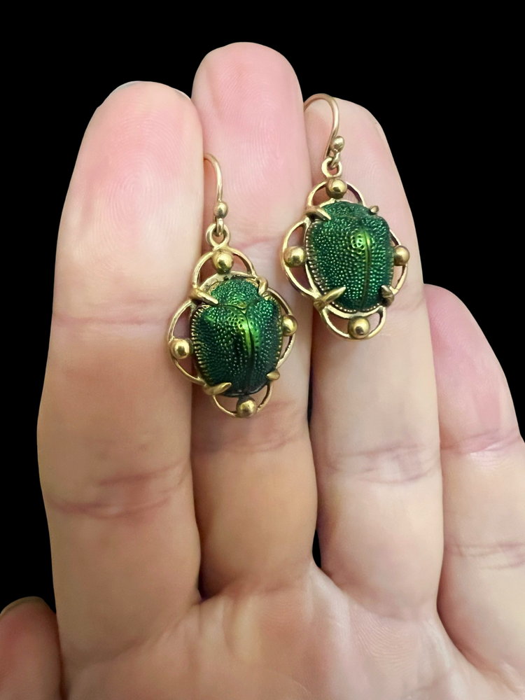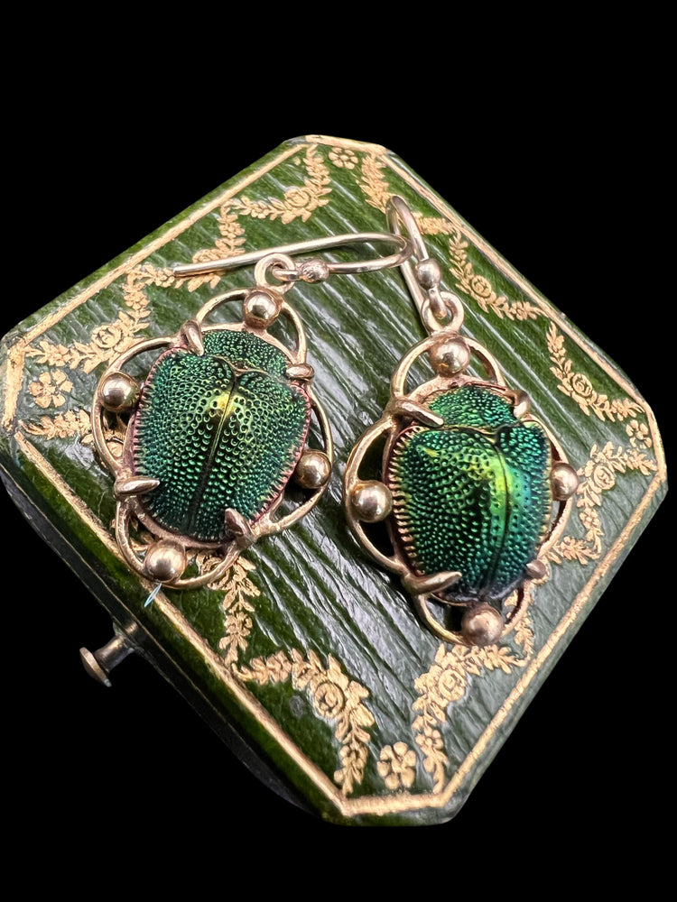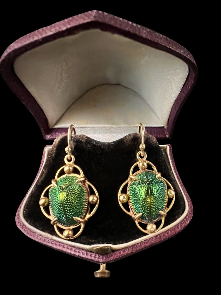 The earrings are made of two perfectly preserved Victorian scarab beetles, which have been set at a later date in 9ct gold fancy mounts.
