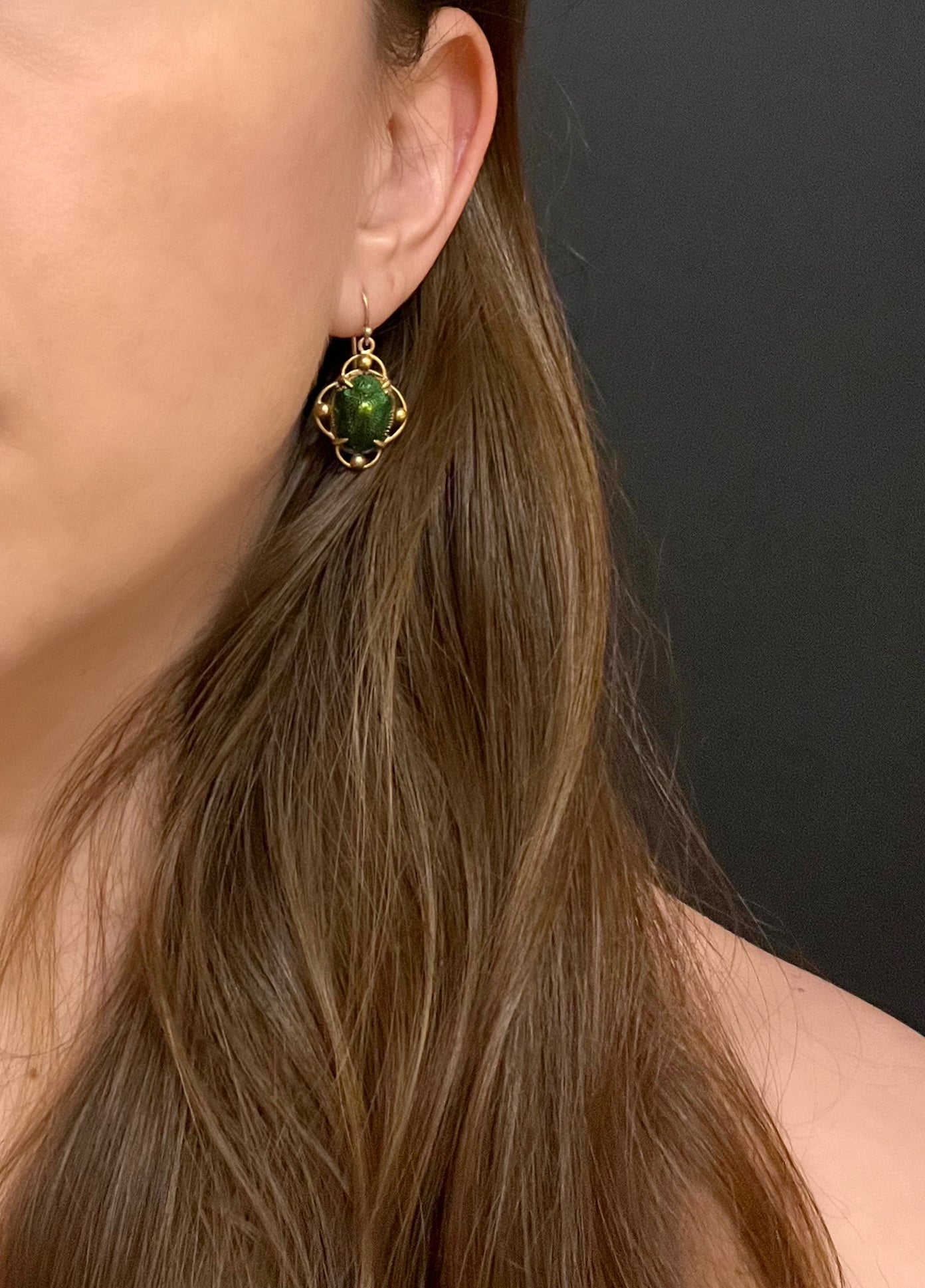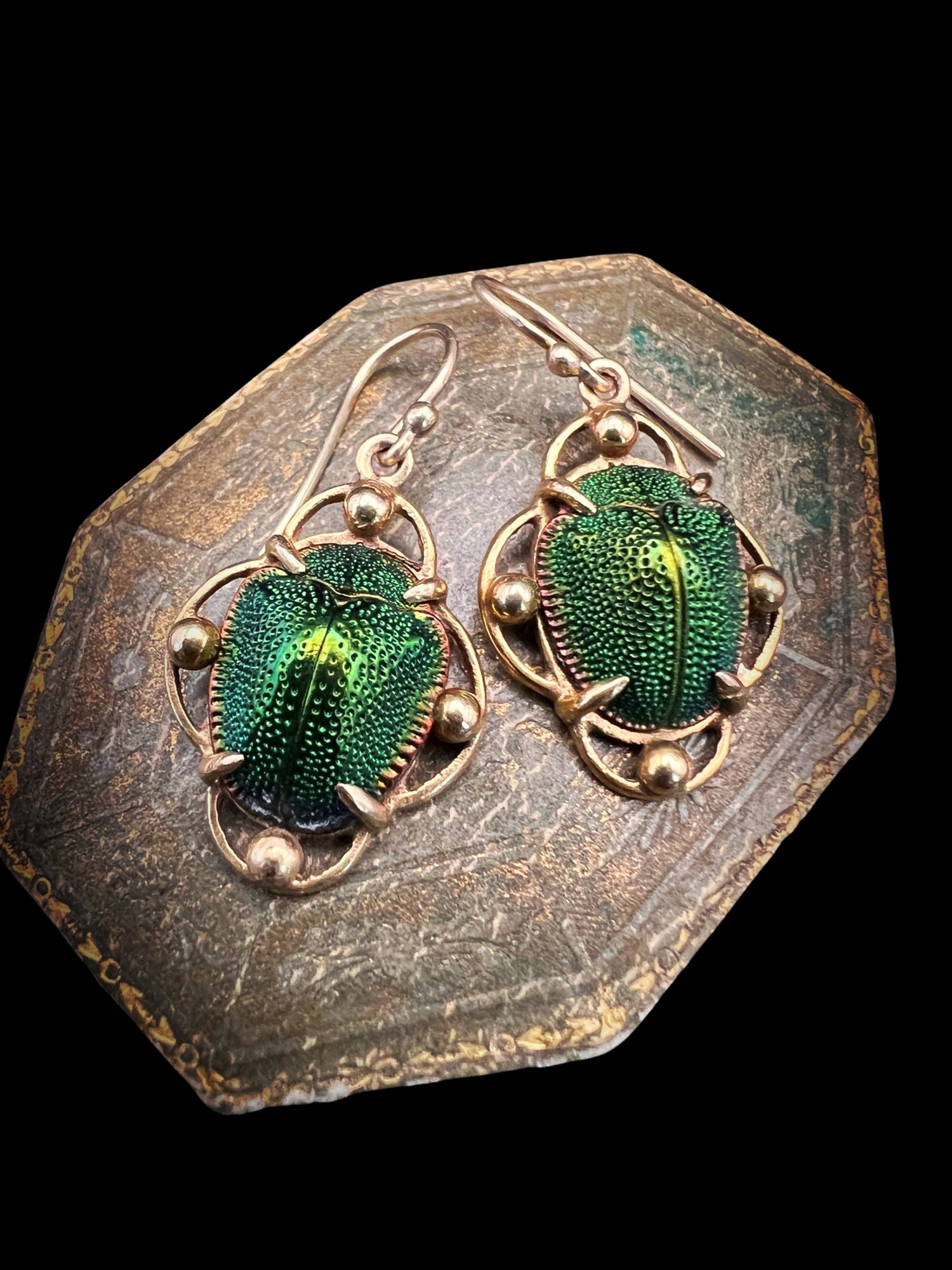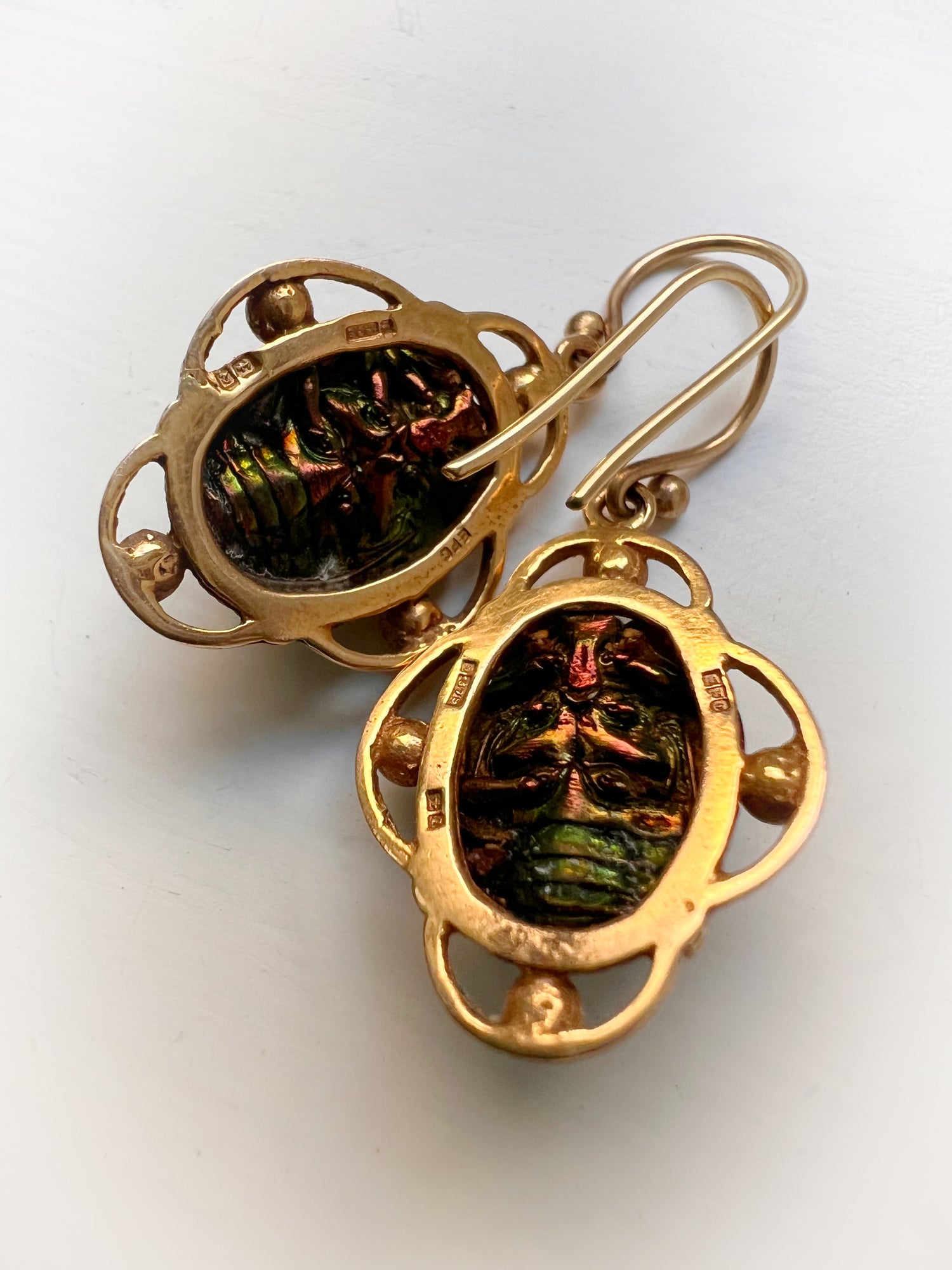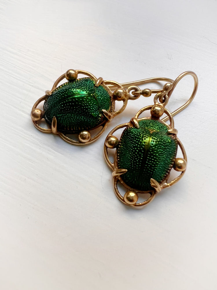 The earrings are made of two perfectly preserved Victorian scarab beetles, which have been set at a later date in 9ct gold fancy mounts.