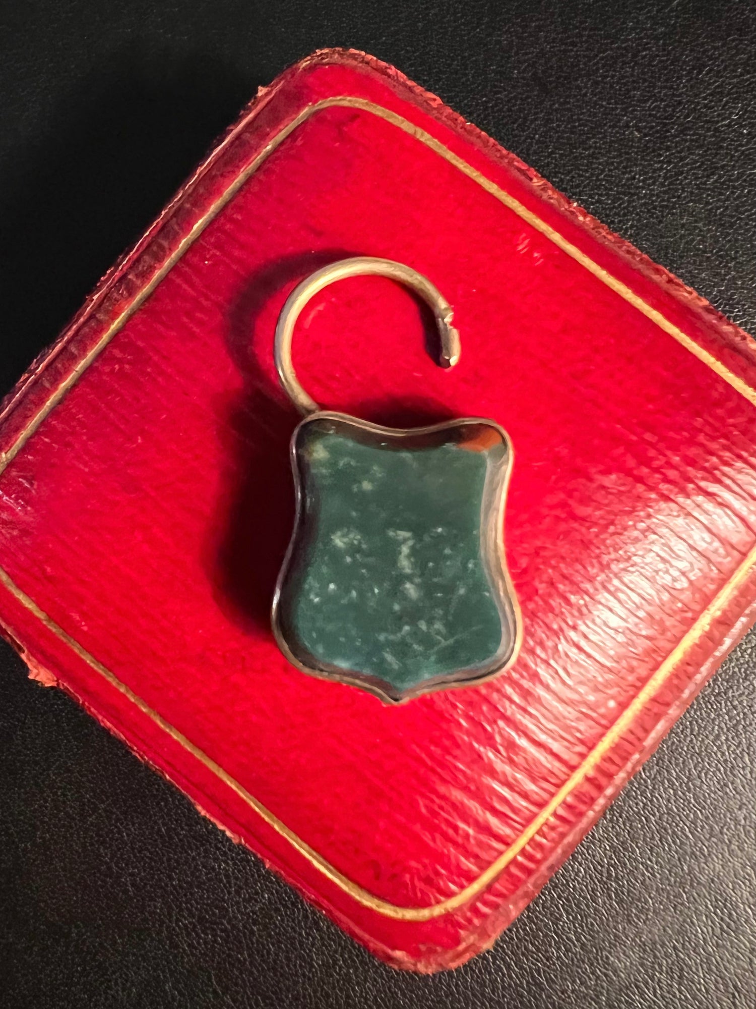 The shield shape agate has a lovely green tone with flecks of red.