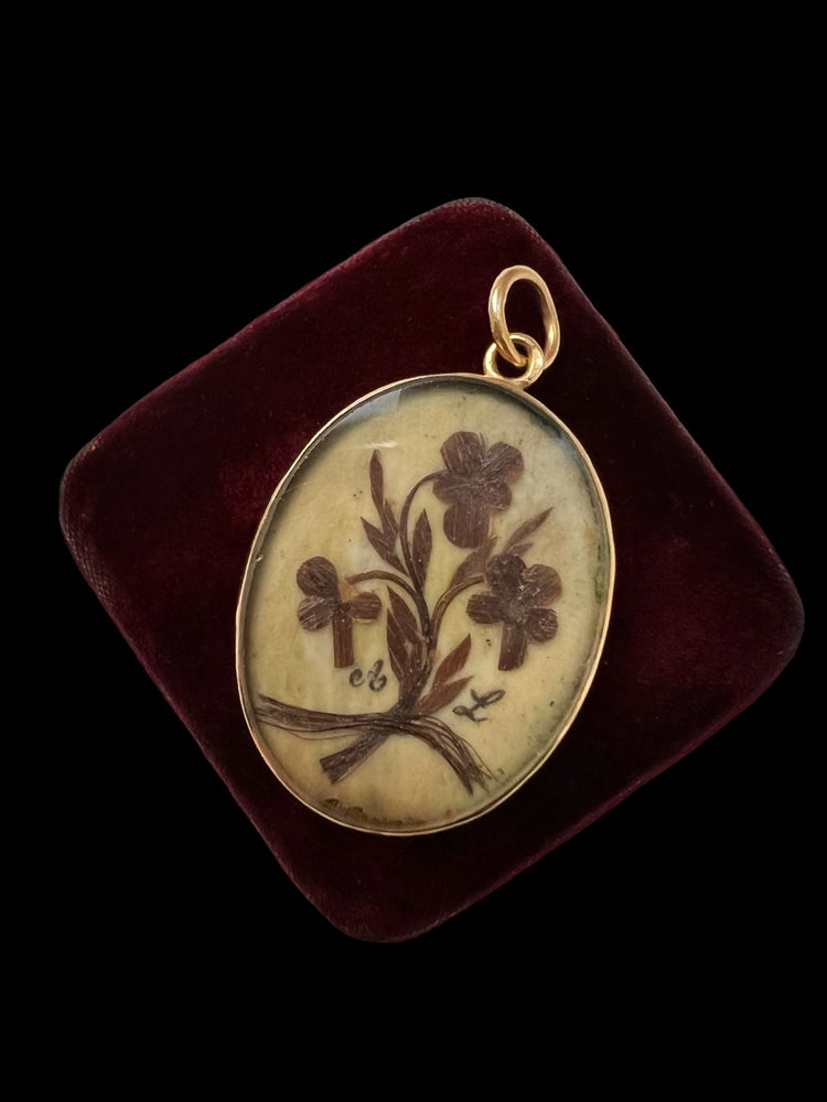 The reverse of the pendant has a Pansy made from hair. With the letters AL.
