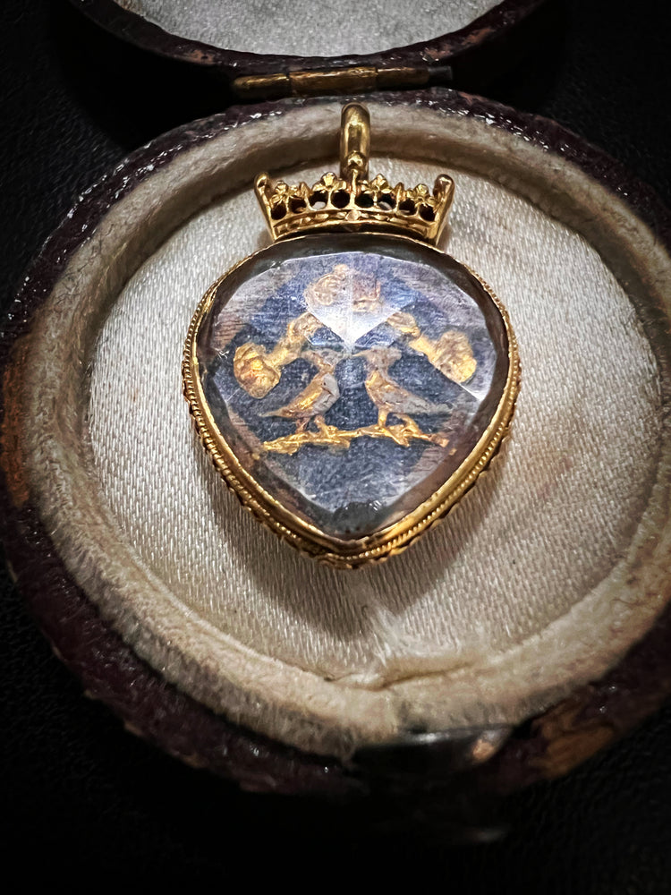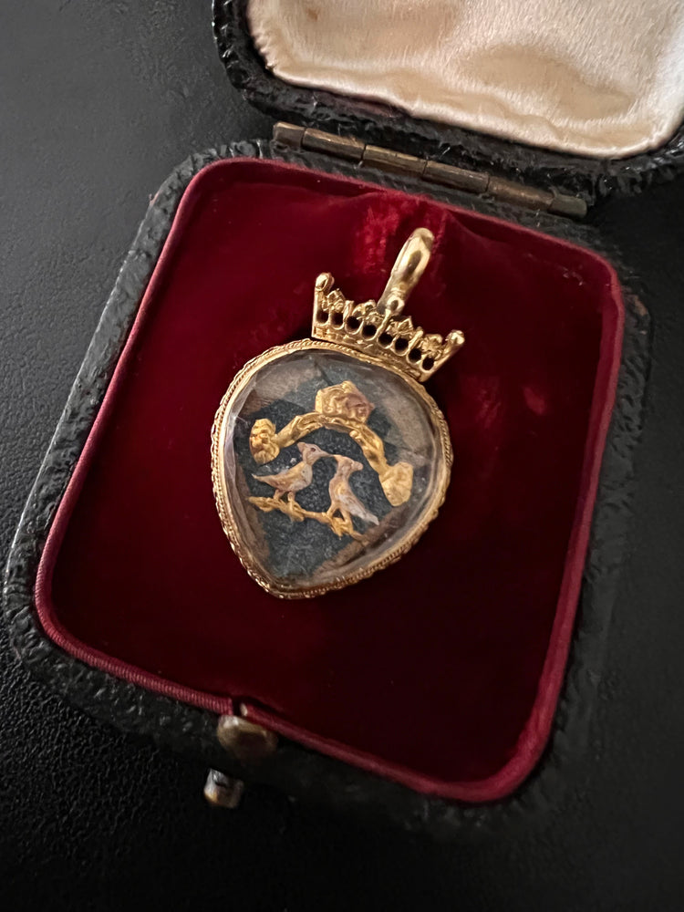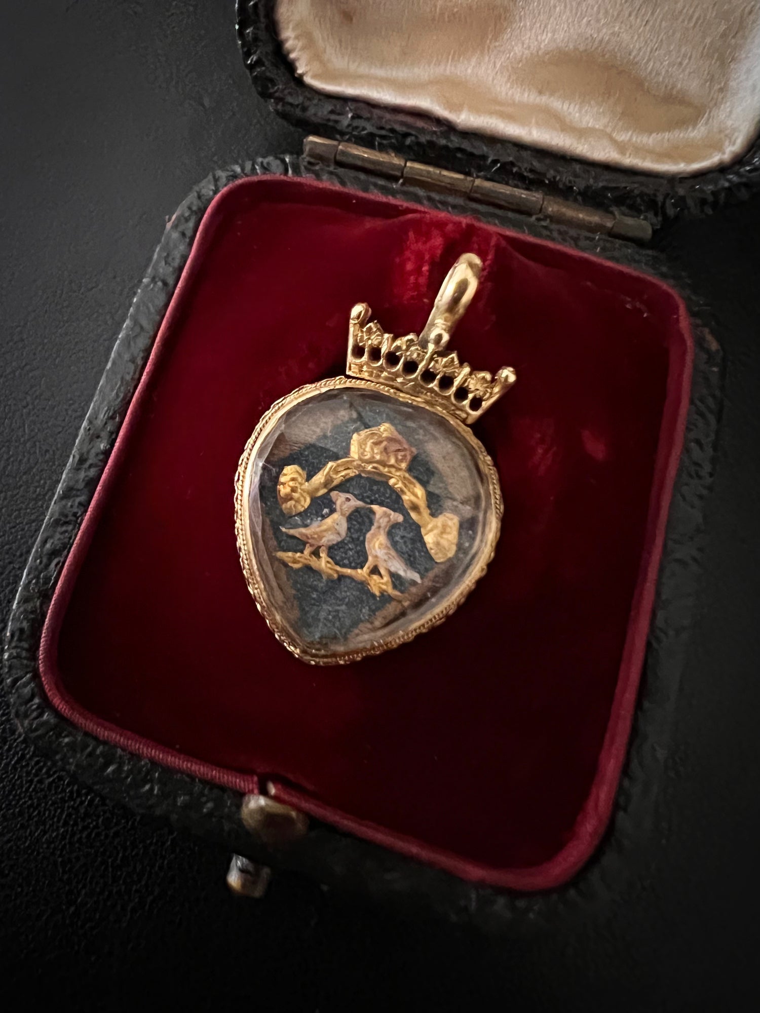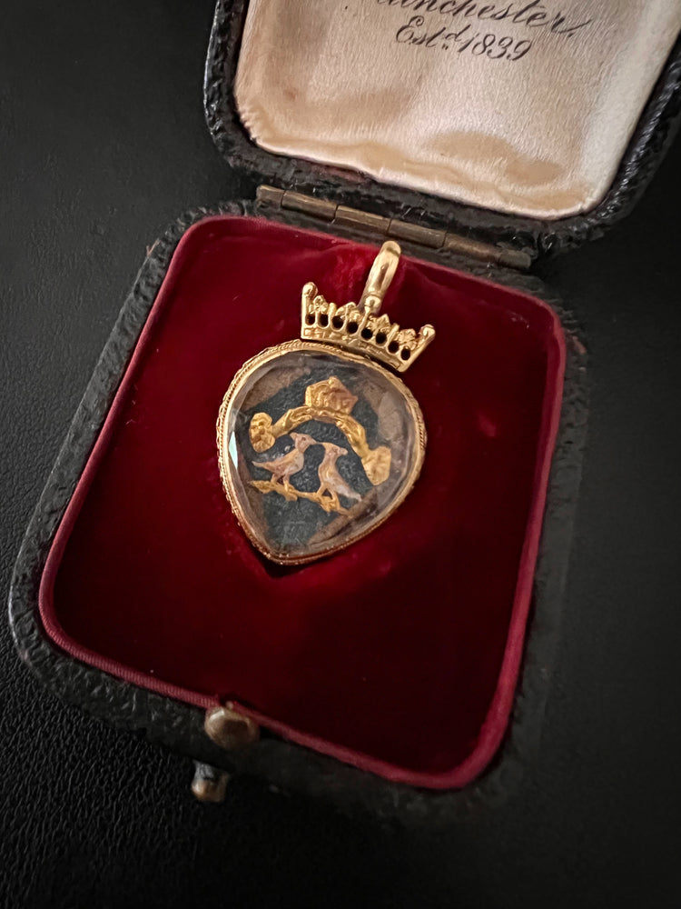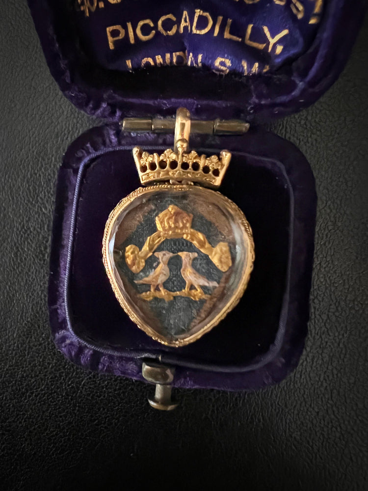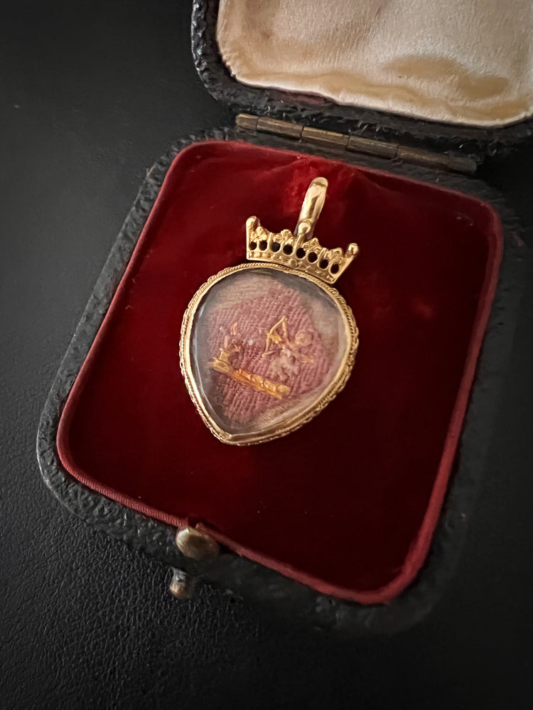 The heart is made of high carat gold with a roped border and topped with a gorgeously modelled crown.