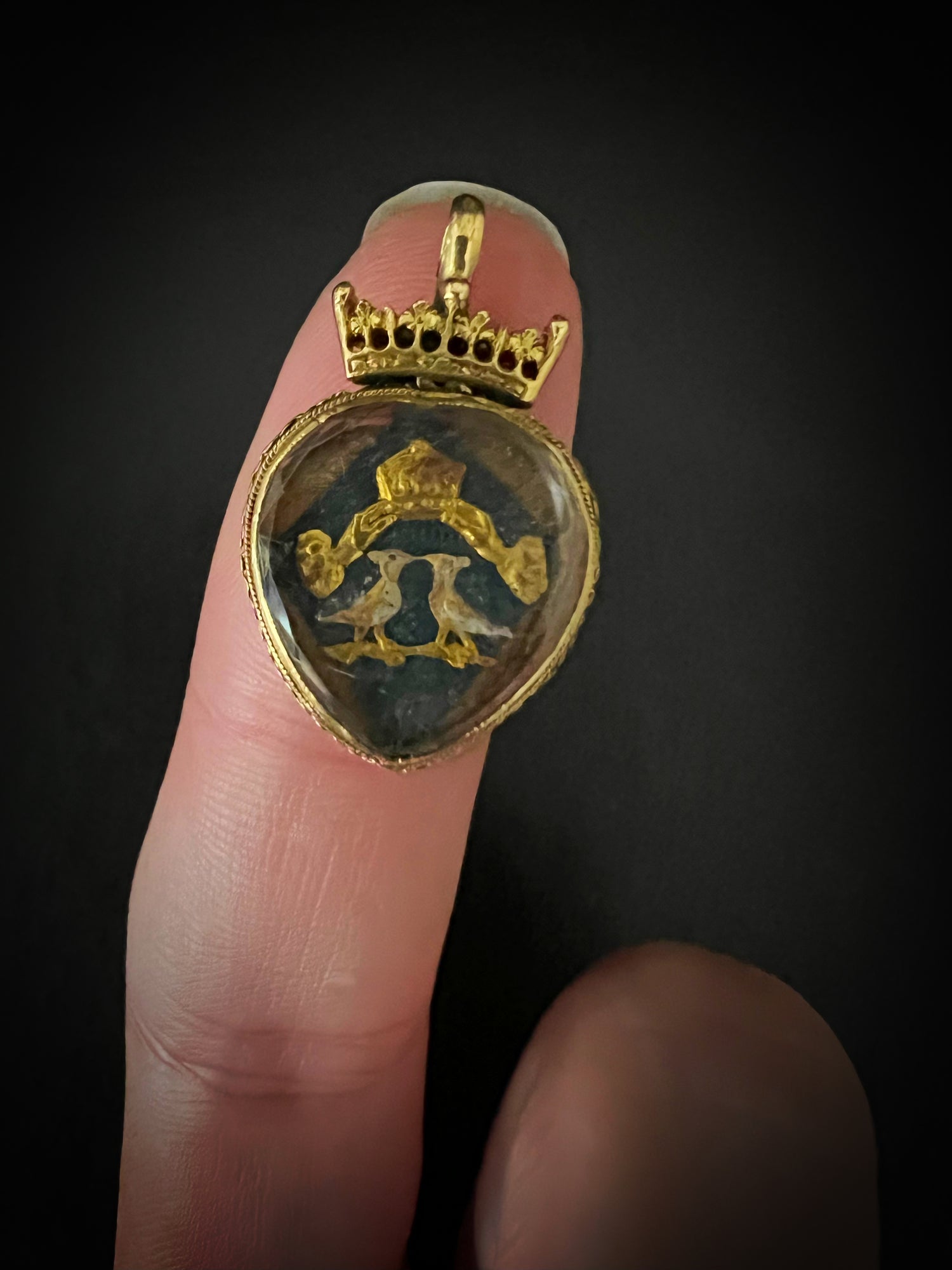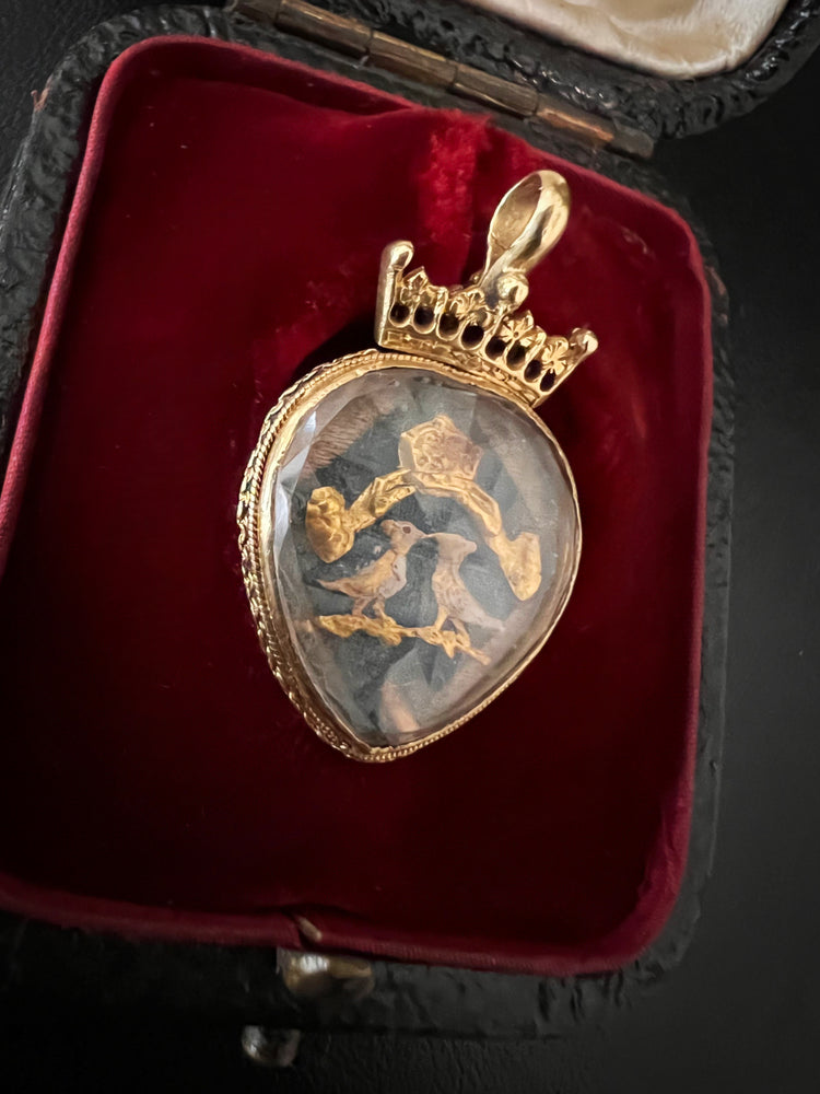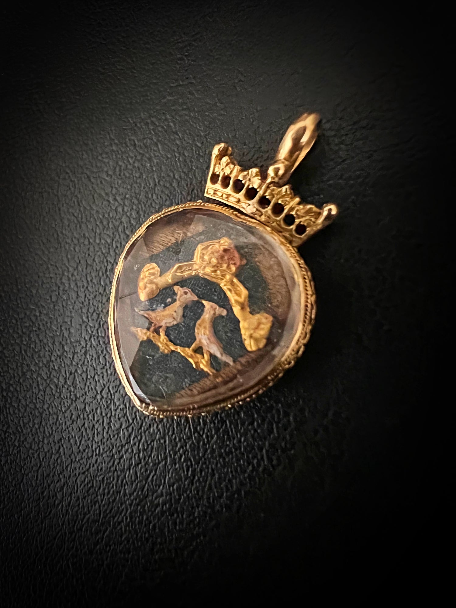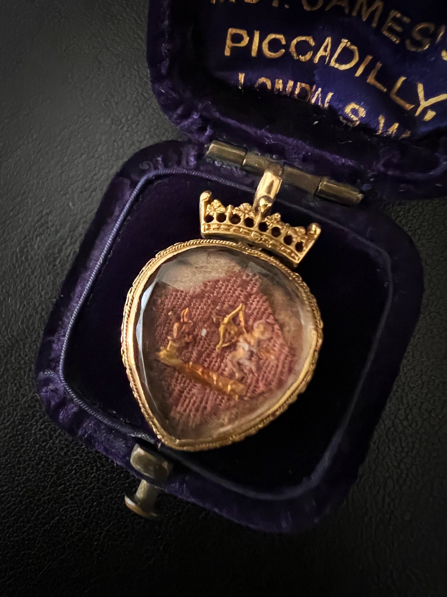 The heart is made of high carat gold with a roped border and topped with a gorgeously modelled crown.