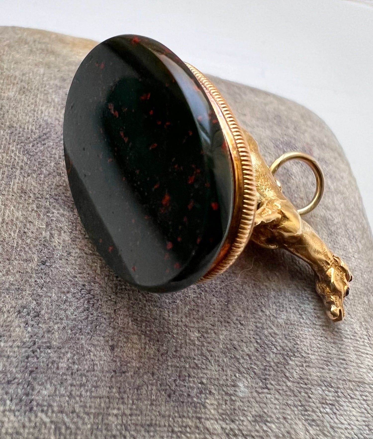 The fob has a plain oval bloodstone set with a lovely ribbed gold border.