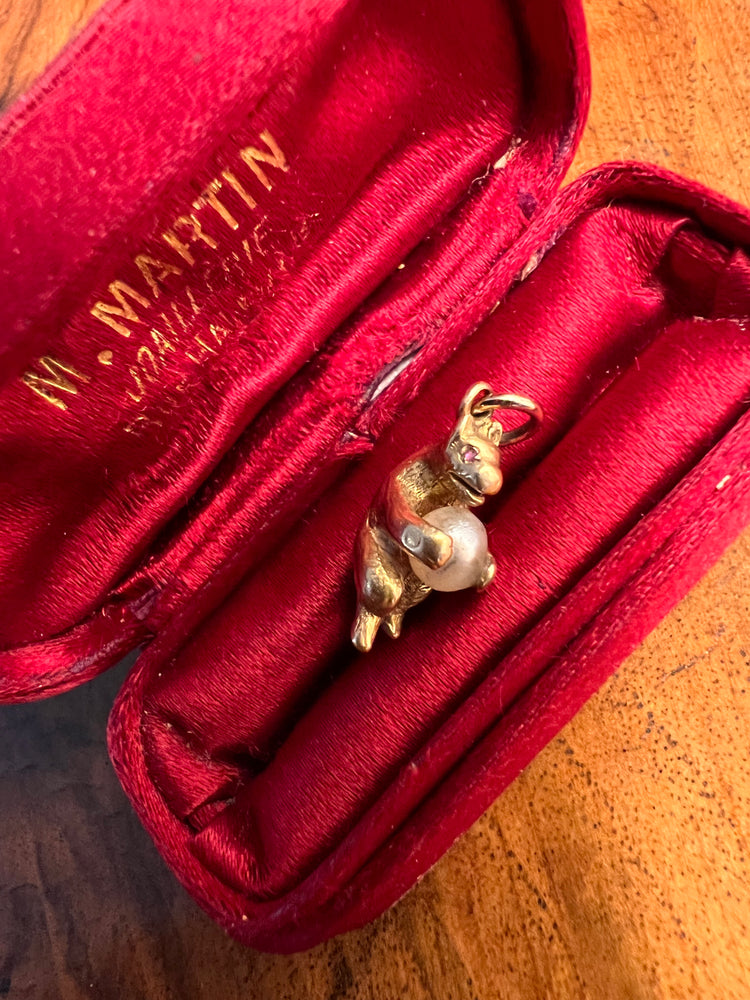 He has a really happy little face, with gem set eyes, and is holding a natural pearl!