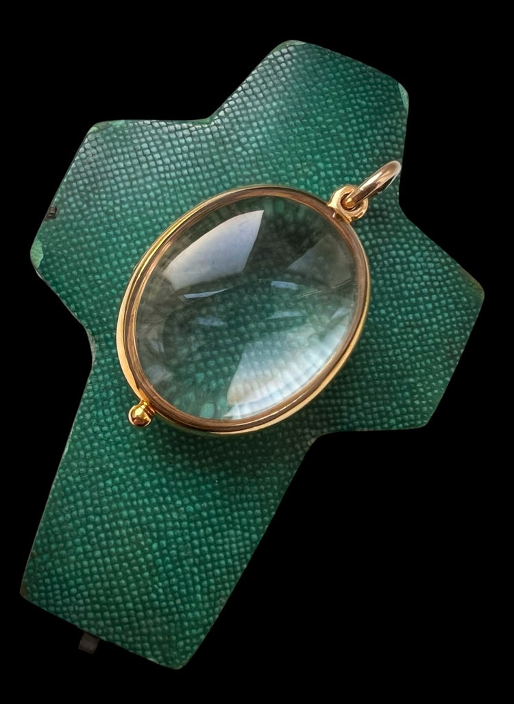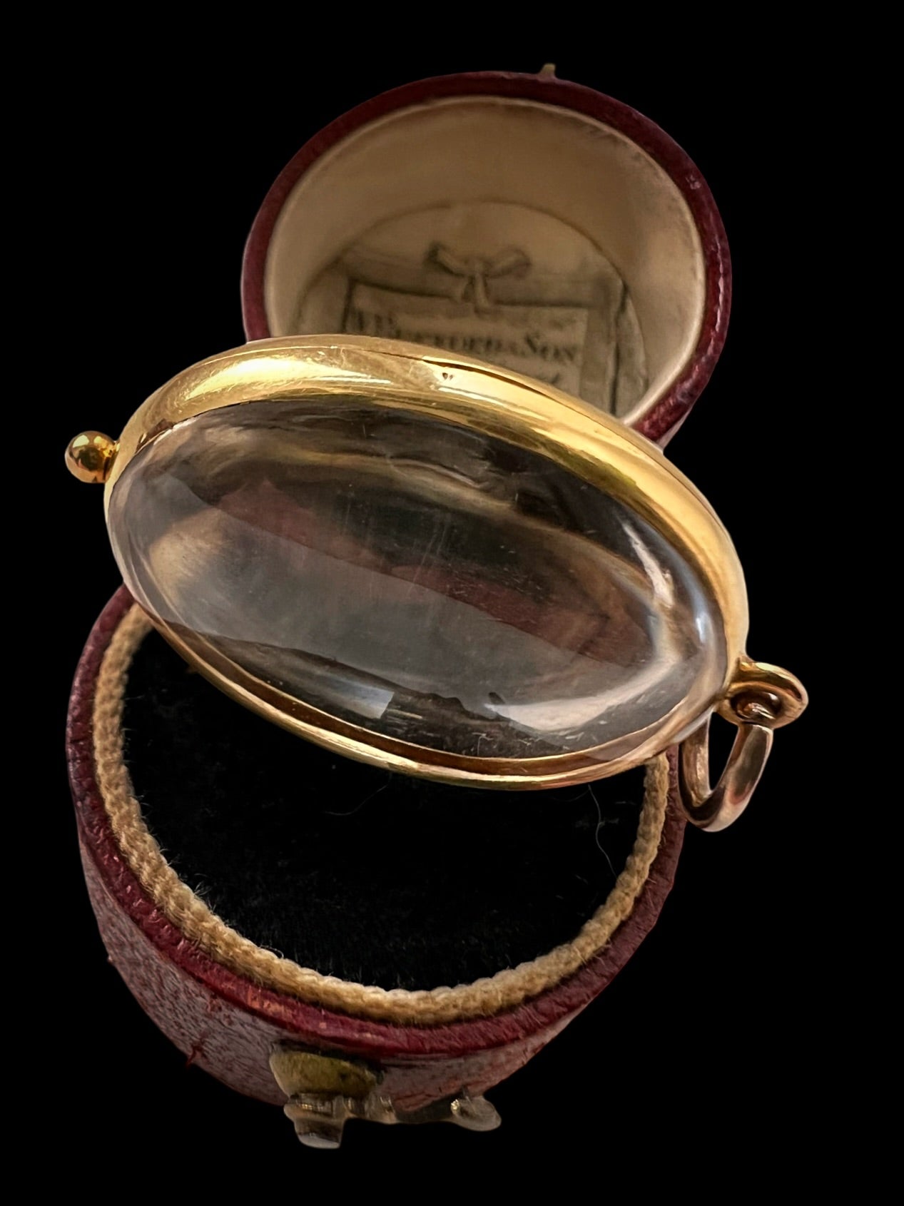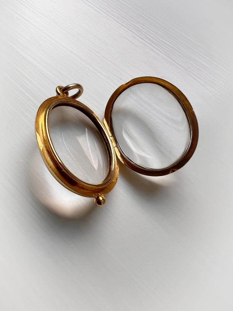 The locket has a lovely chunky gold frame with a ball finial at the base.