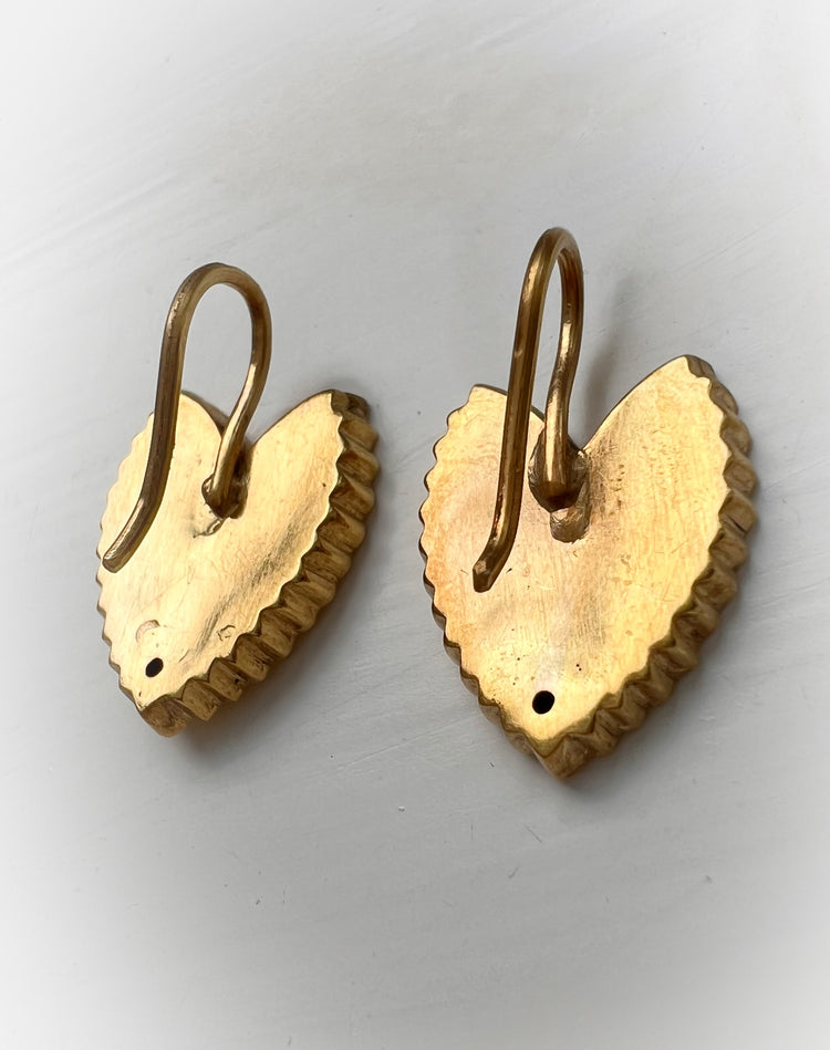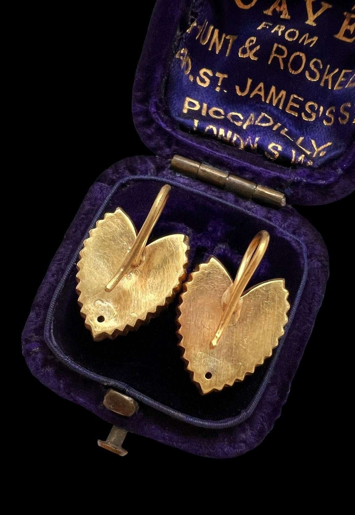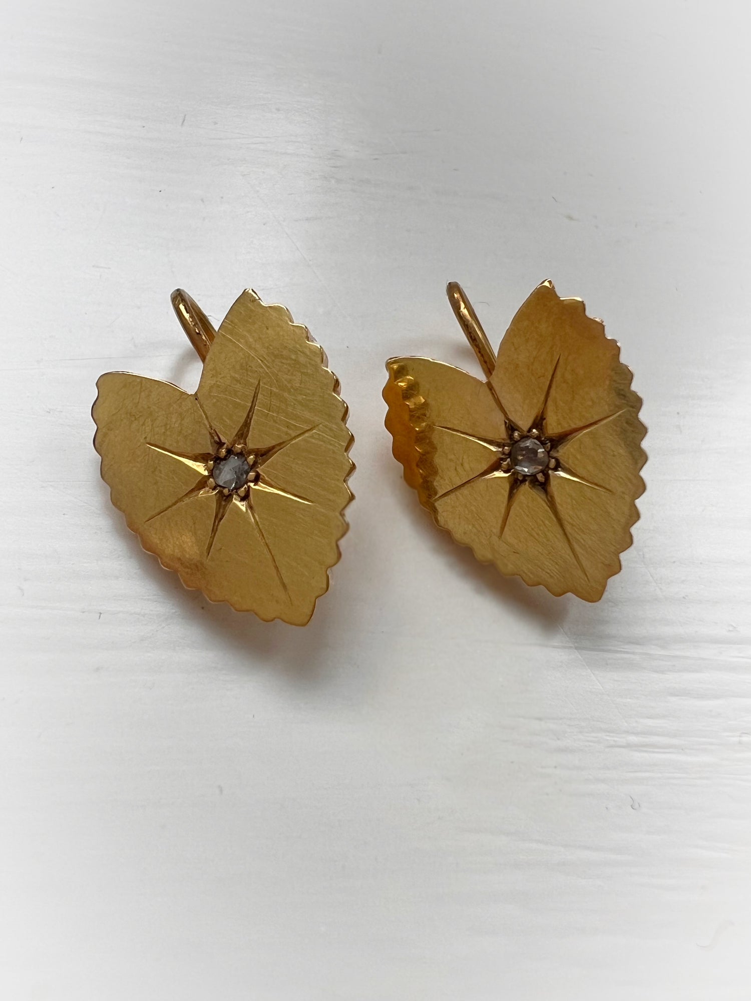 Circa 1890; the earrings are designed as Lilly pad leaves that are a heart shape, with a pretty crimp edging.
