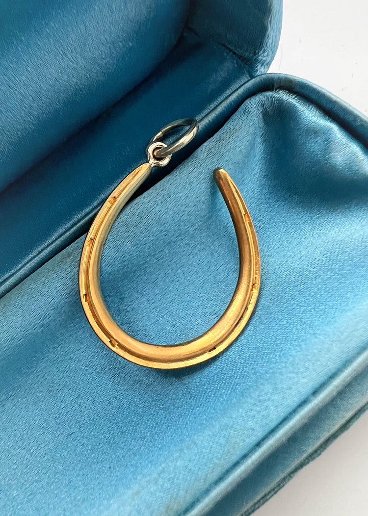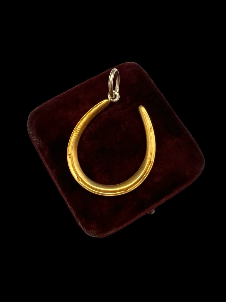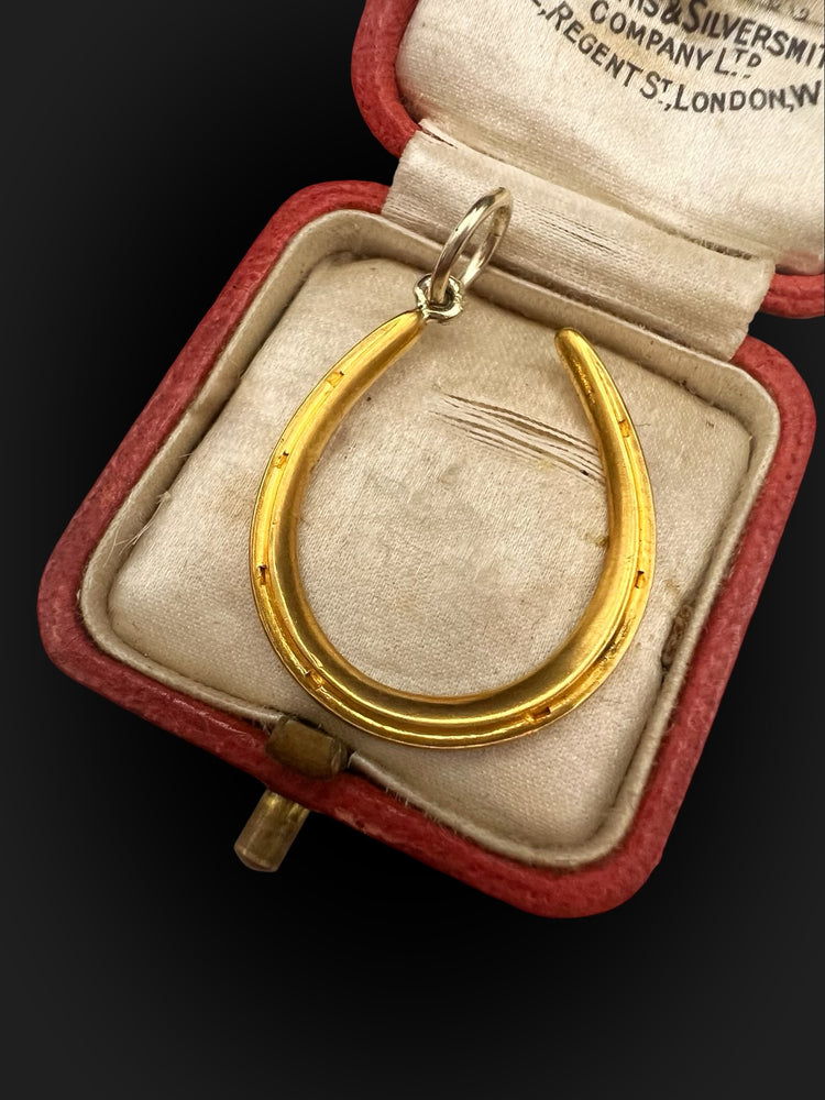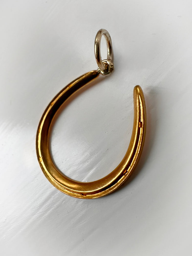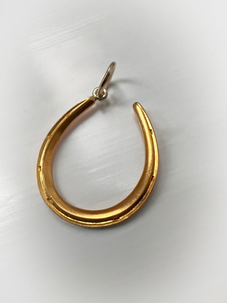 The horseshoe hangs at an angle, from a large 15ct gold jump ring.