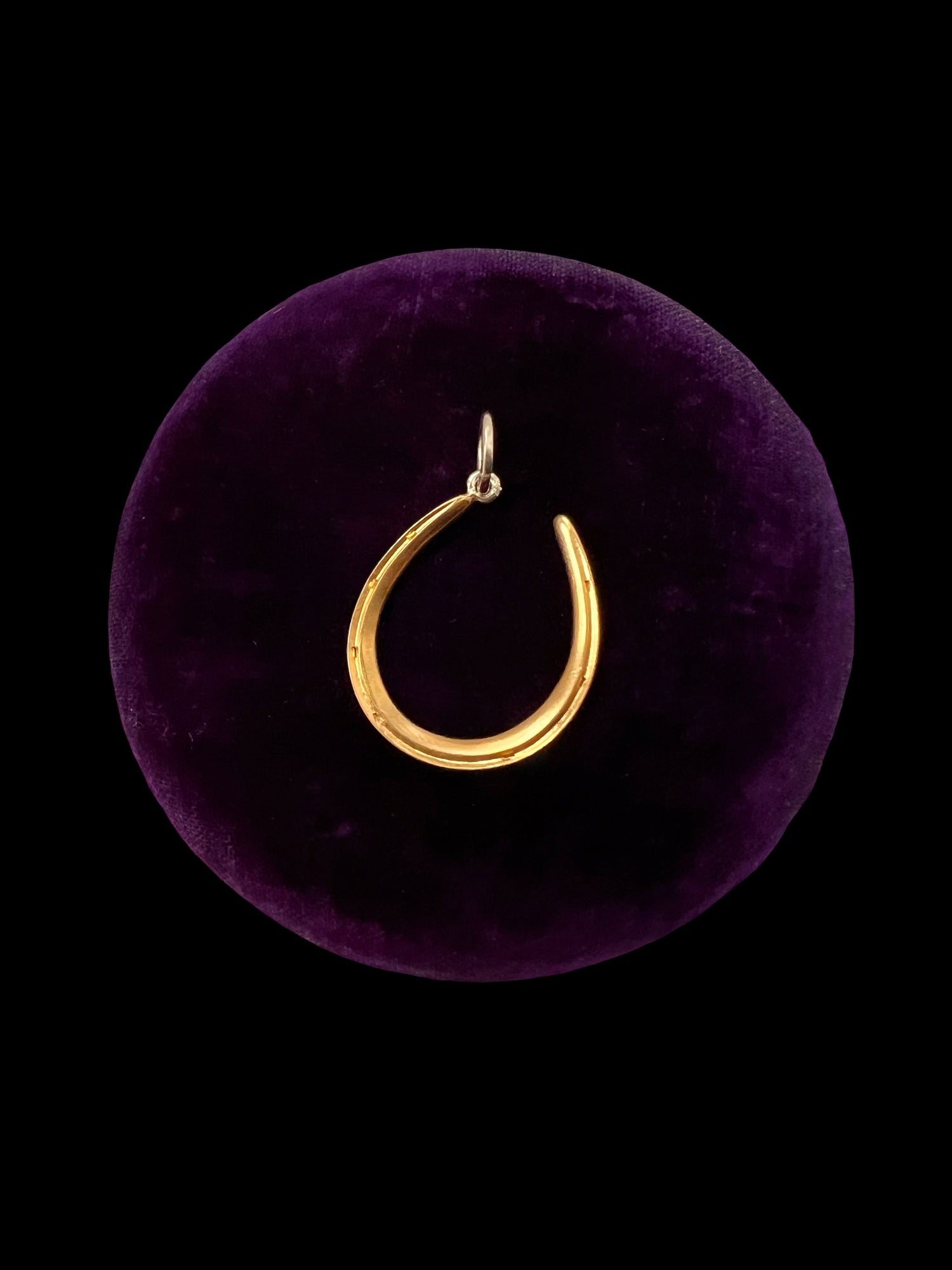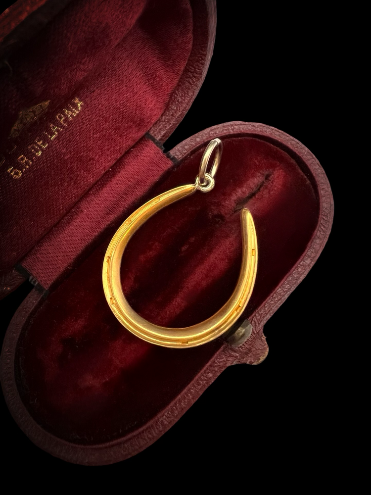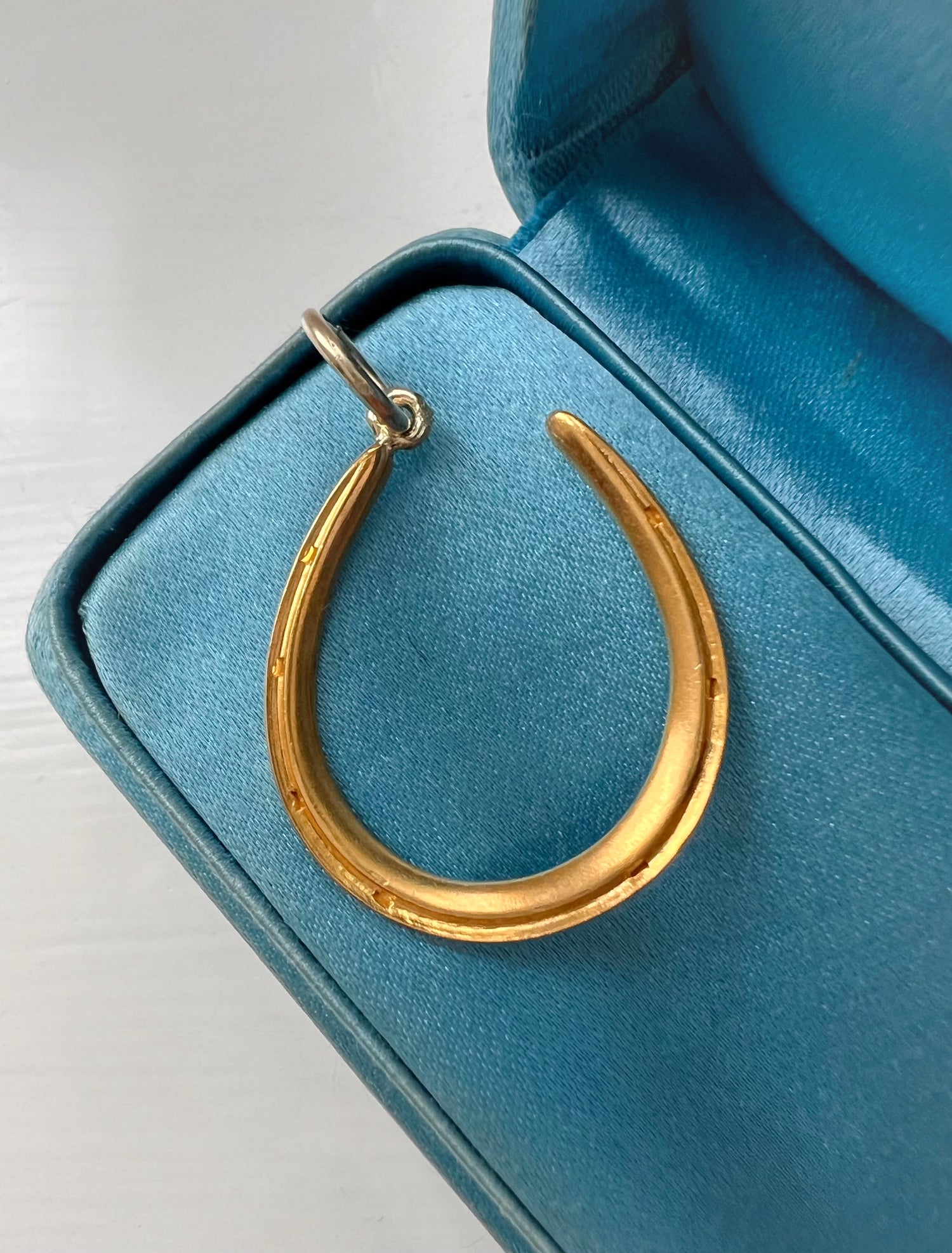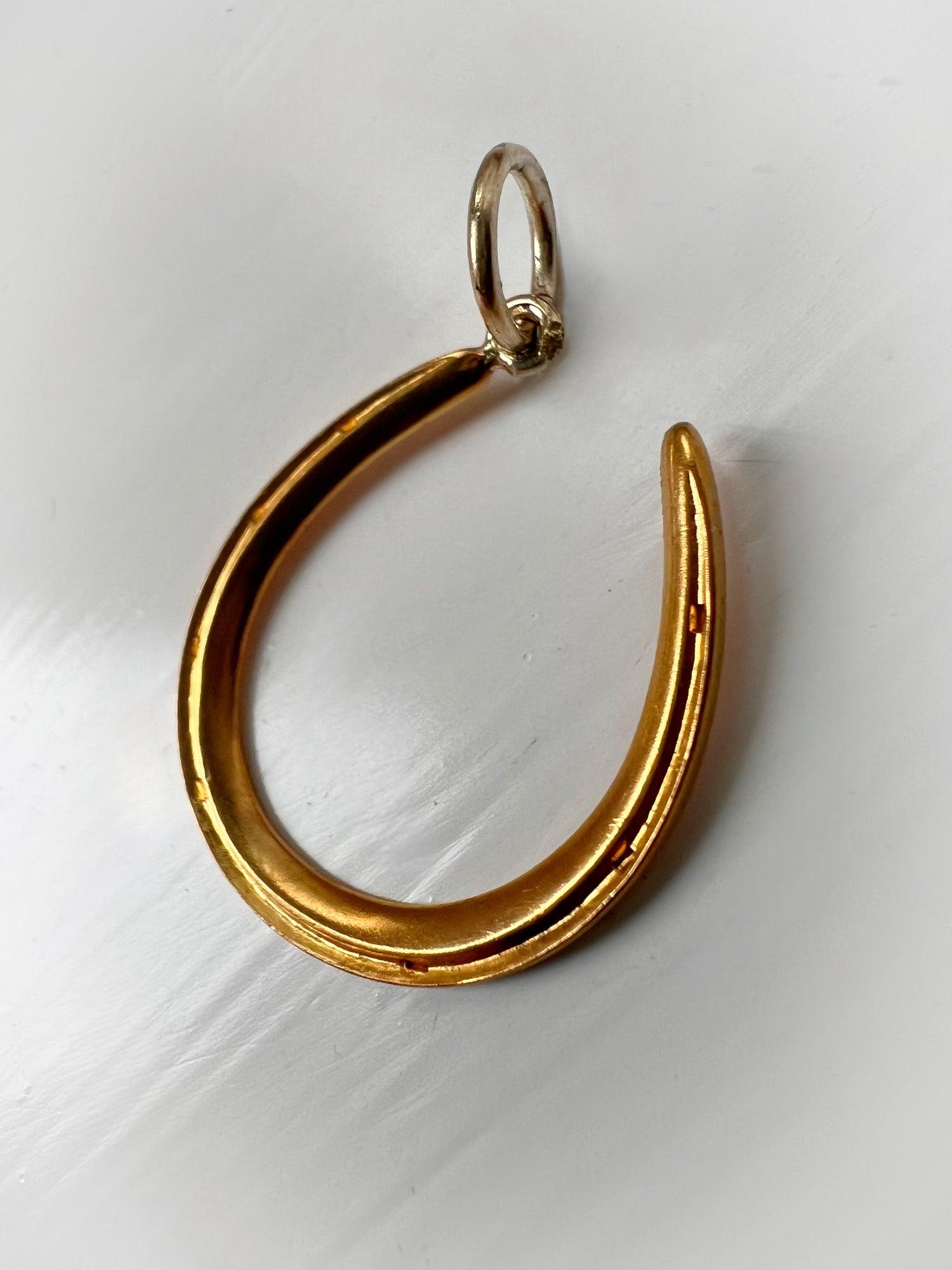 The horseshoe hangs at an angle, from a large 15ct gold jump ring.