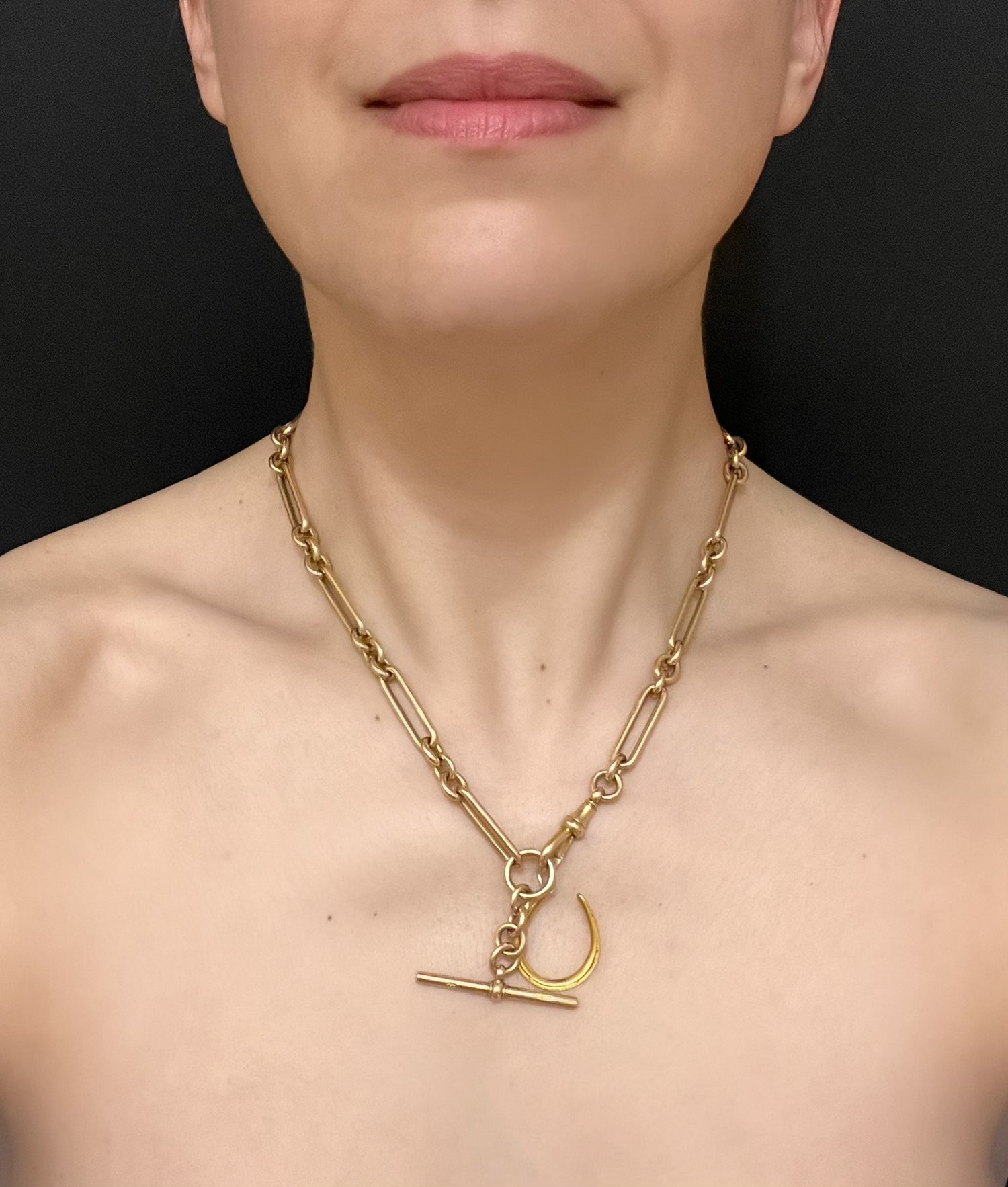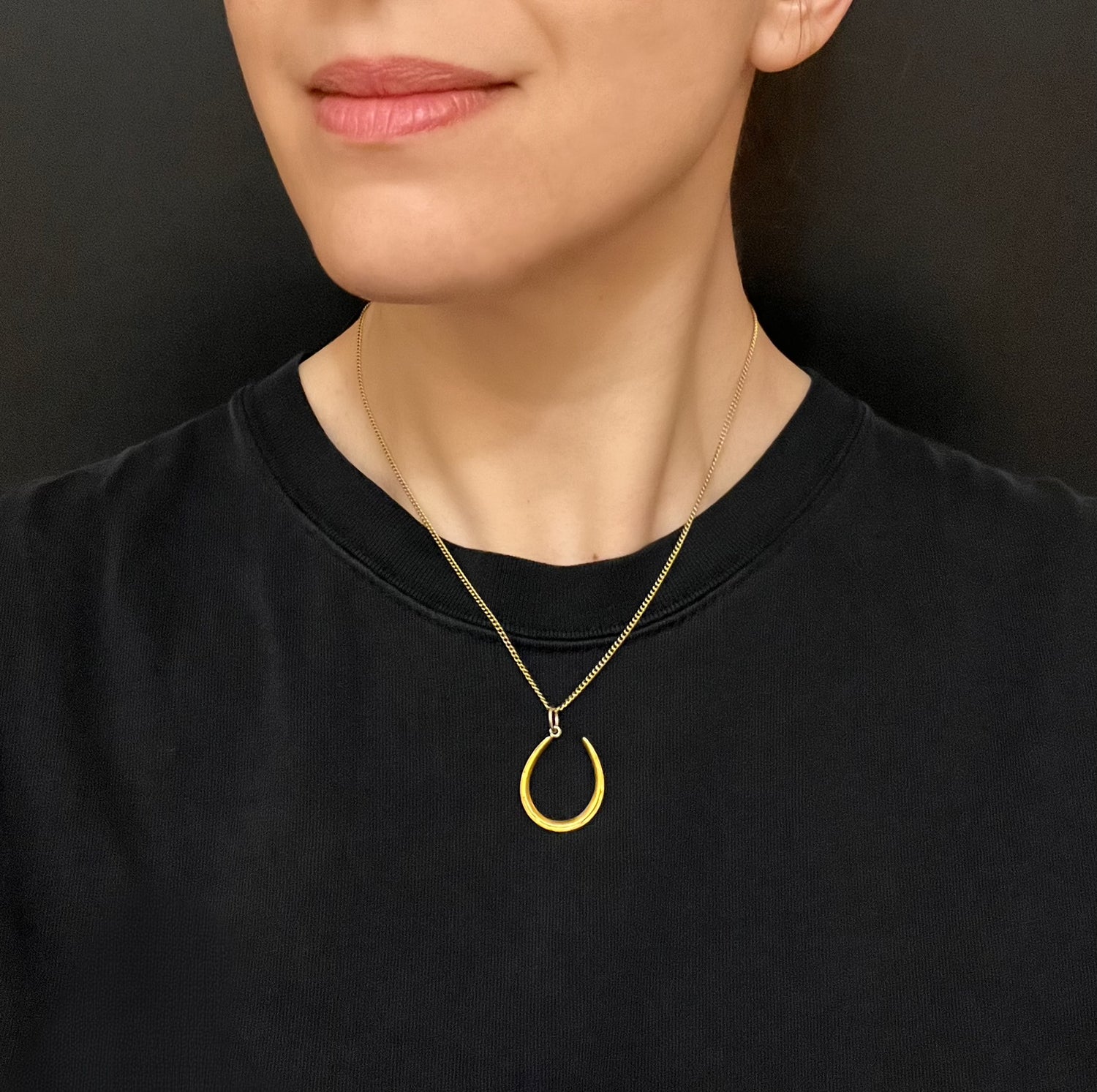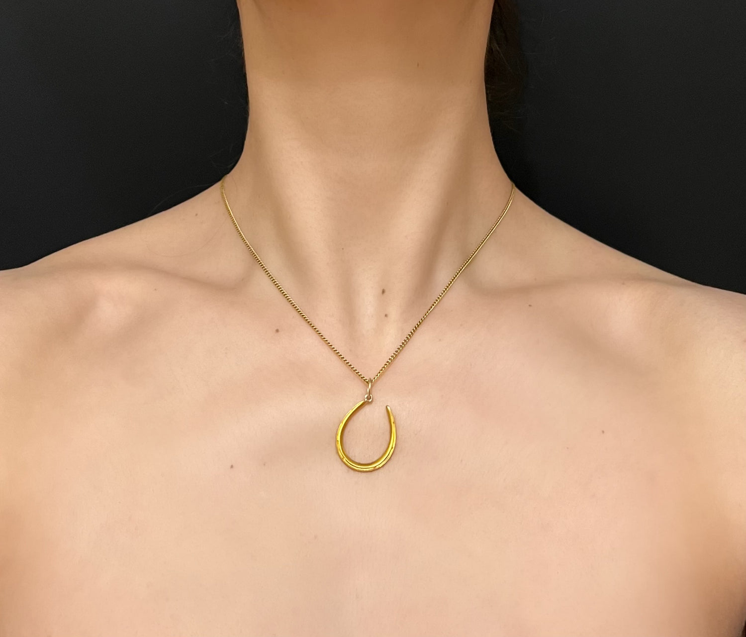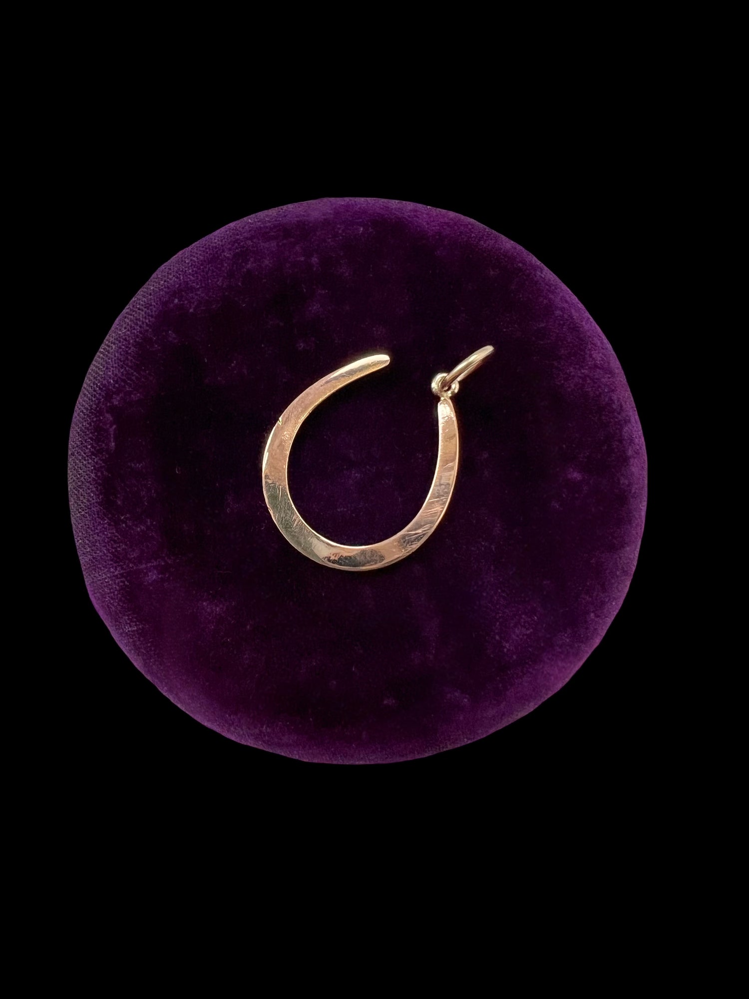 The horseshoe hangs at an angle, from a large 15ct gold jump ring.