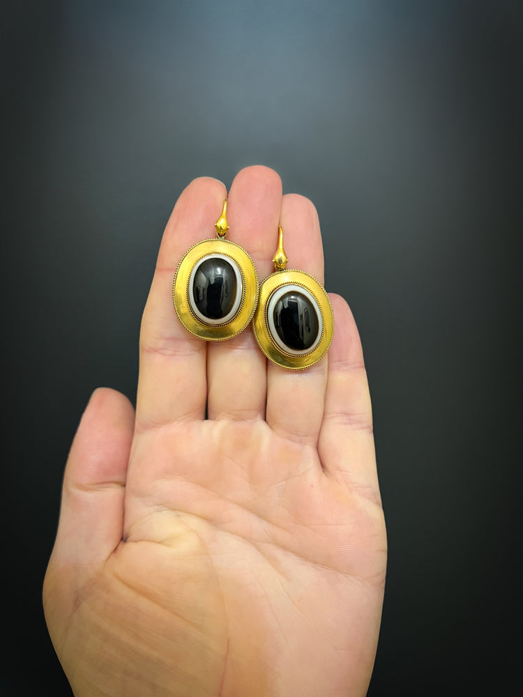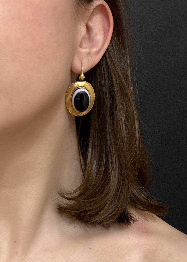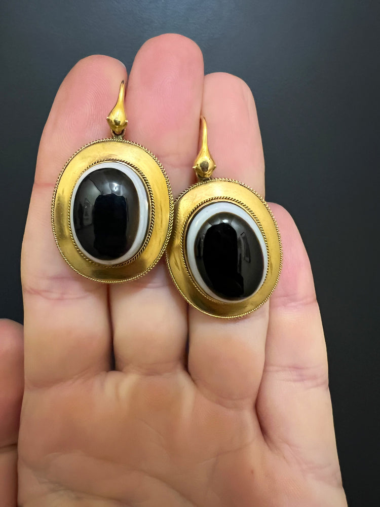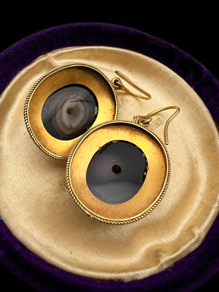 VICTORIAN 15CT GOLD SNAKE & BULLSEYE AGATE EARRINGS