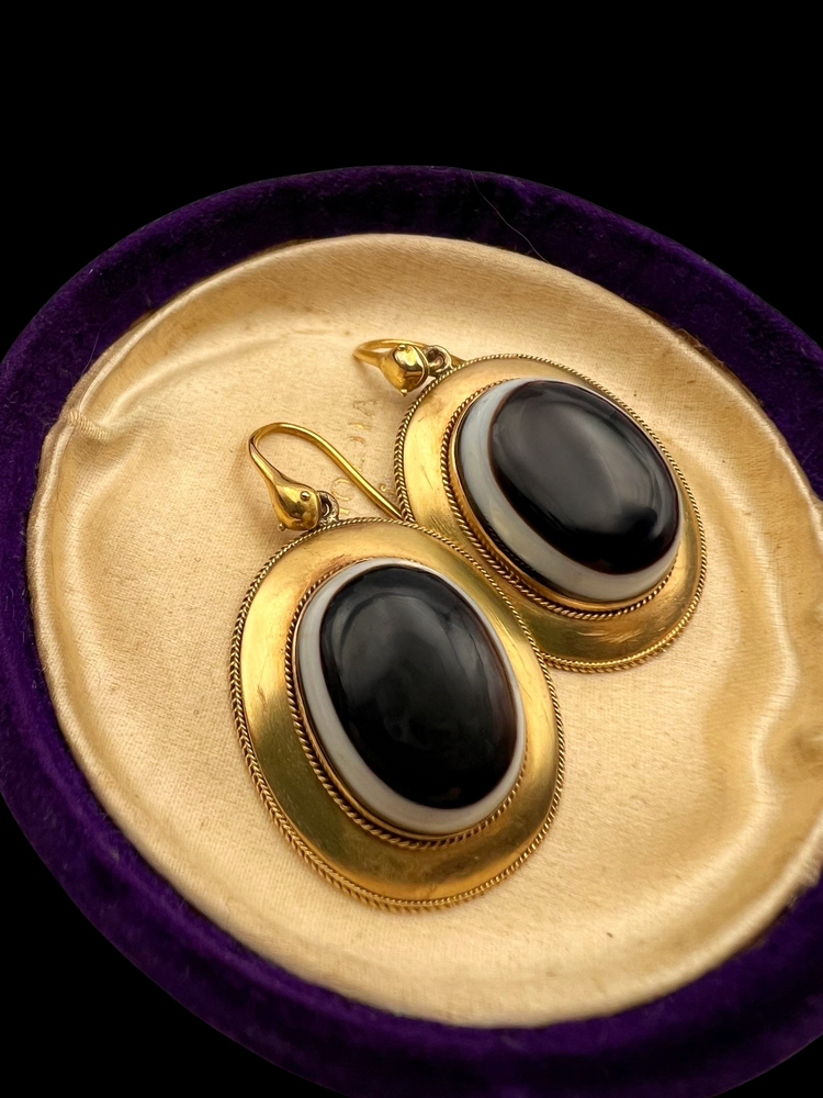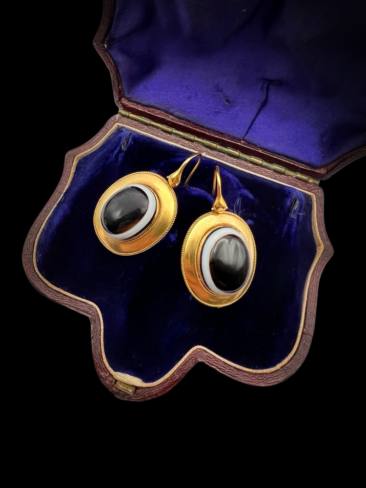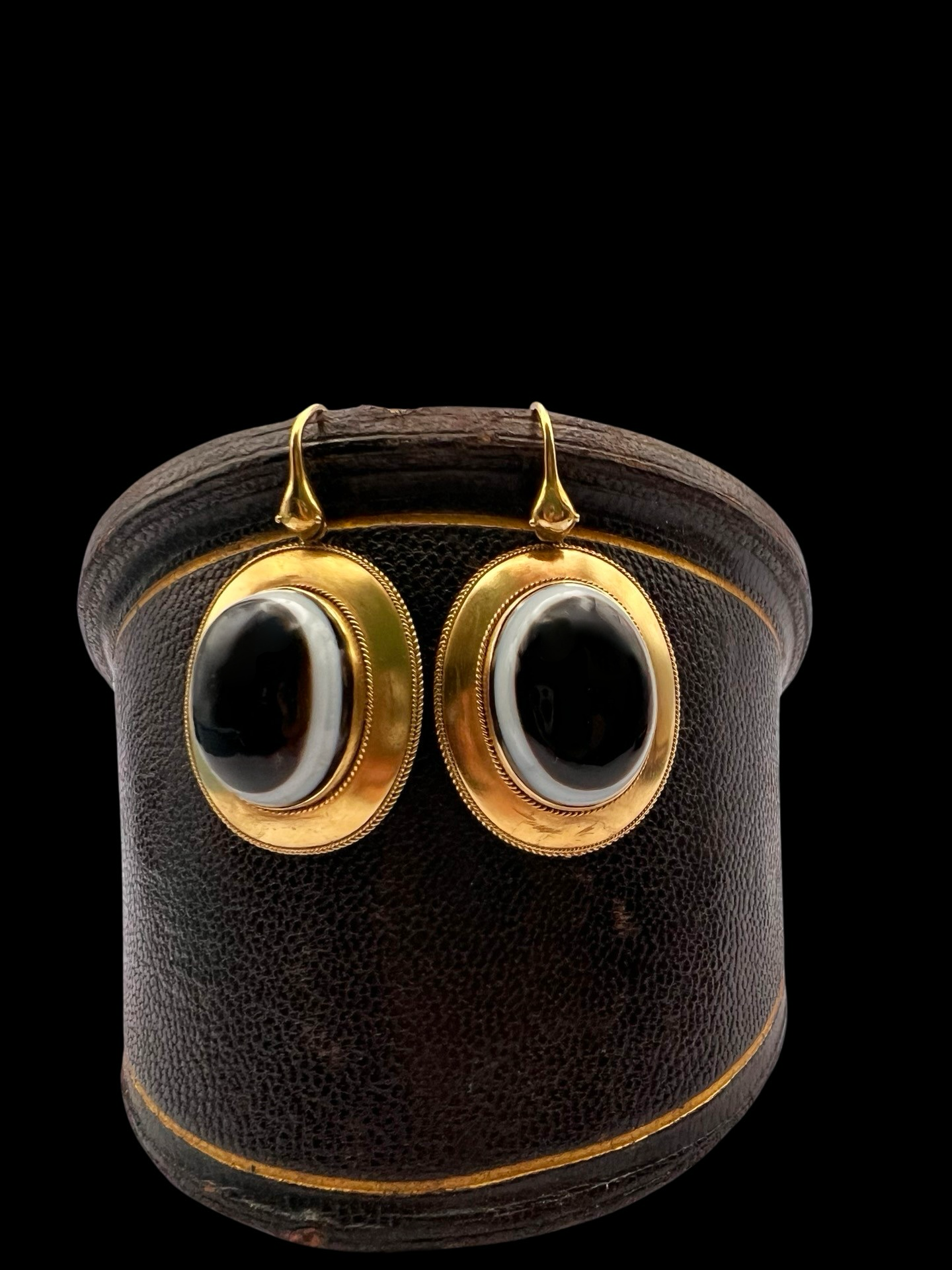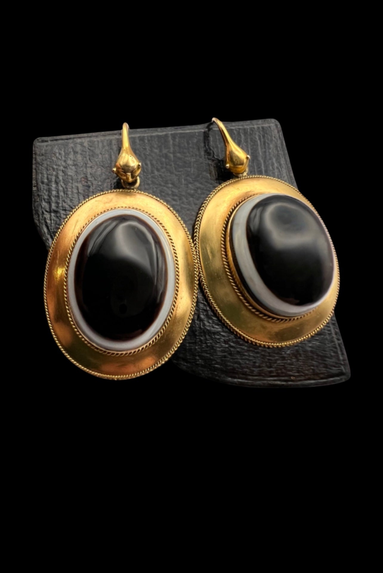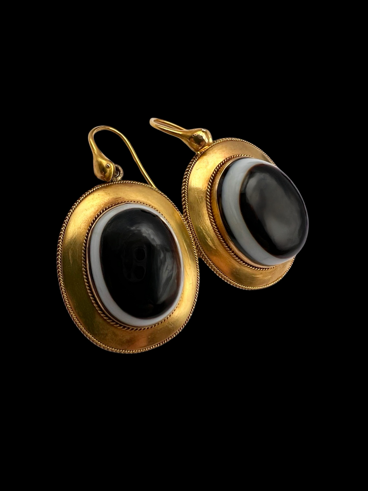 A wonderful pair of Victorian 15ct gold snake & bullseye agate earrings.