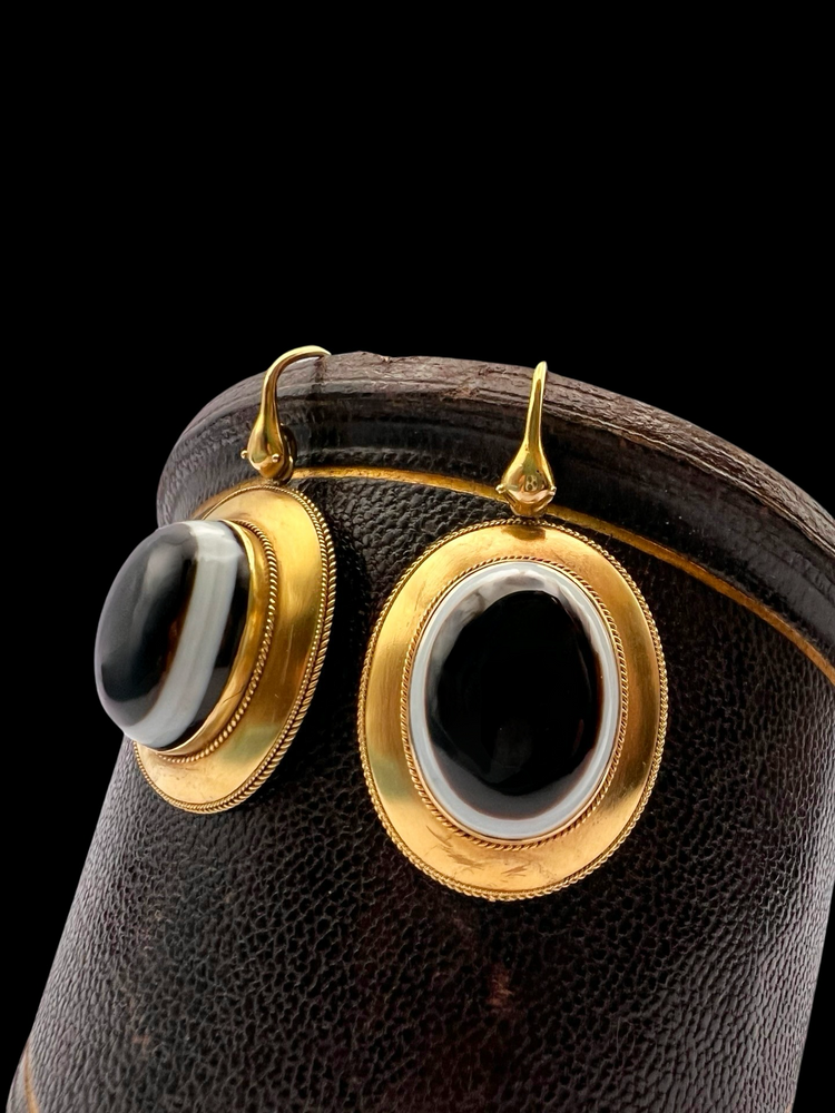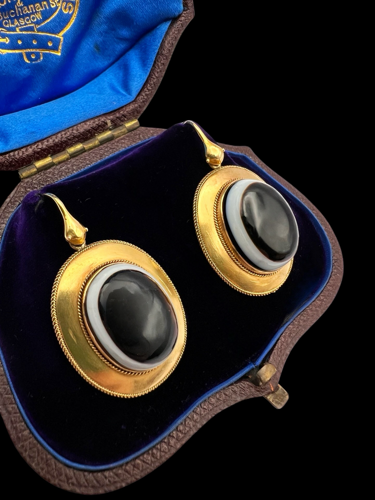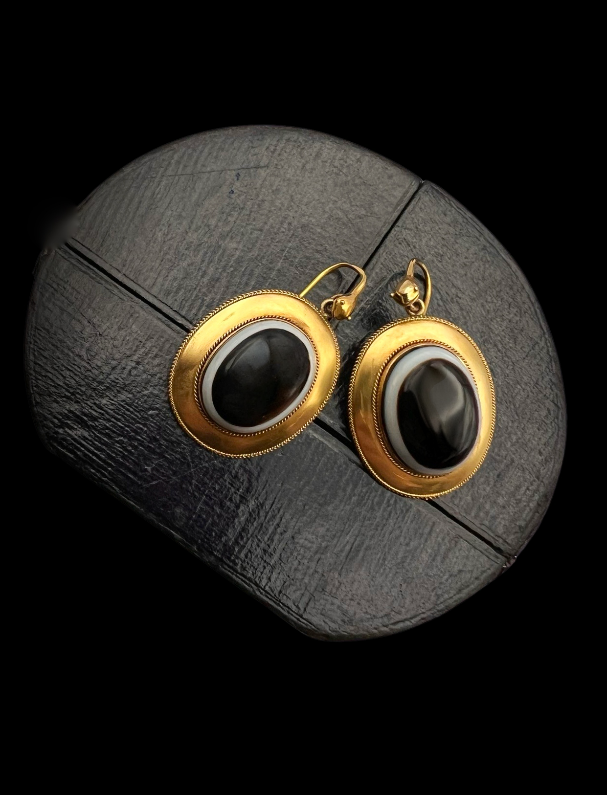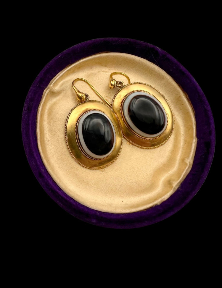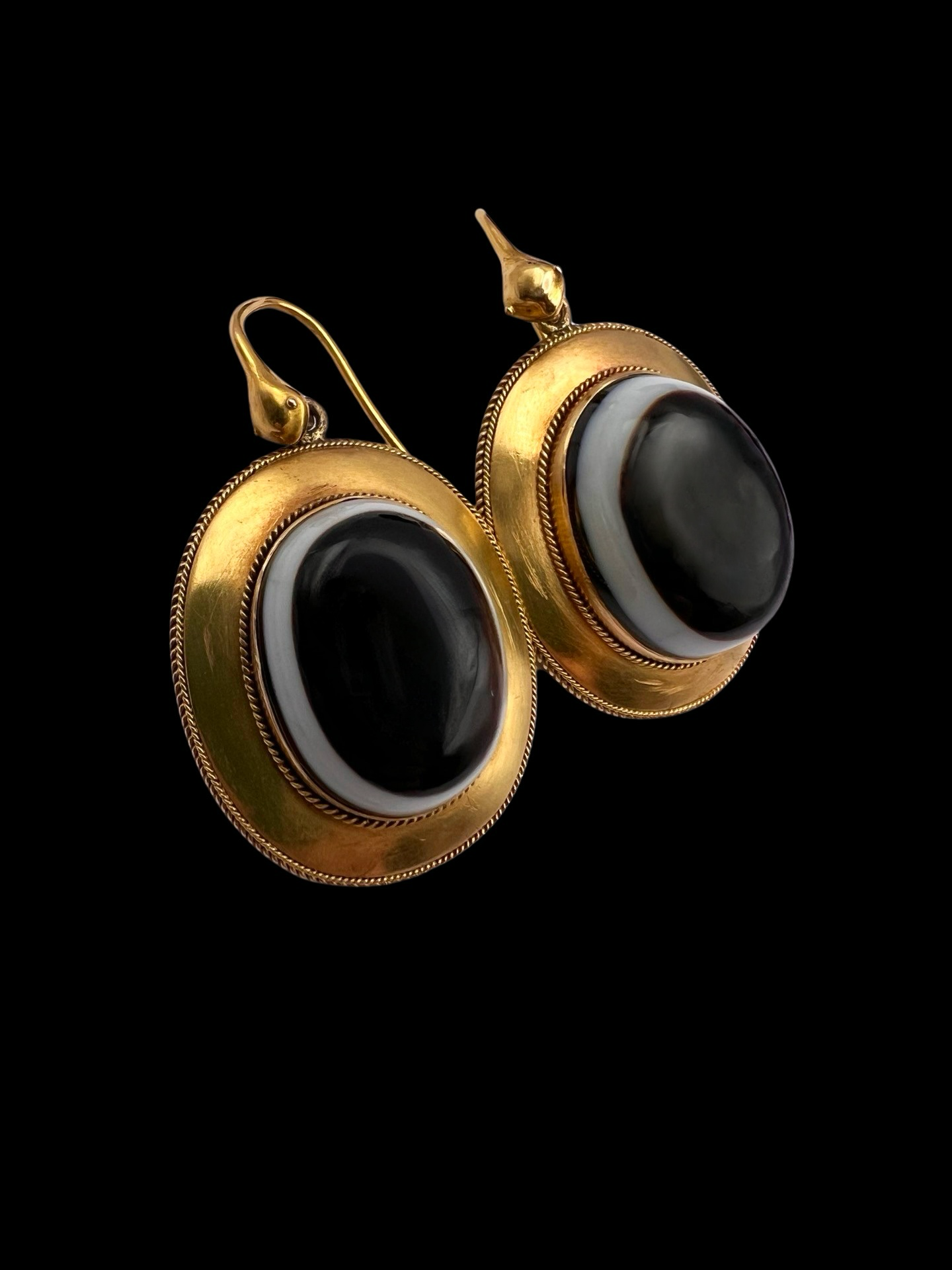 A wonderful pair of Victorian 15ct gold snake & bullseye agate earrings.
