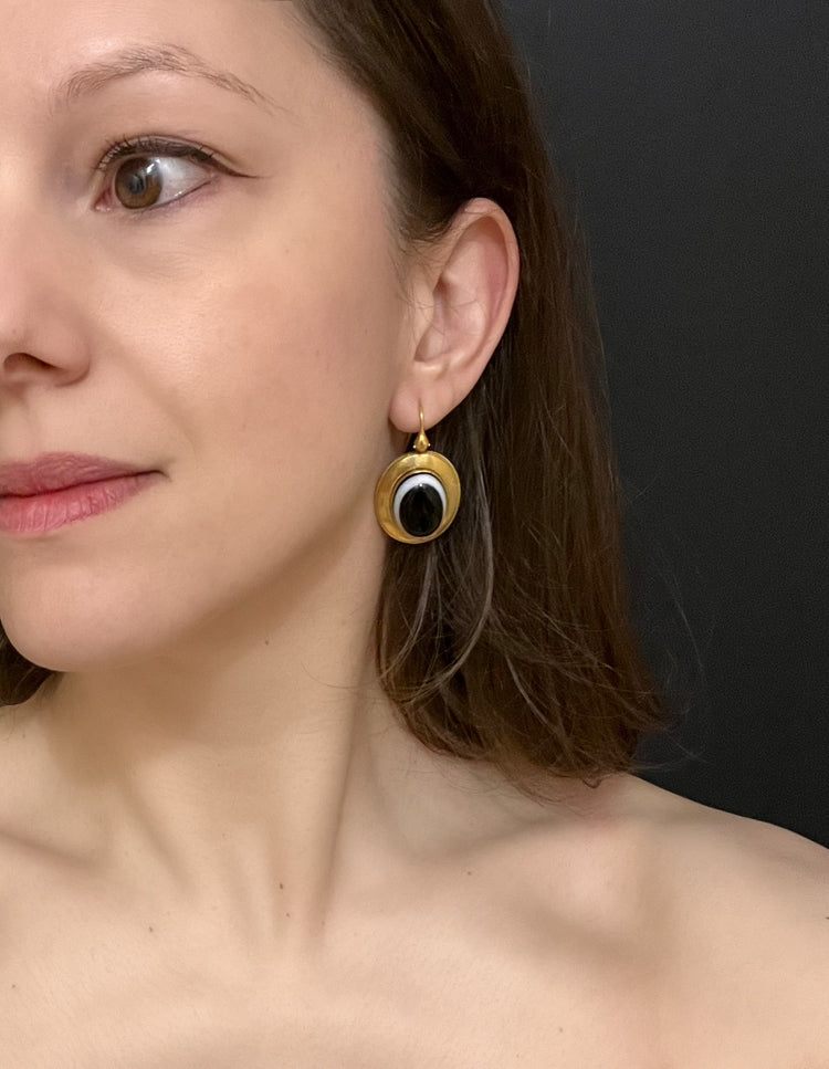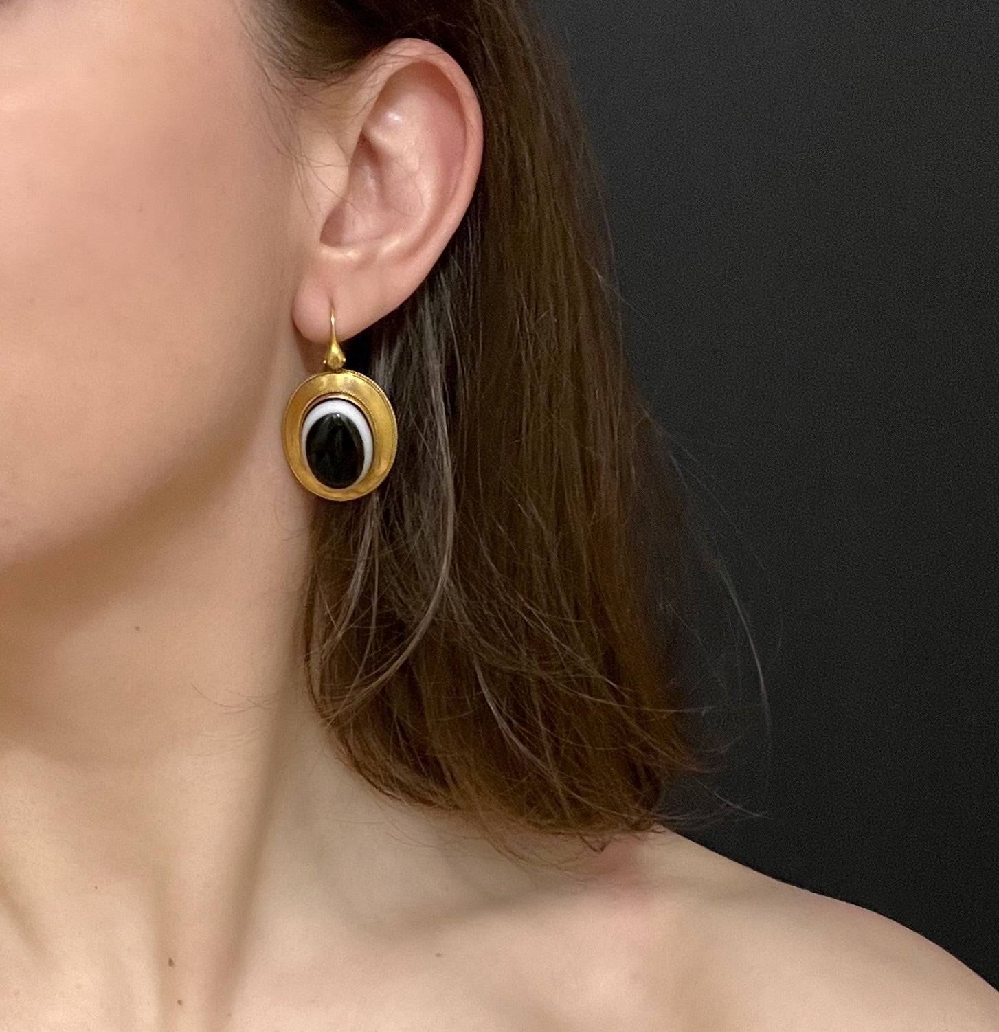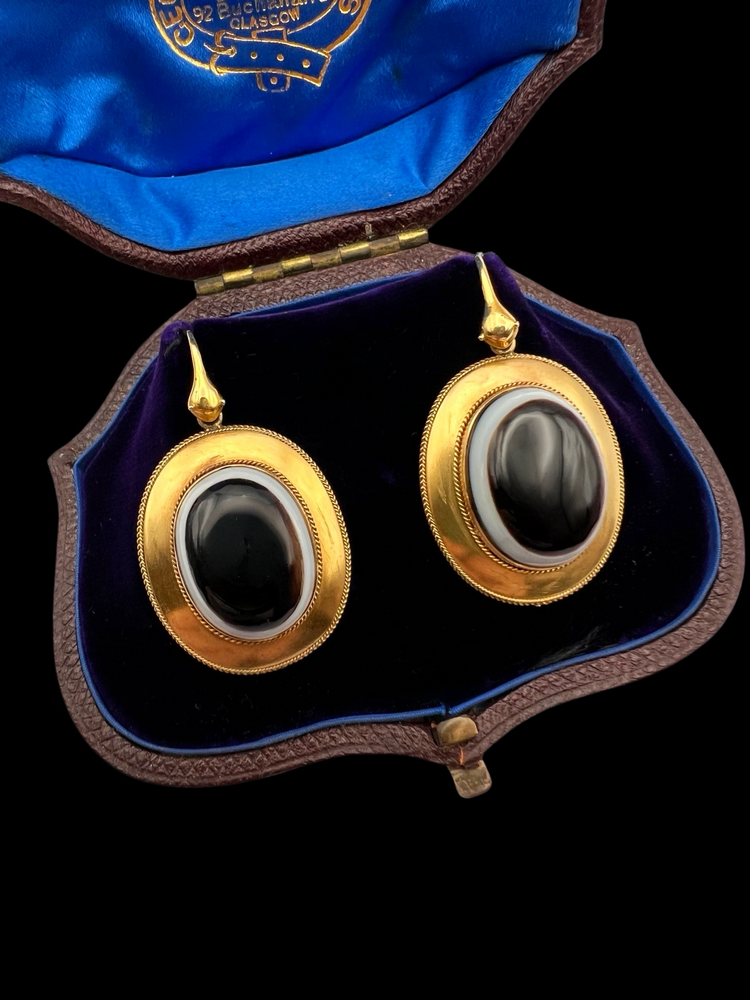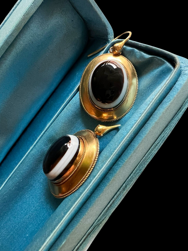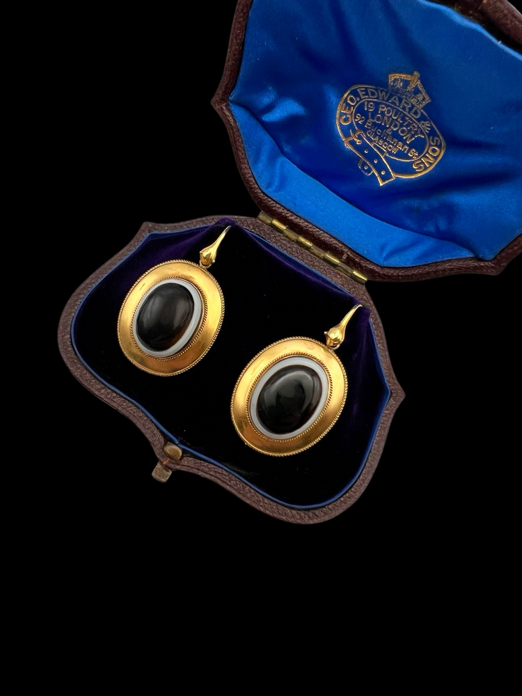 A wonderful pair of Victorian 15ct gold snake & bullseye agate earrings.