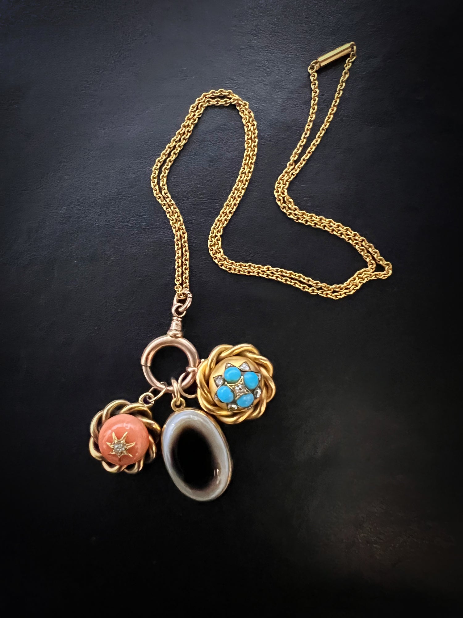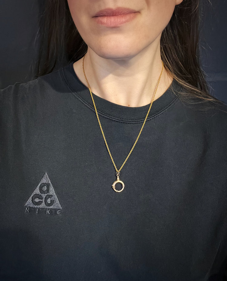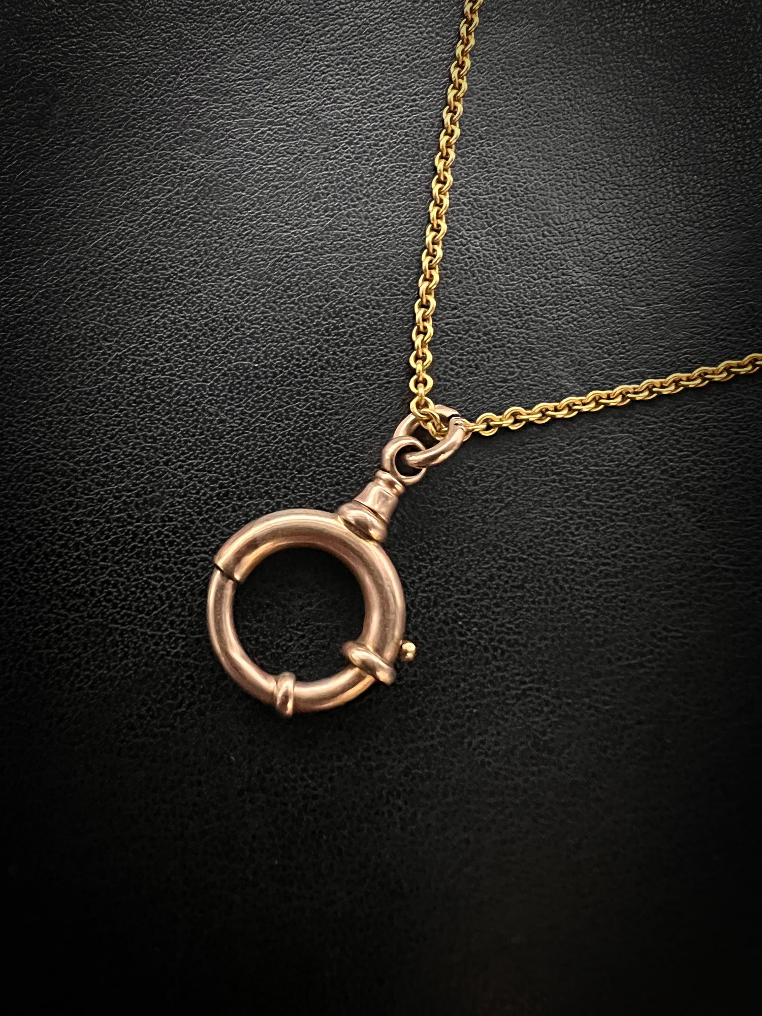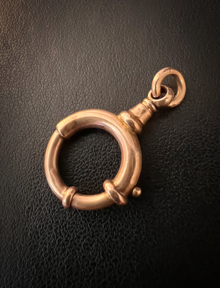 This design is rare as the large spring bolt has the neck of a dog clip, which looks great as a bail to hang charms from.