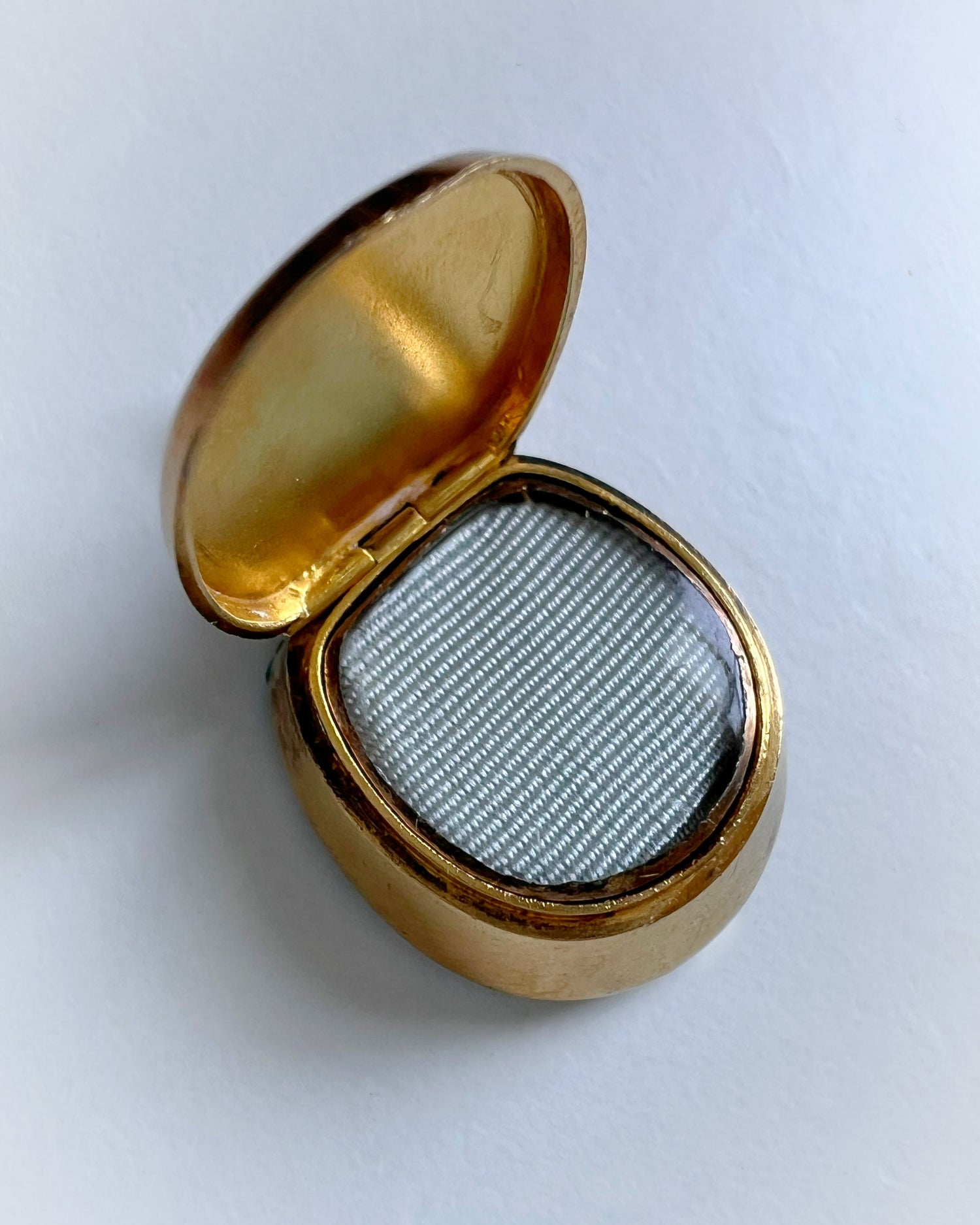 The pendant opens to reveal the original domed glass locket which has duck egg blue grosgrain inside.