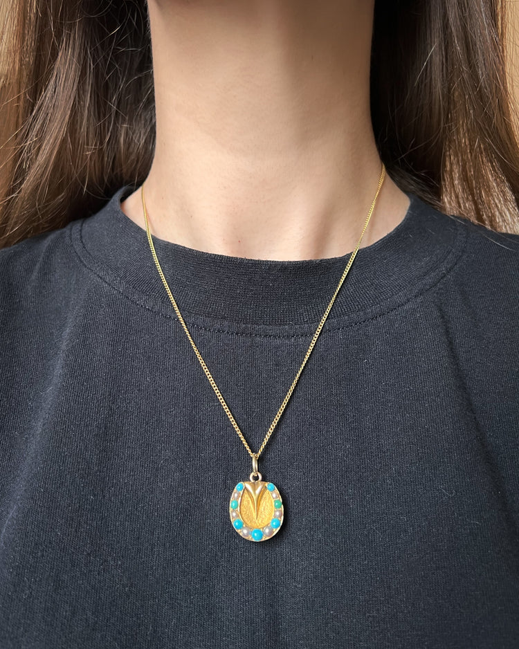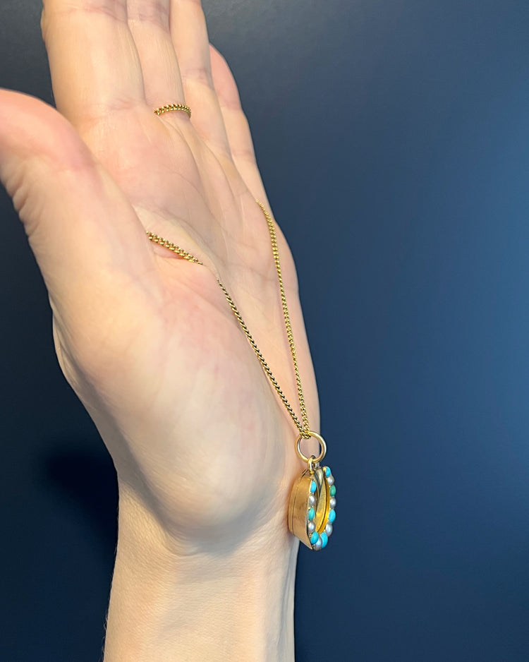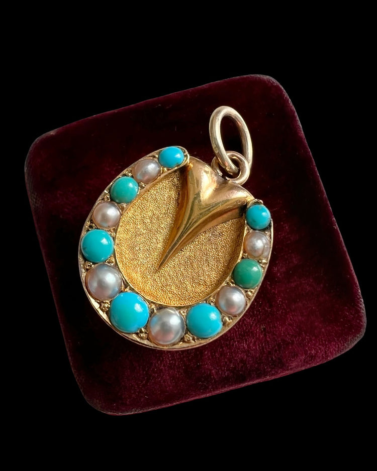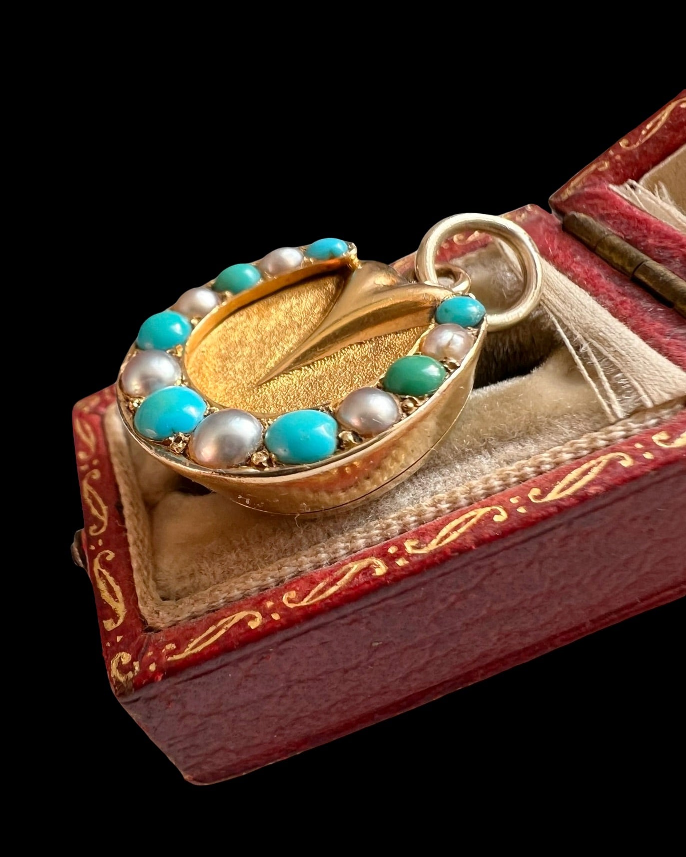 A super cool Victorian Horse Hoof locket set with turquoise and pearl.