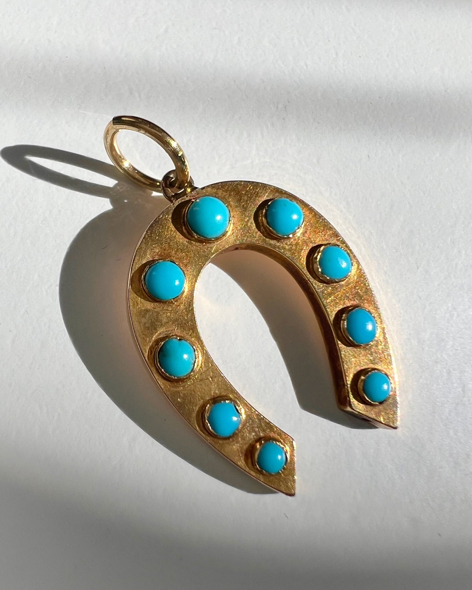 The large scale horseshoe is studded with nine graduated cabochon turquoise stones that look stunning against the bright yellow gold.