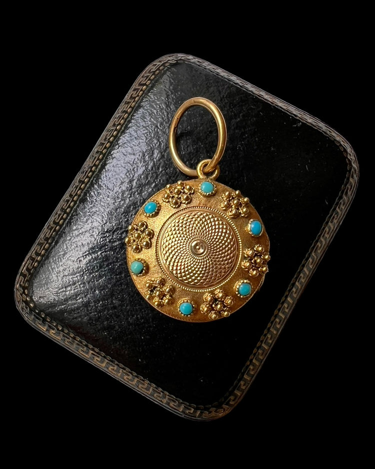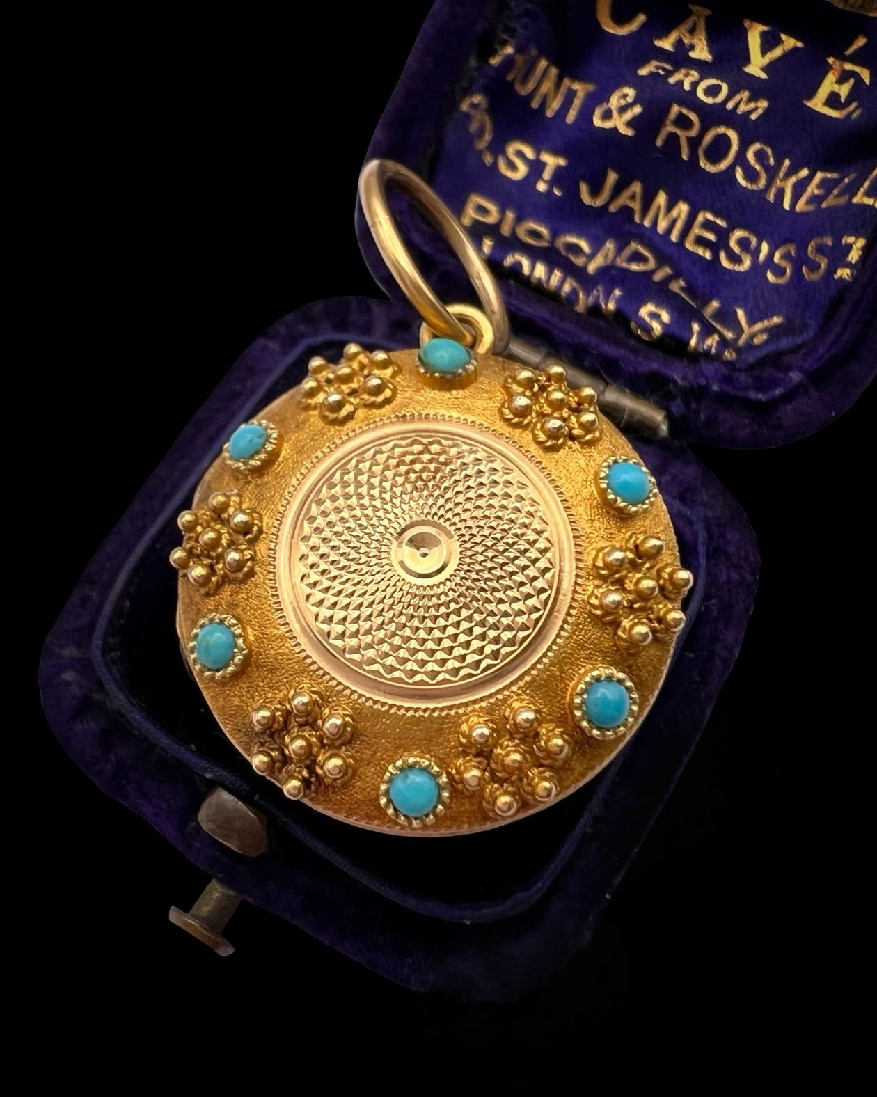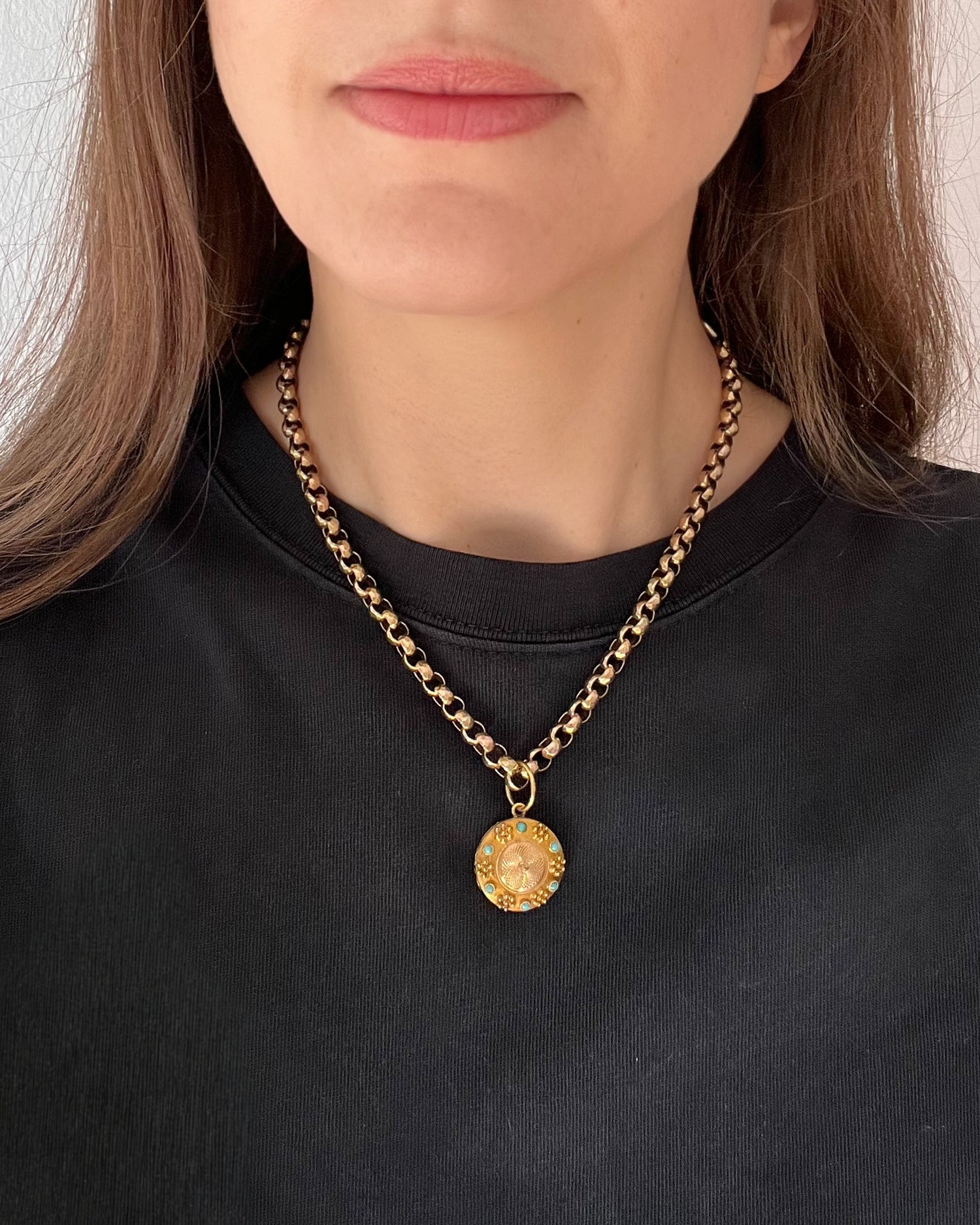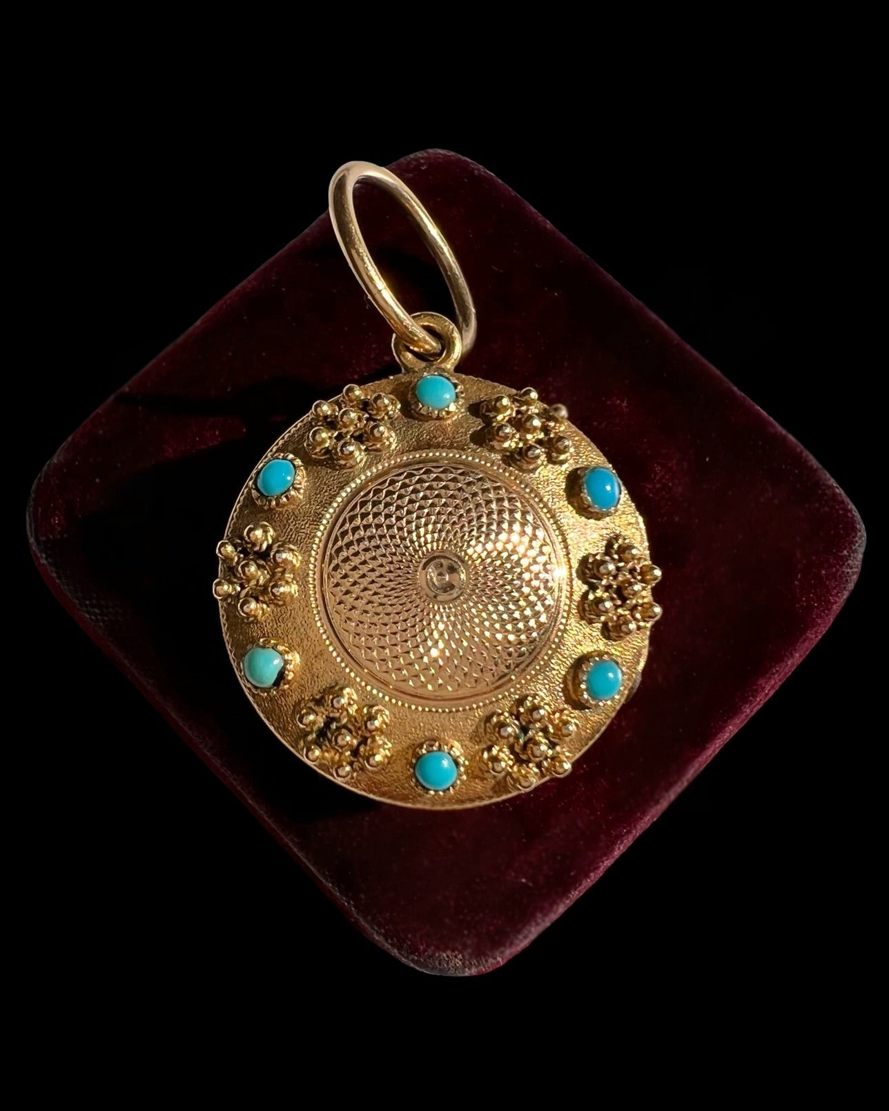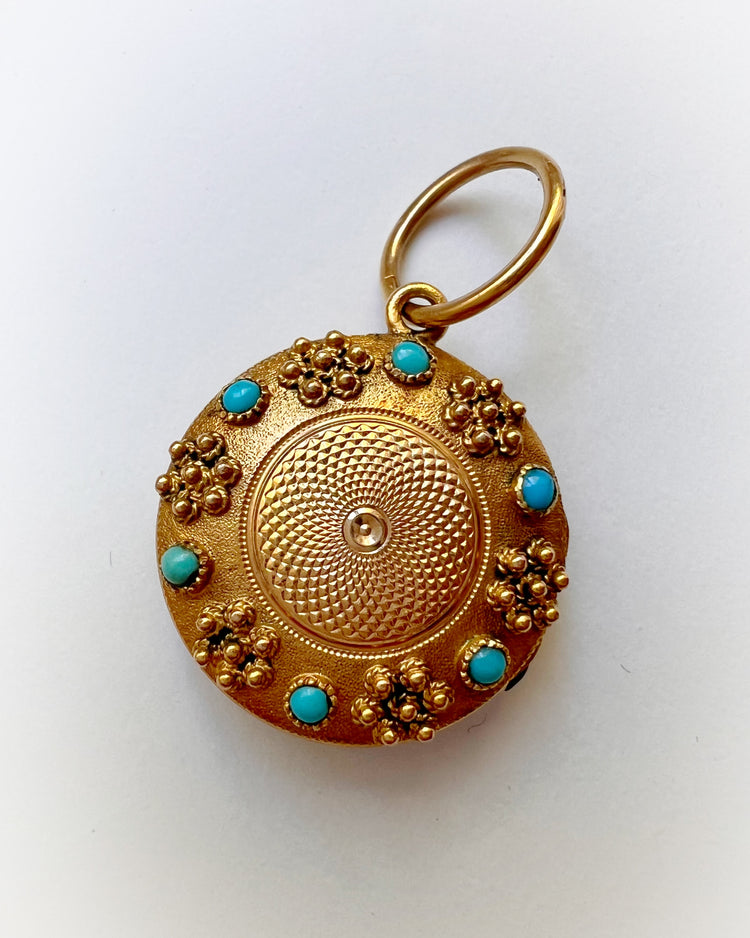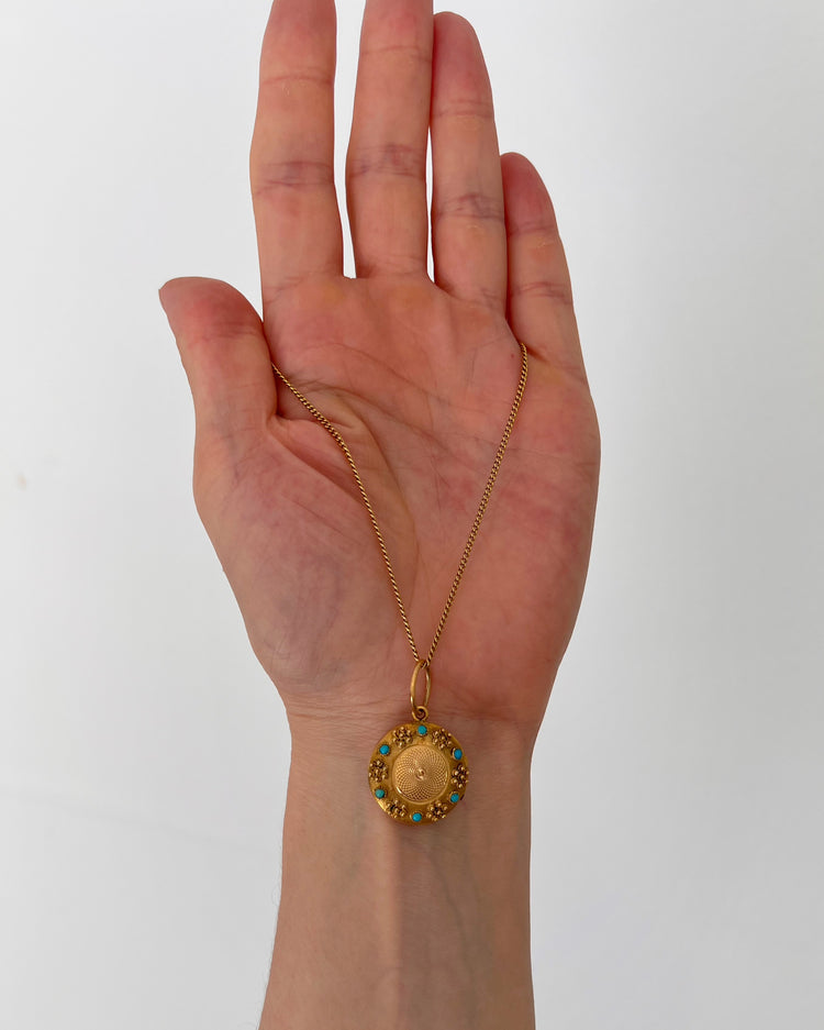 The locket has an engine turned centre, surrounded by turquoise cabochons and clusters of ball finals. The detail is on the front and back, so looks fab from all angles.