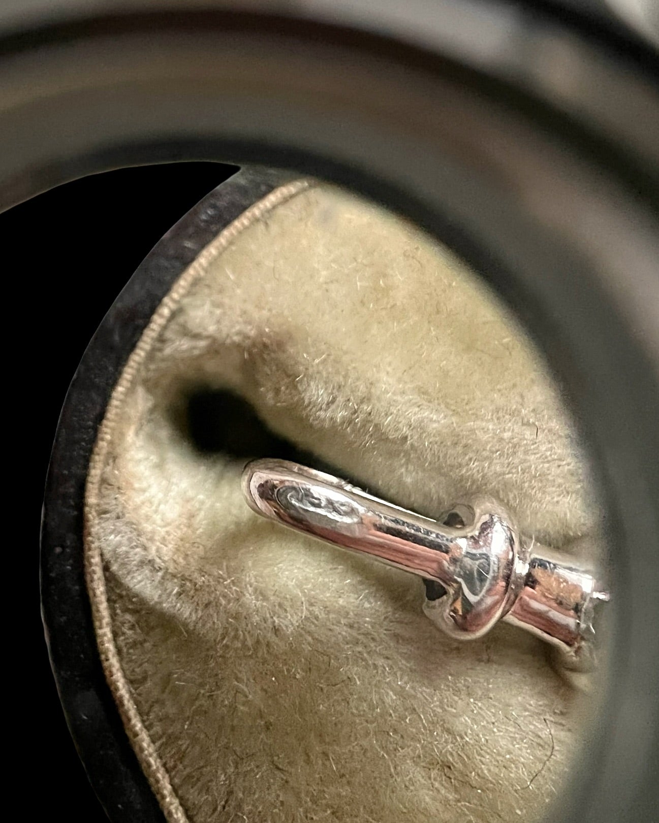 This one has a significant testing mark where you can see the underlying rosey gold beneath the white gold surface on one side, and the other side is perfect.