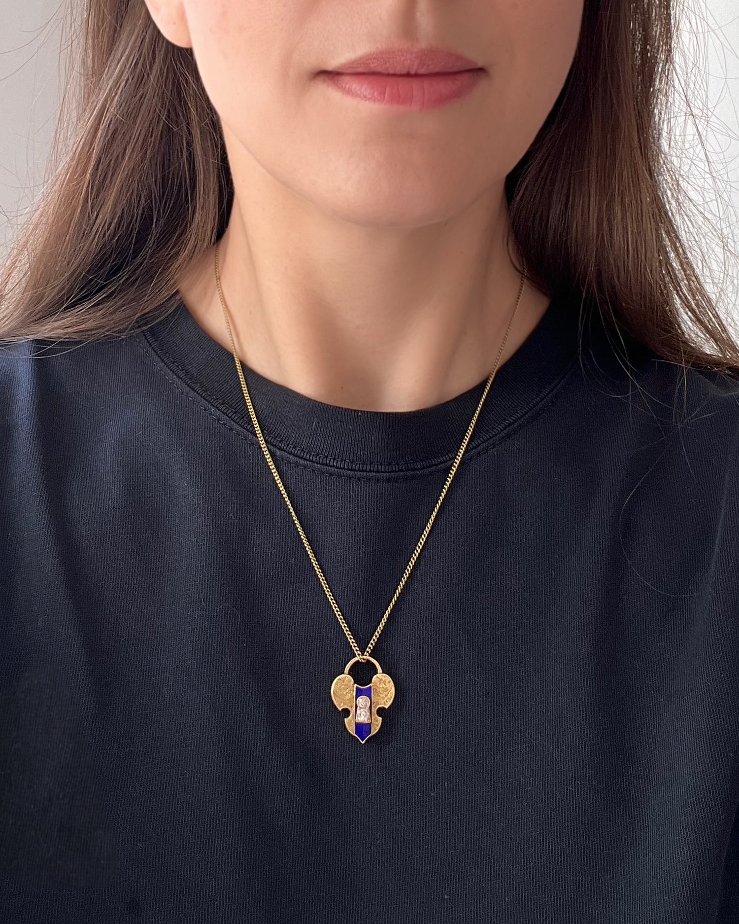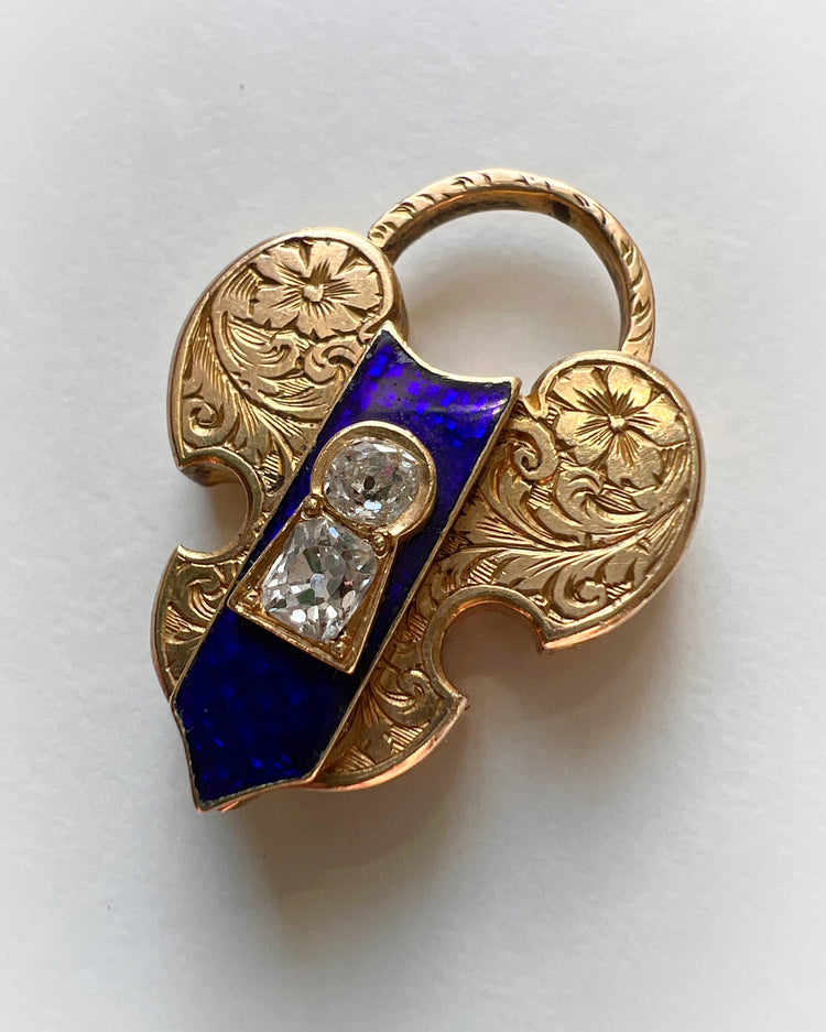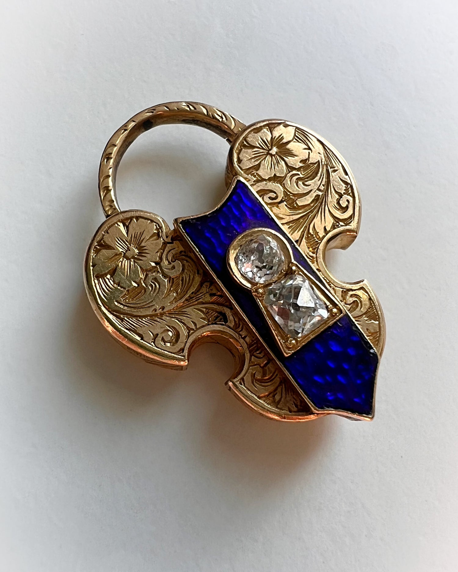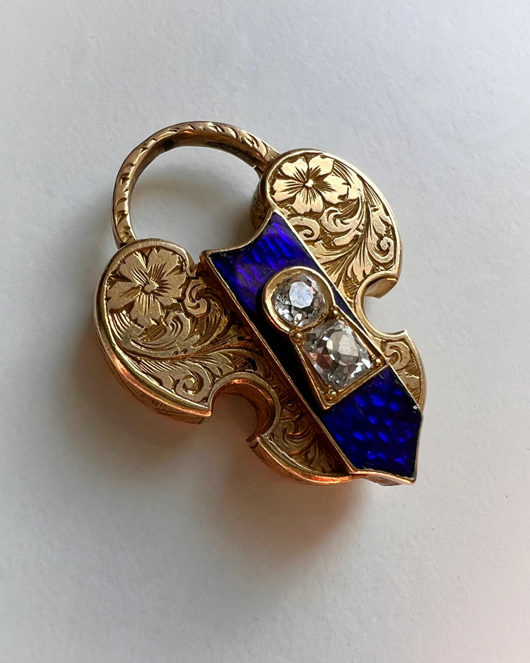 The centre has a deep blue guilloche enamel panel which is set with a diamond keyhole, made of two chunky old cut diamonds; One round and one cushion cut to mimic the keyhole shape.