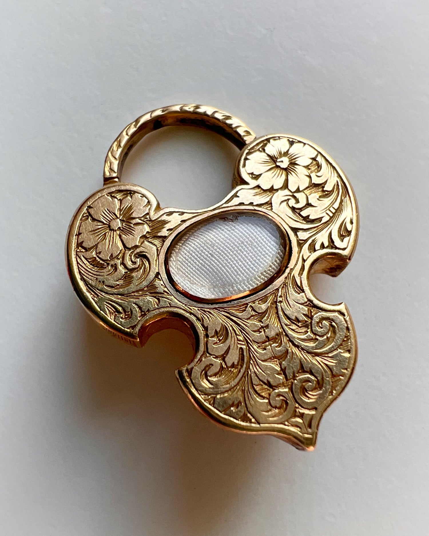 The padlock is made of 18ct gold with beautiful foliate chasing all over the front and back, and the padlock arm!