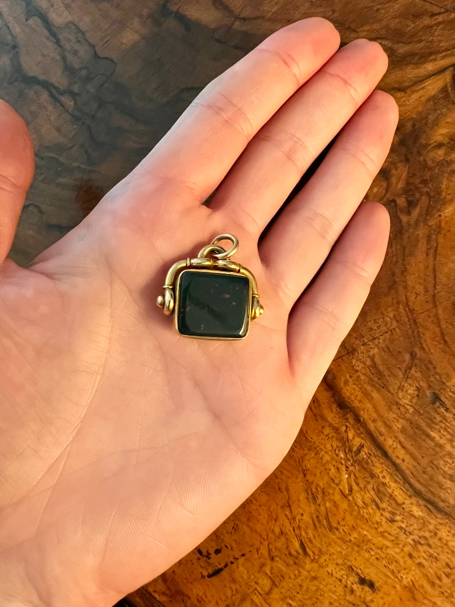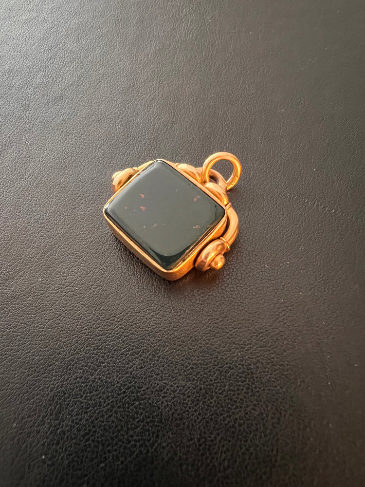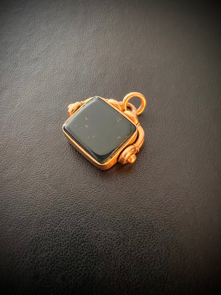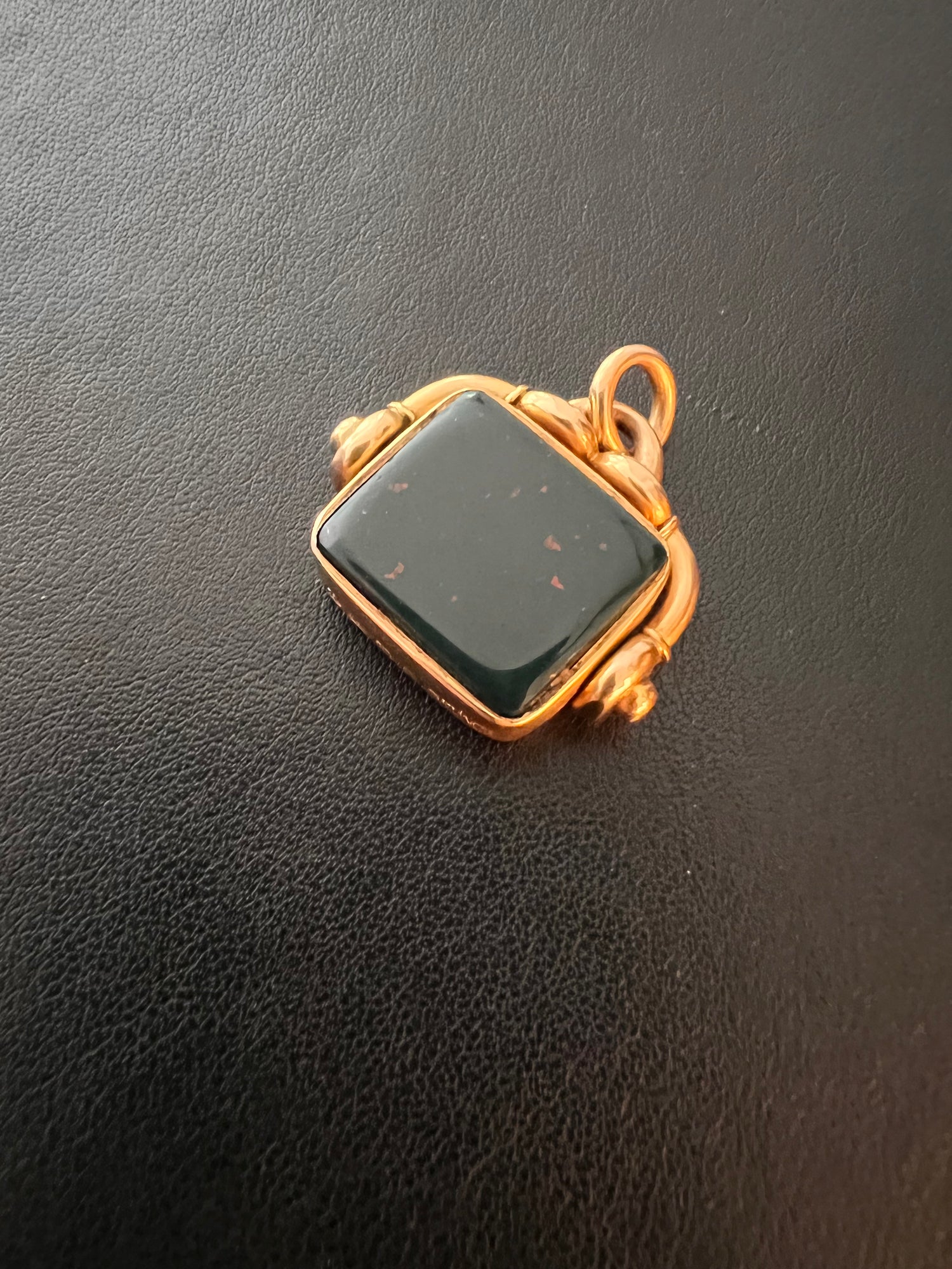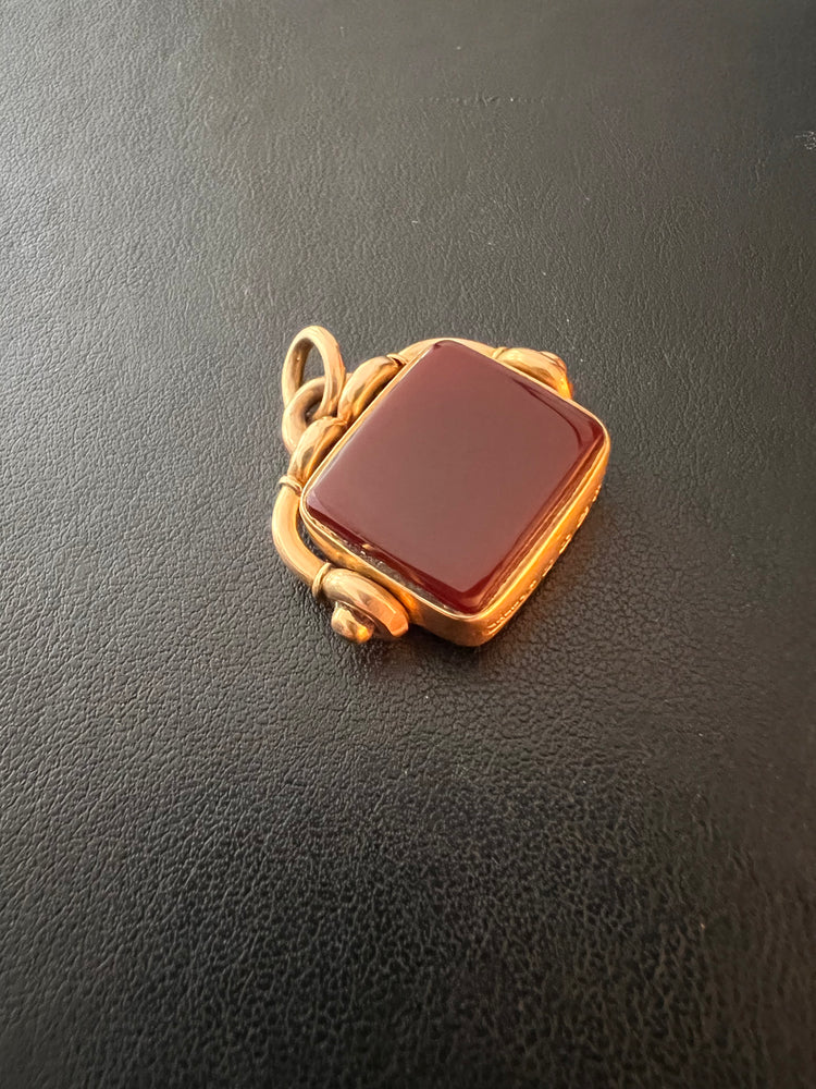 It is made in yellow 18ct gold and set with a large smooth Bloodstone and a Carnelian.