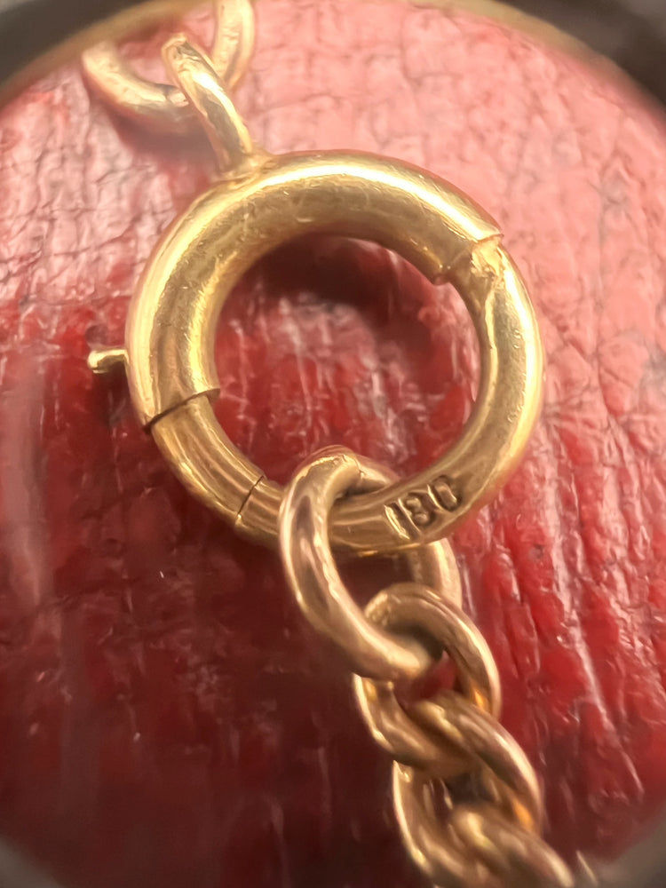 Hallmarked 18 on the bolt ring and 18ct/plat on the chain tag.