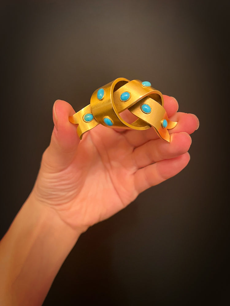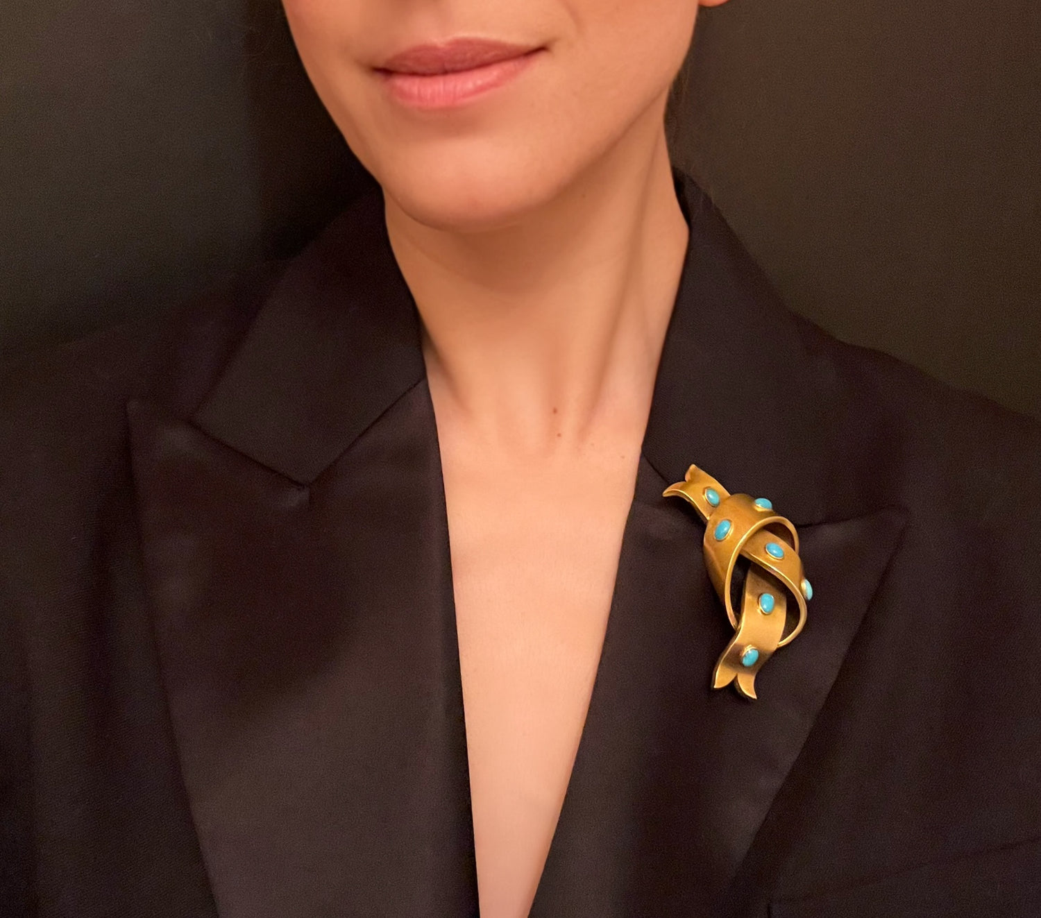 The brooch is a substantial size which creates a fantastic impact when worn, and the colour of the bright Turquoise against the yellow gold is so striking.