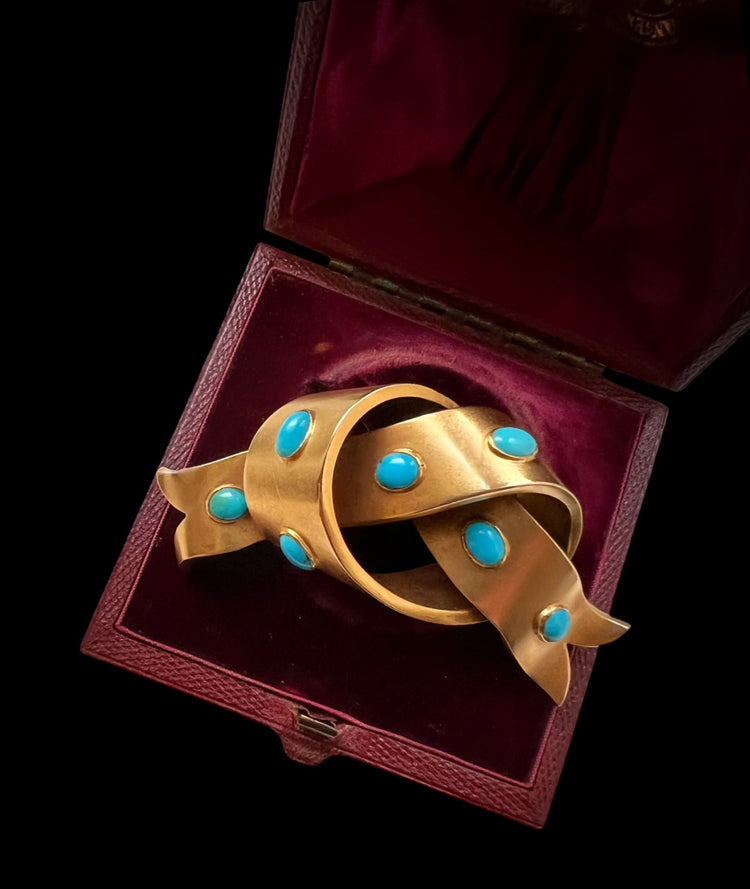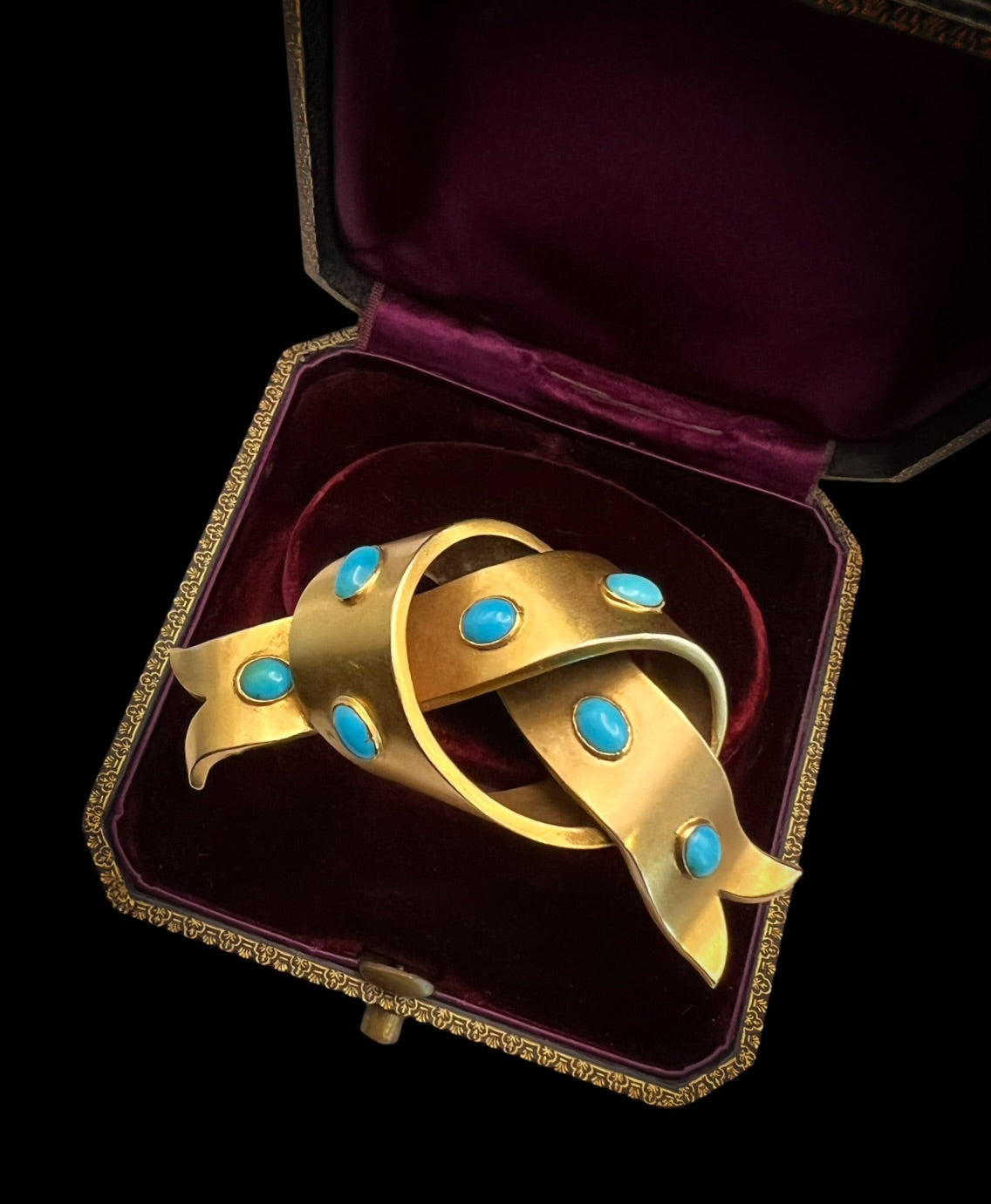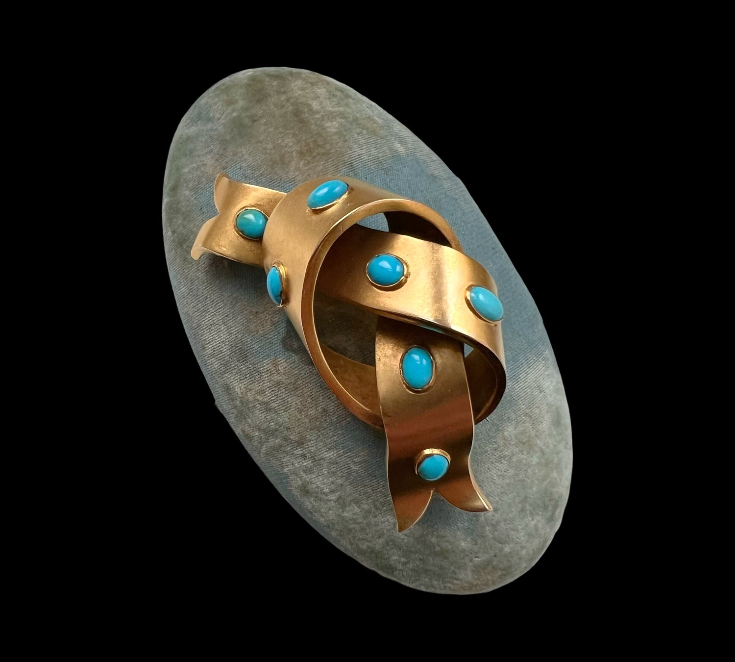 A stunning chunky Victorian 18ct gold brooch. The brooch is a 3D design of a knotted ribbon studded with gorgeous bright blue Turquoise stones,