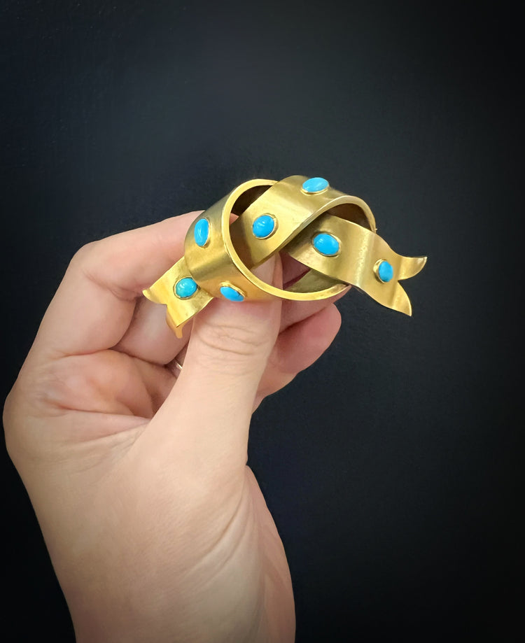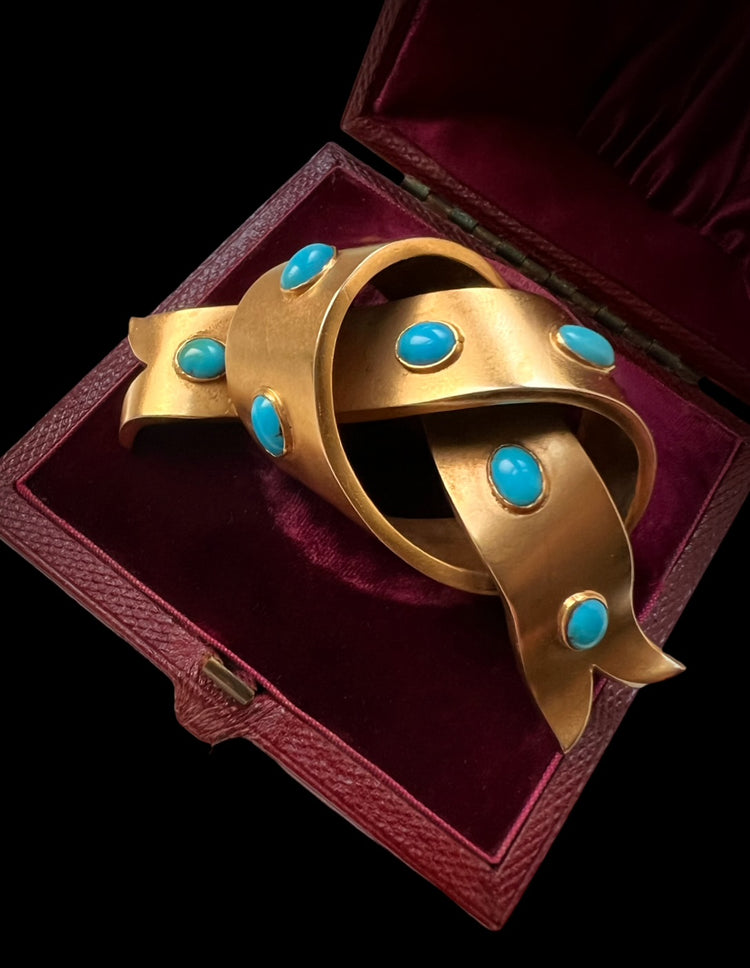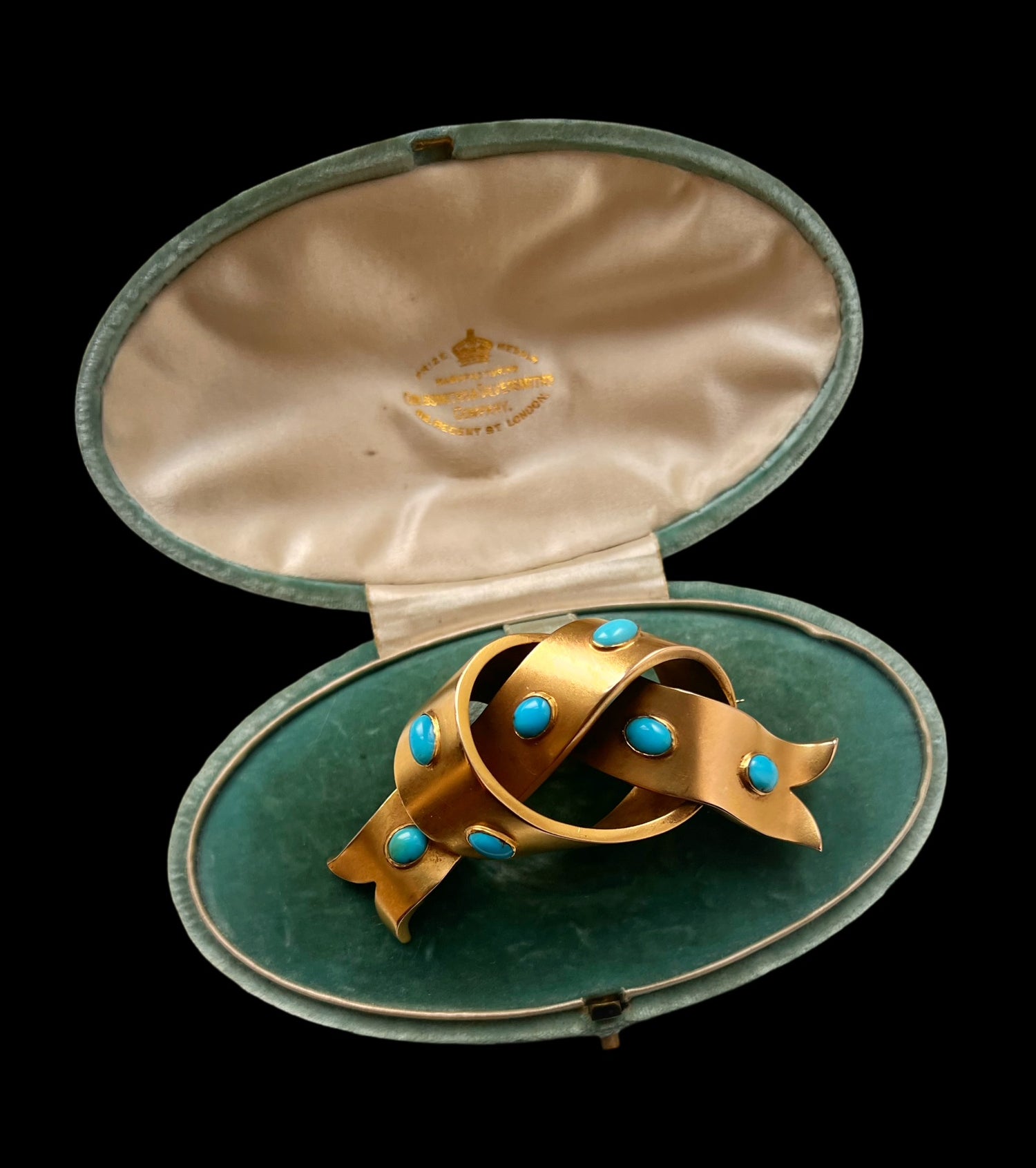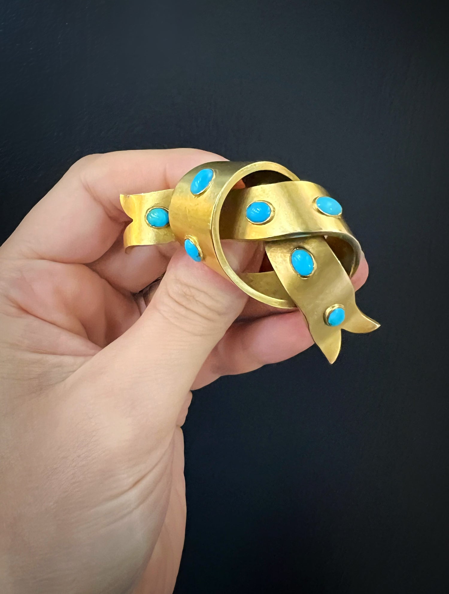 A stunning chunky Victorian 18ct gold brooch. The brooch is a 3D design of a knotted ribbon studded with gorgeous bright blue Turquoise stones,