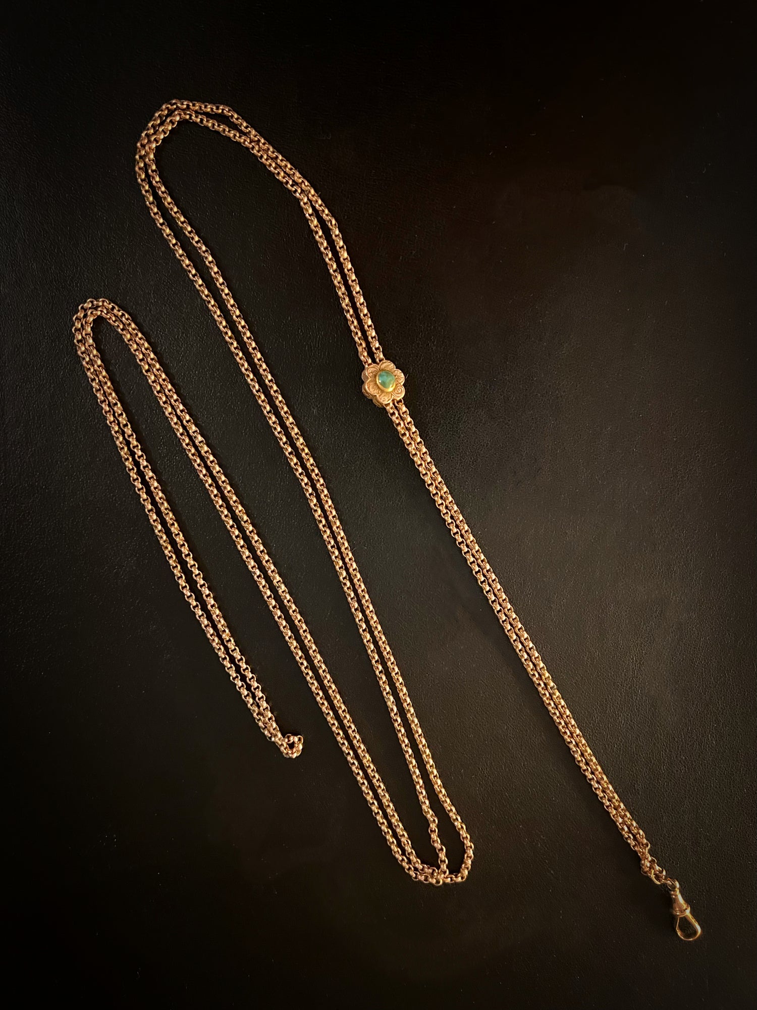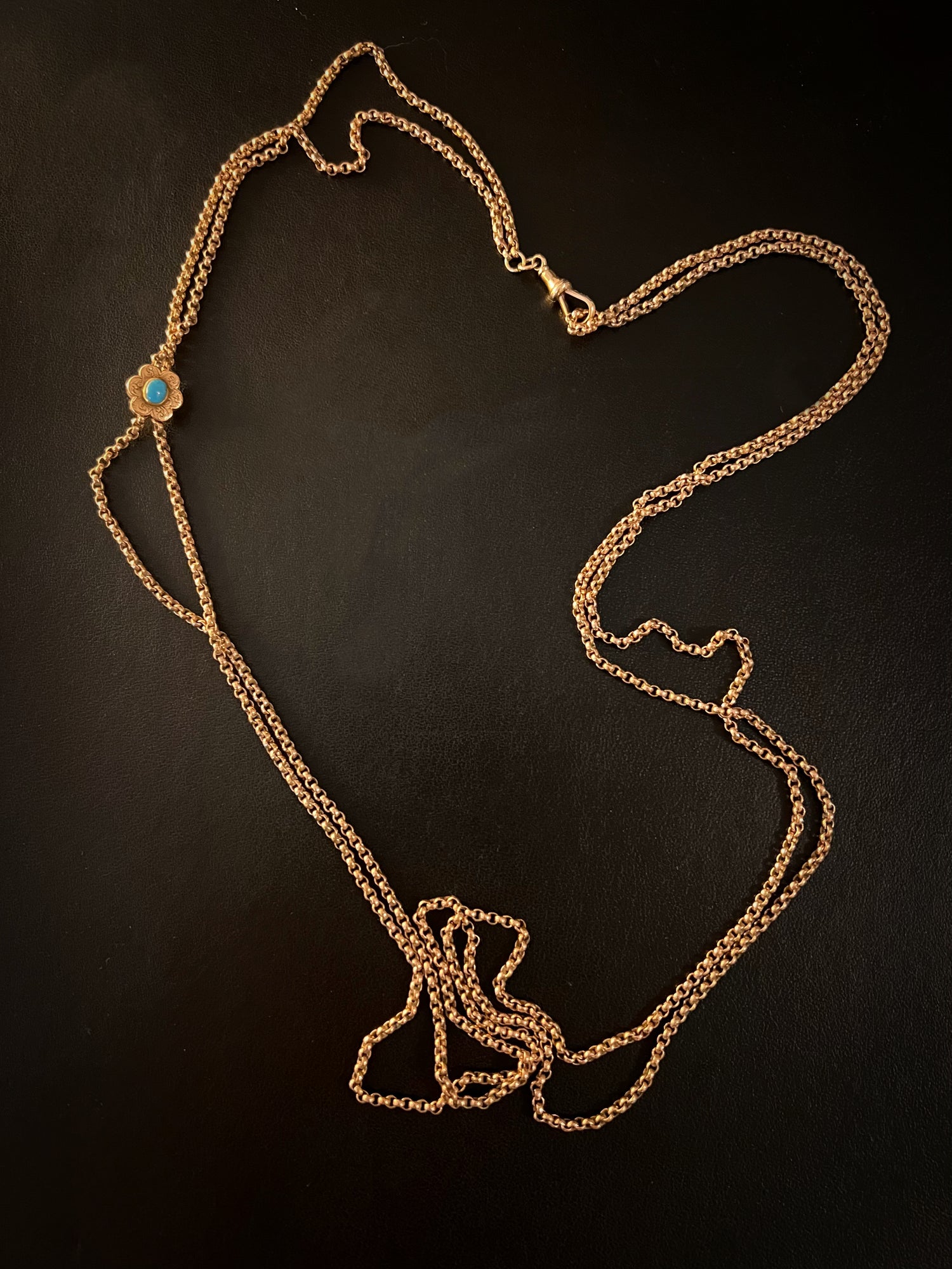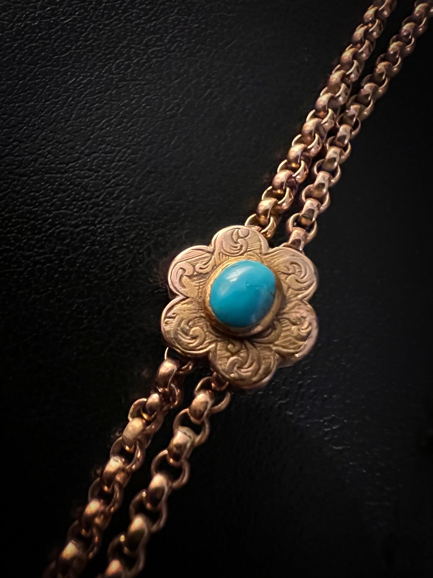 This is a super versatile Victorian rose gold 9ct longuard belcher chain with a double sided turquoise slider.