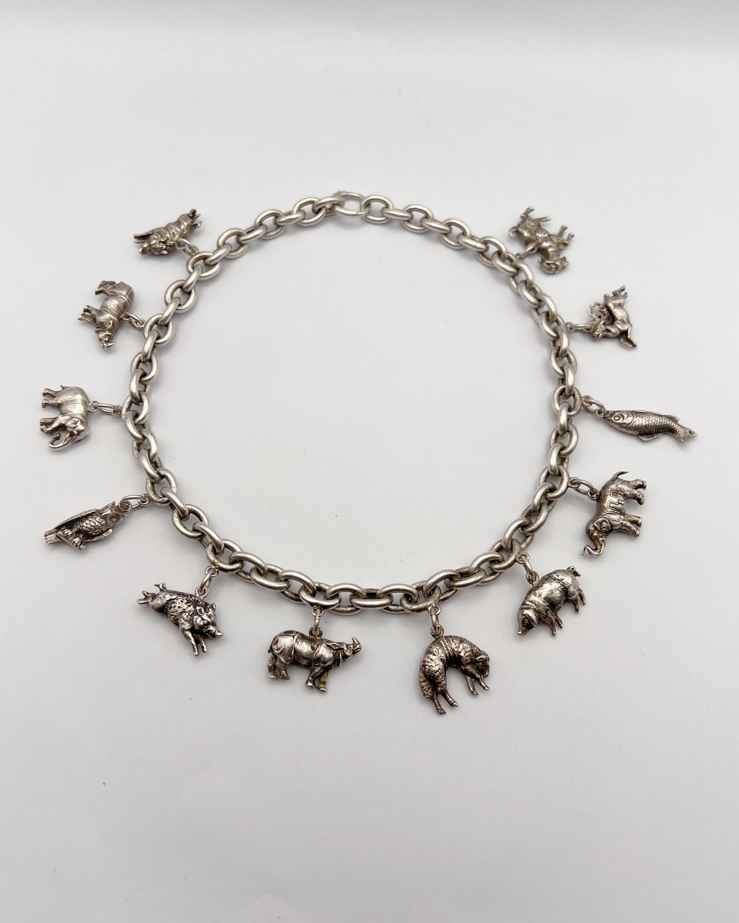 The super chunky hollow silver belcher chain is epic in its own right, but is made even more amazing by the twelve silver animal charms that hang from the chunky links.
