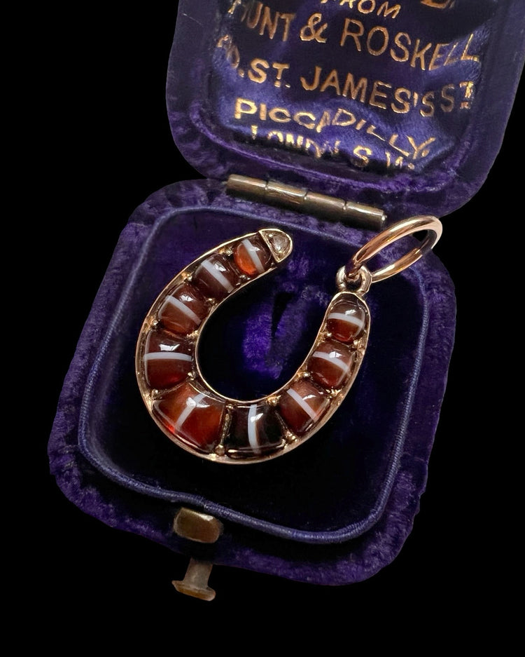 A striking Victorian banded agate and diamond horseshoe pendant.