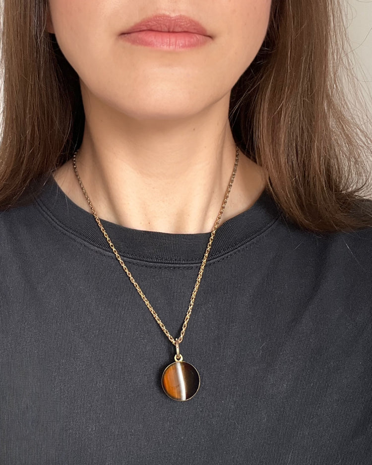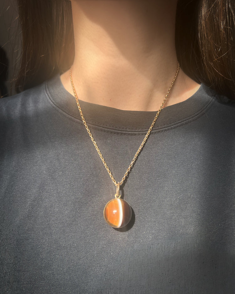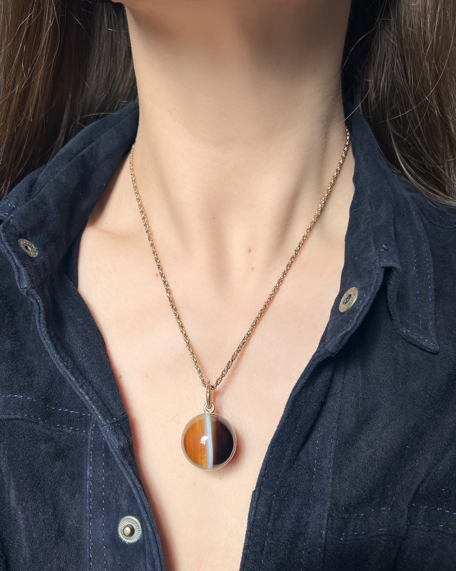 The locket is made of two super smooth domes of banded agate with hues of chocolate brown and honey. The agate has a white stripe down the centre.