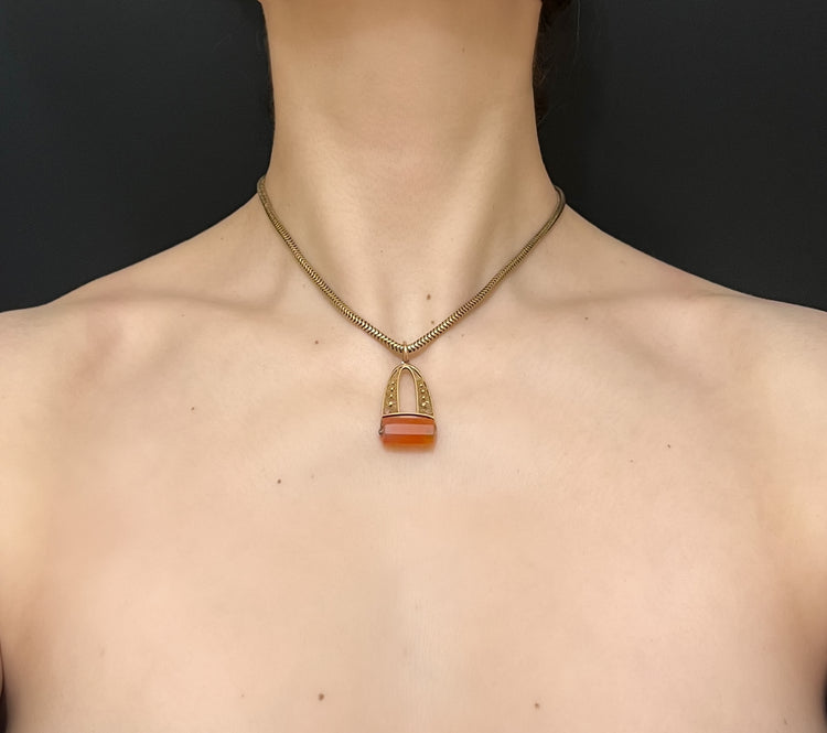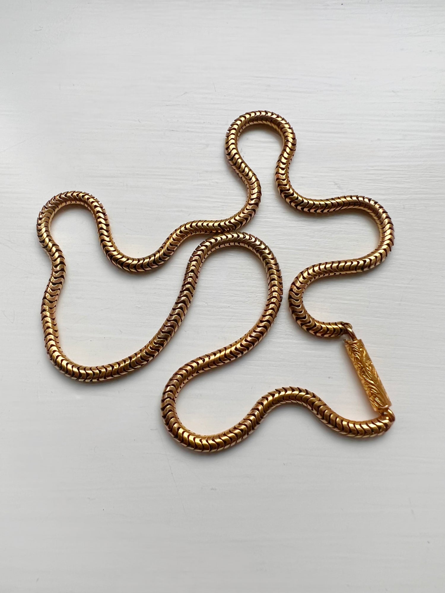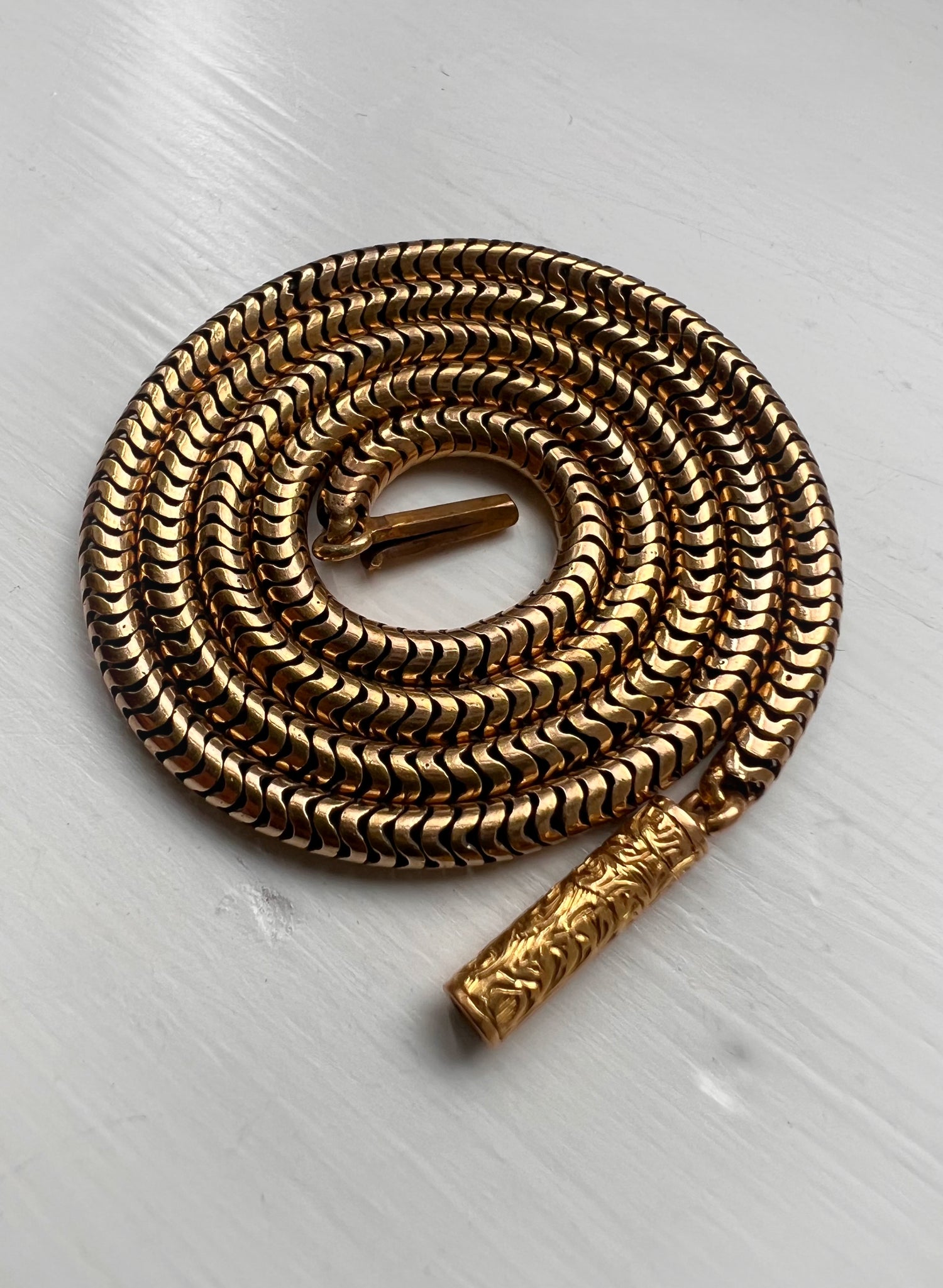 Victorian 15ct gold Brazilian / snake link chain with a foliate chased barrel.