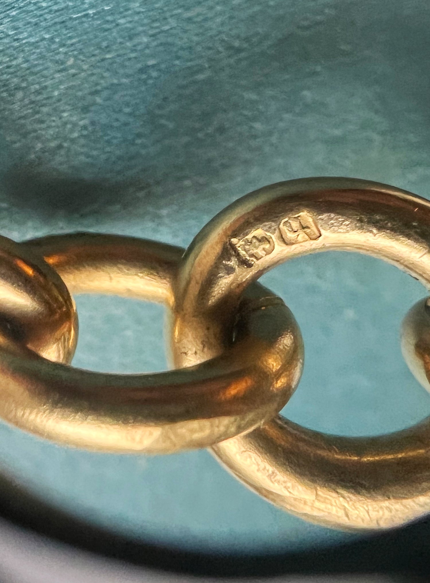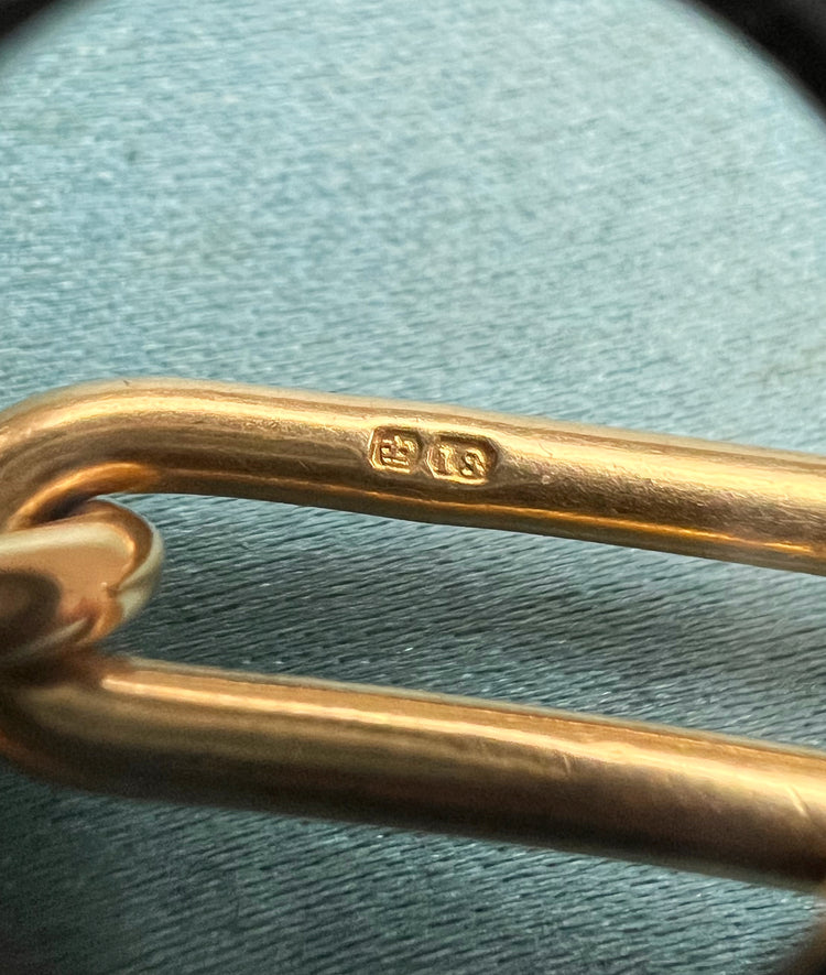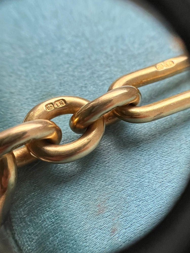 Each link is hallmarked with the Crown symbol and 18, for 18ct gold.