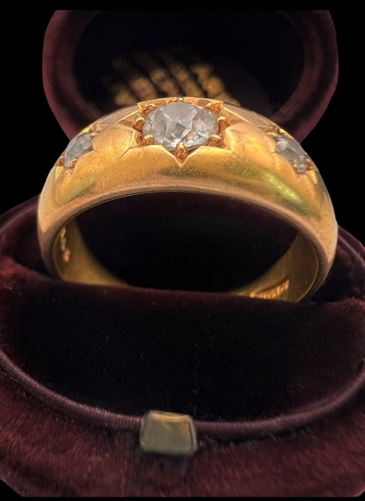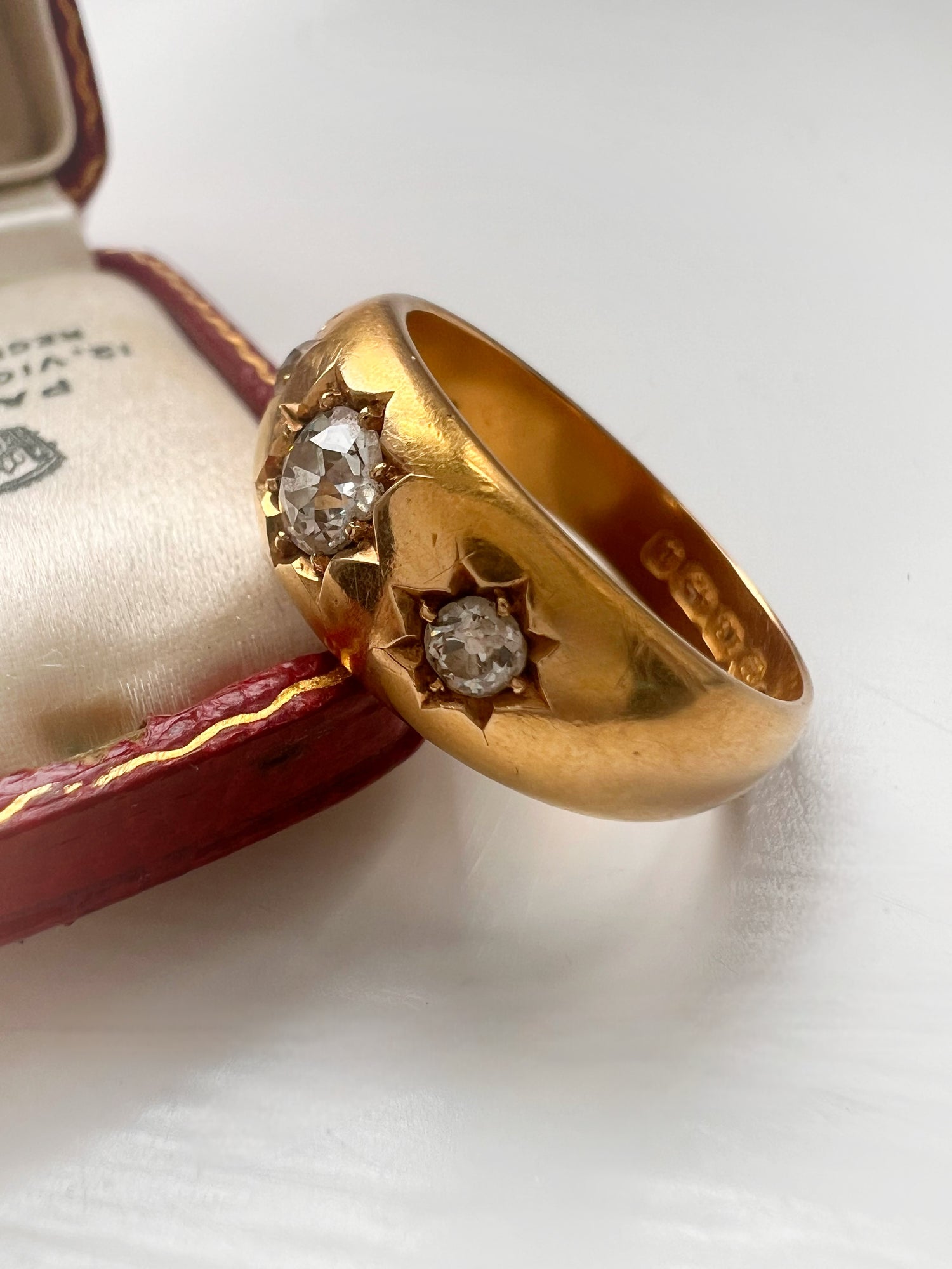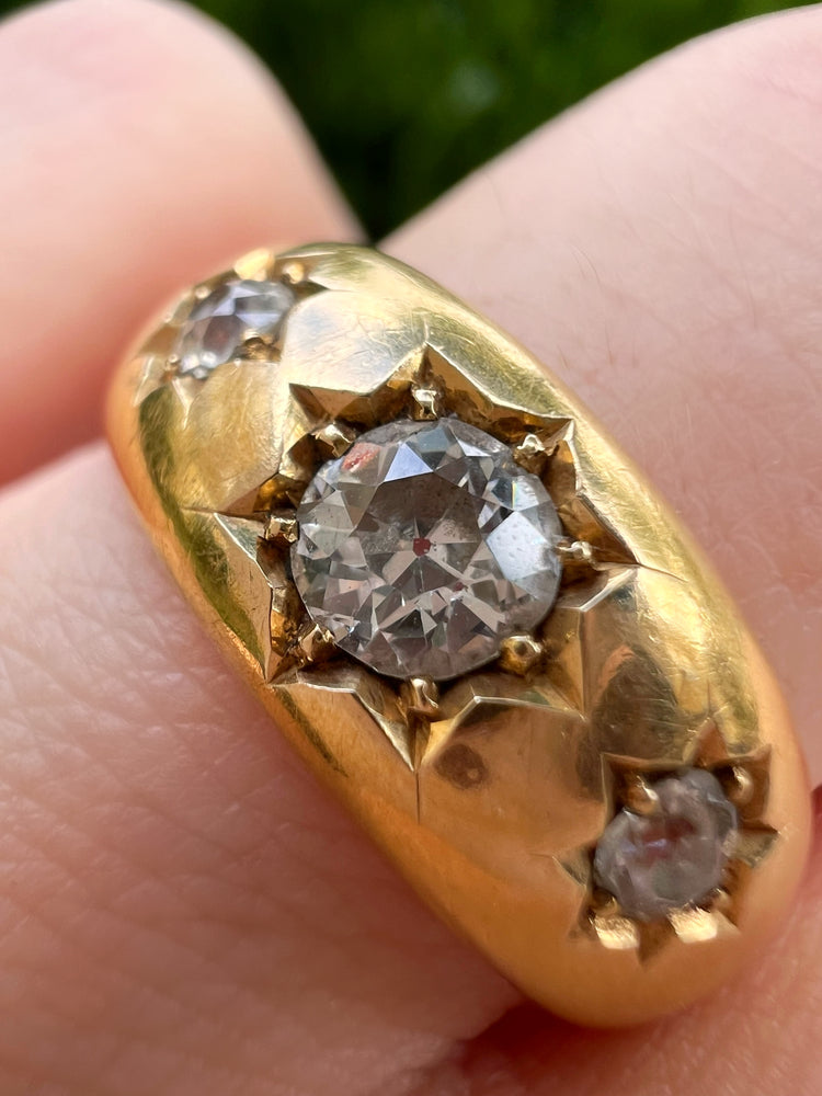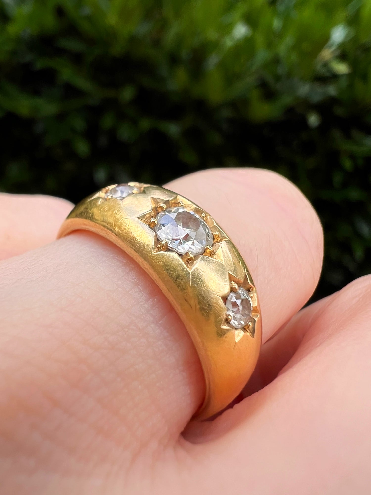 The chunky domed band is set with three old cut diamonds in a star / gypsy setting, with the largest in the middle and flanked by two smaller stones.