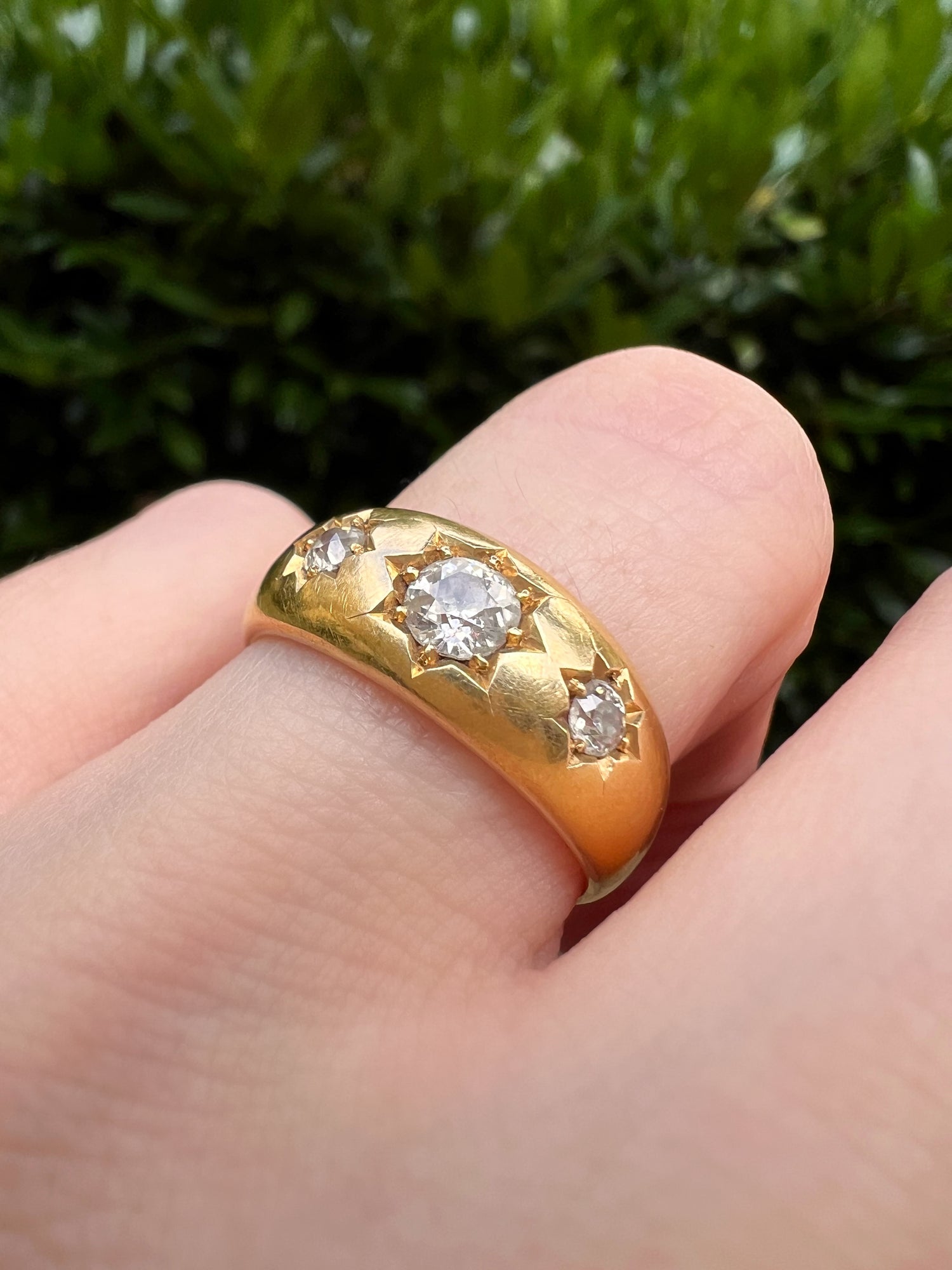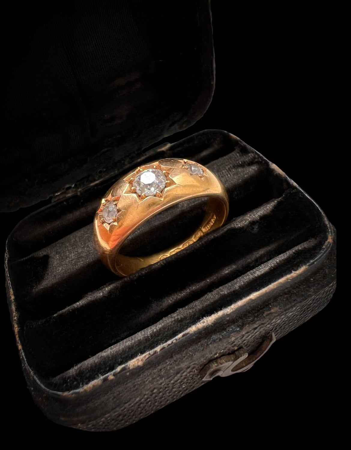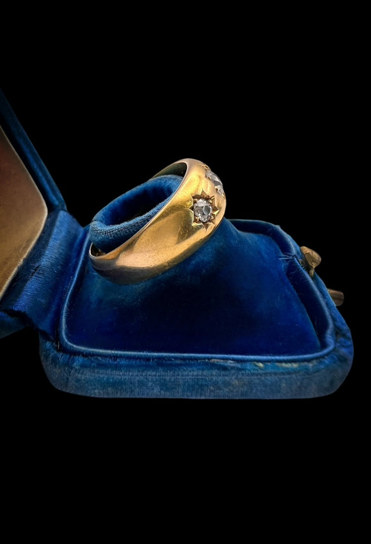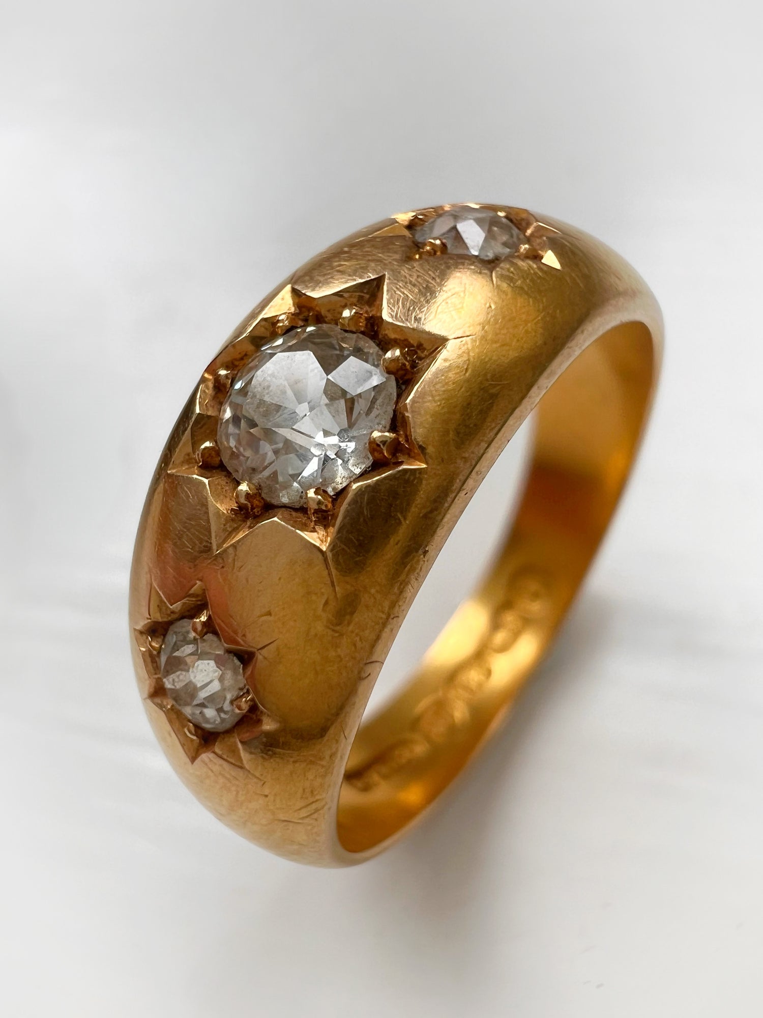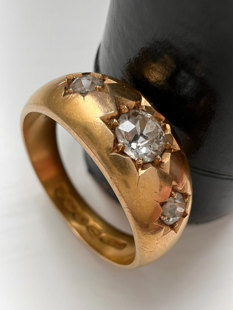 The chunky domed band is set with three old cut diamonds in a star / gypsy setting, with the largest in the middle and flanked by two smaller stones.