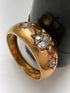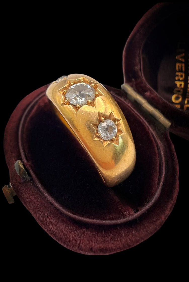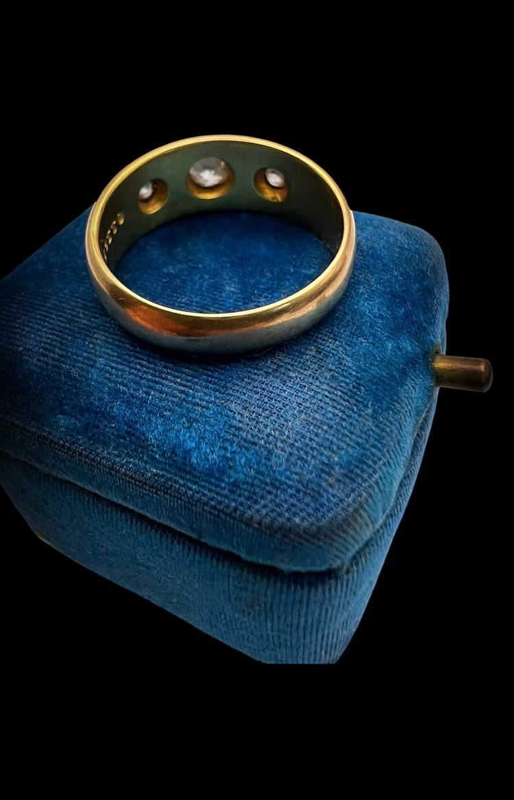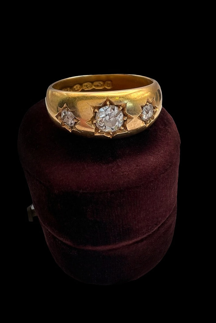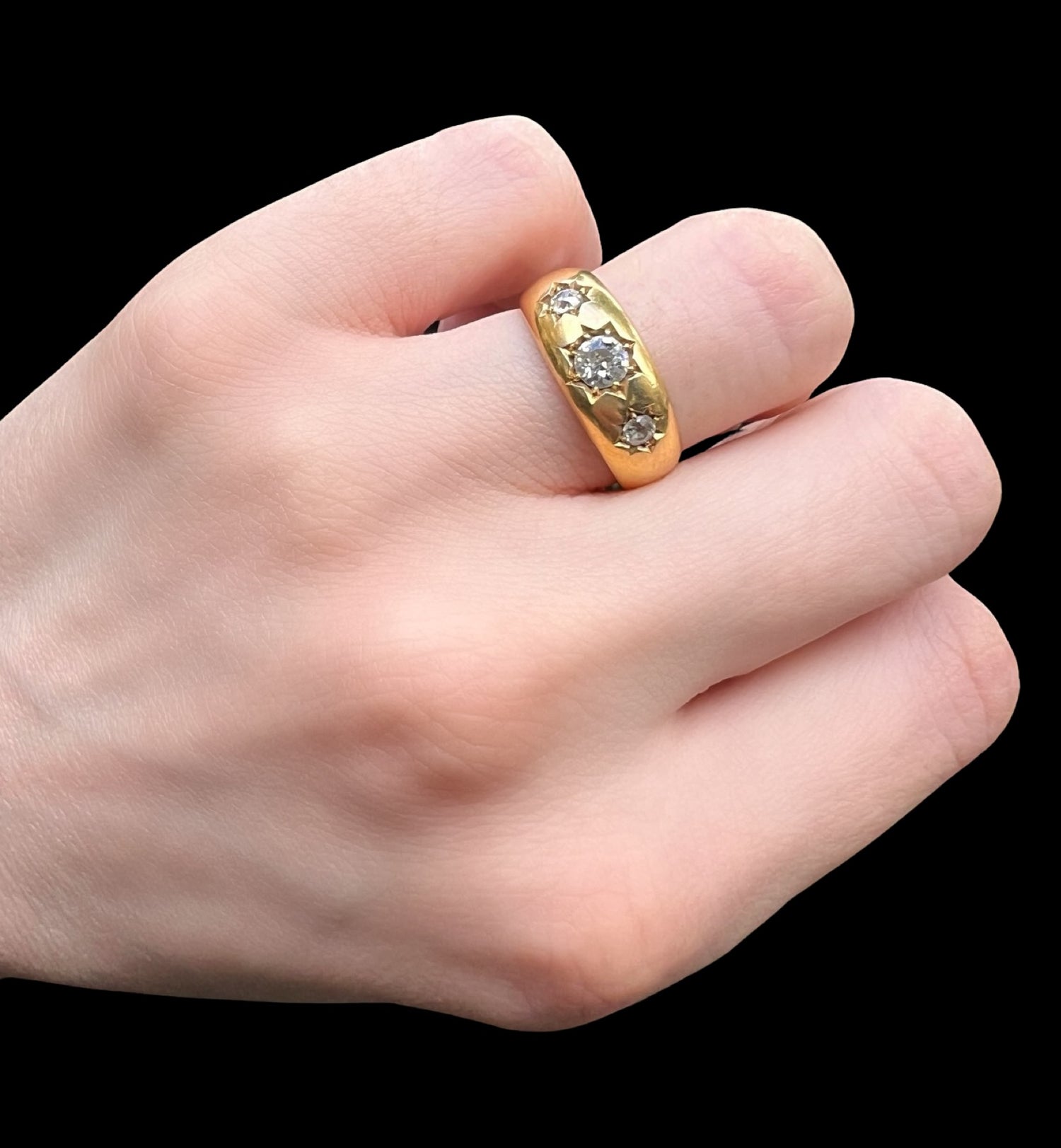 The chunky domed band is set with three old cut diamonds in a star / gypsy setting, with the largest in the middle and flanked by two smaller stones.