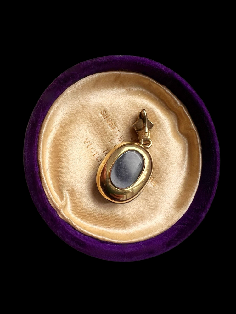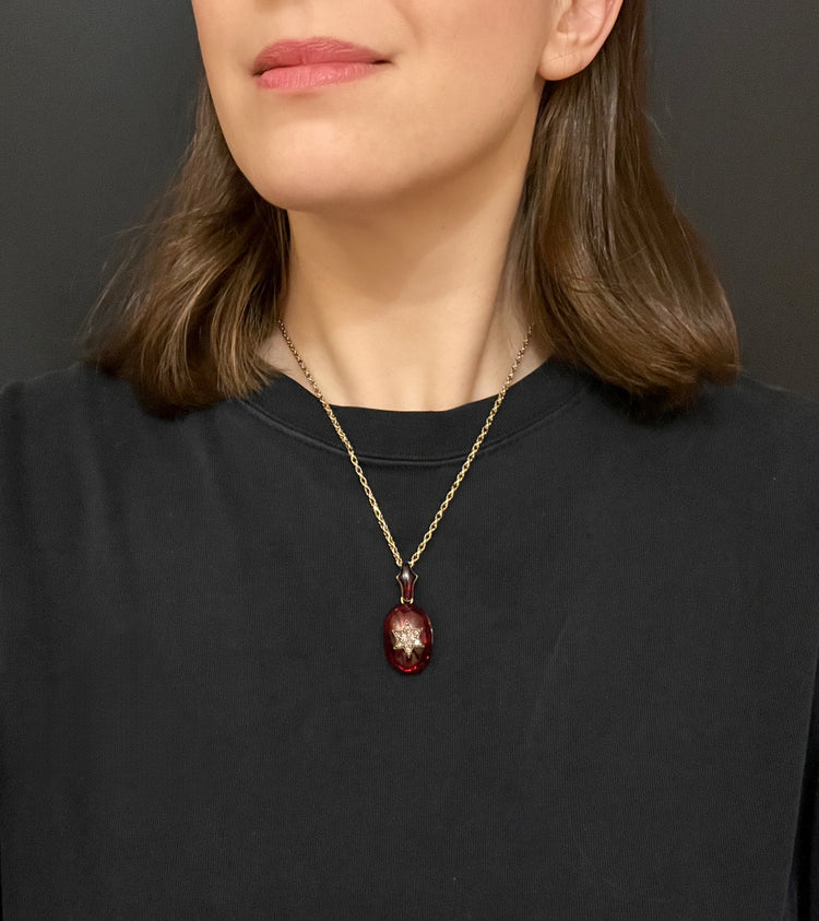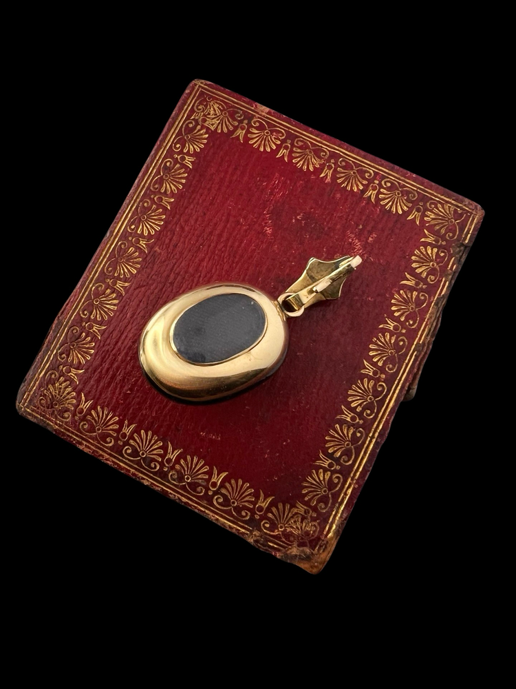 The reverse of the pendant has an oval glazed locket compartment with a silk lining.