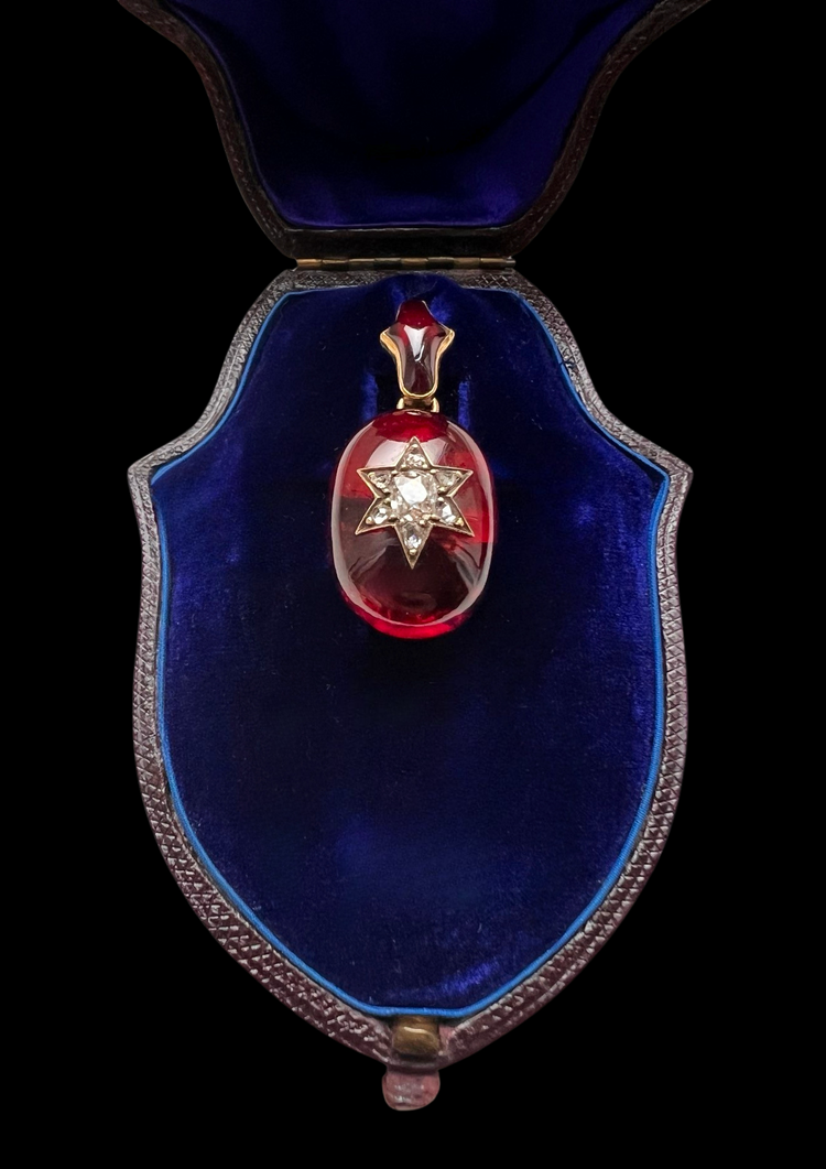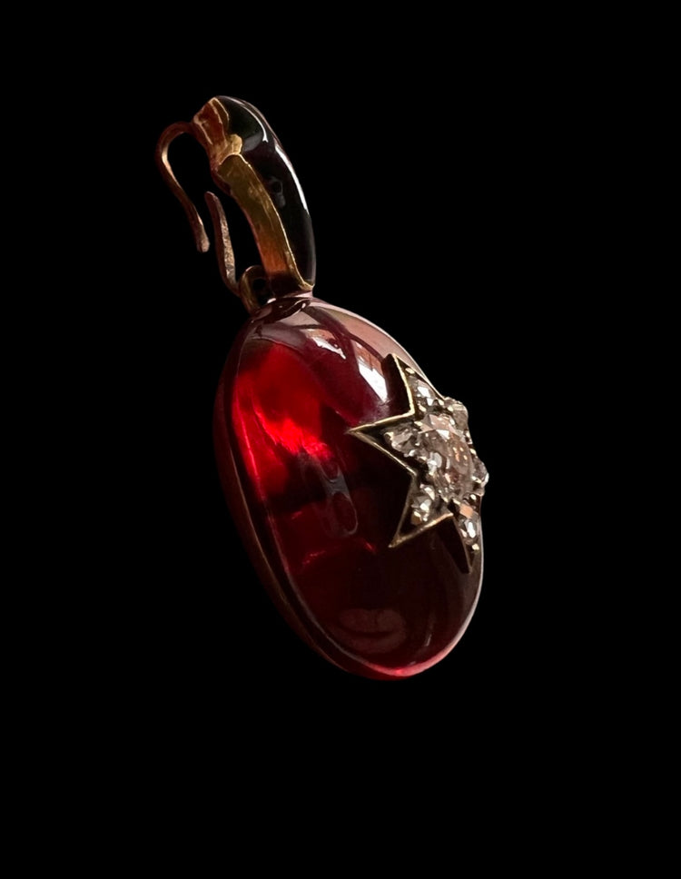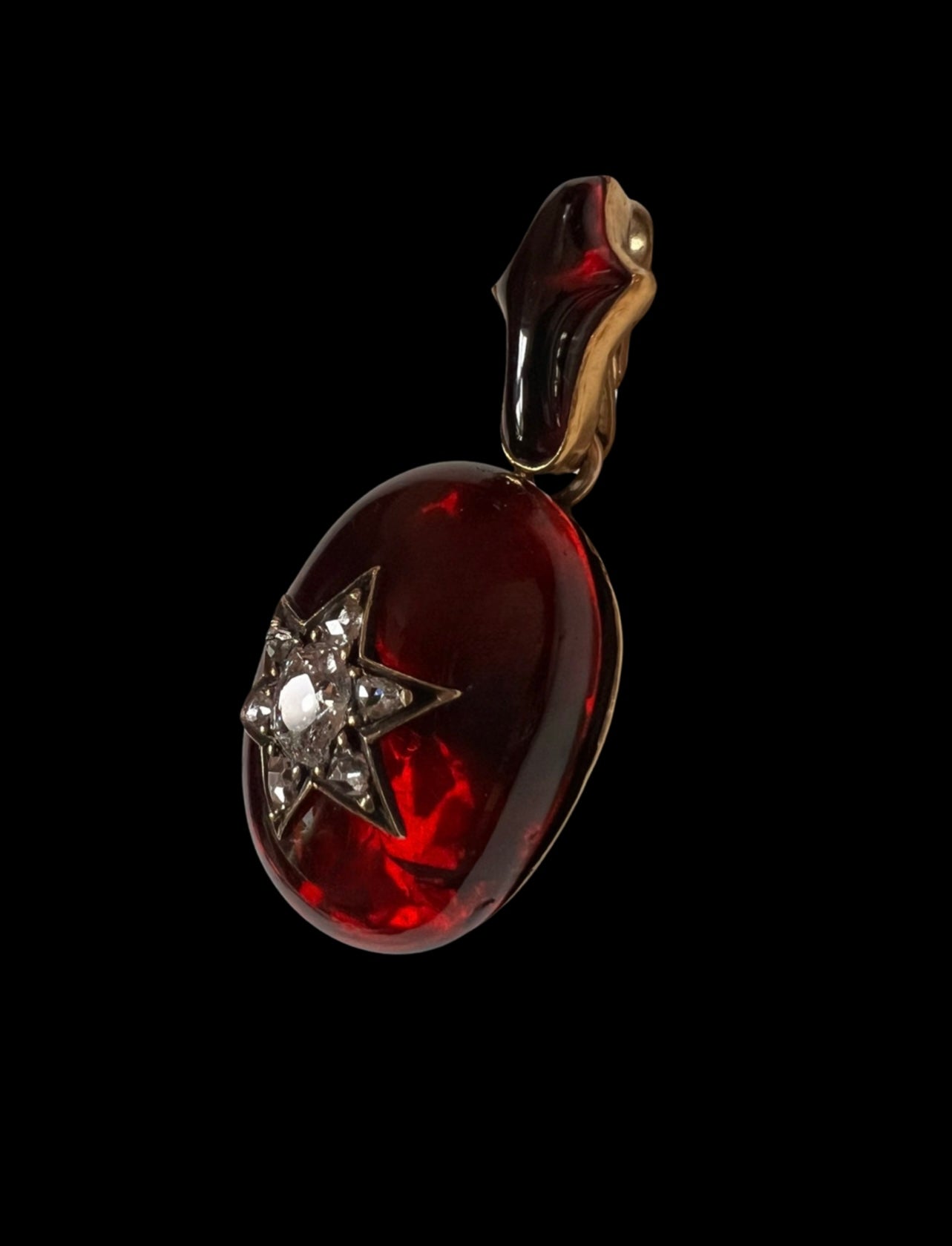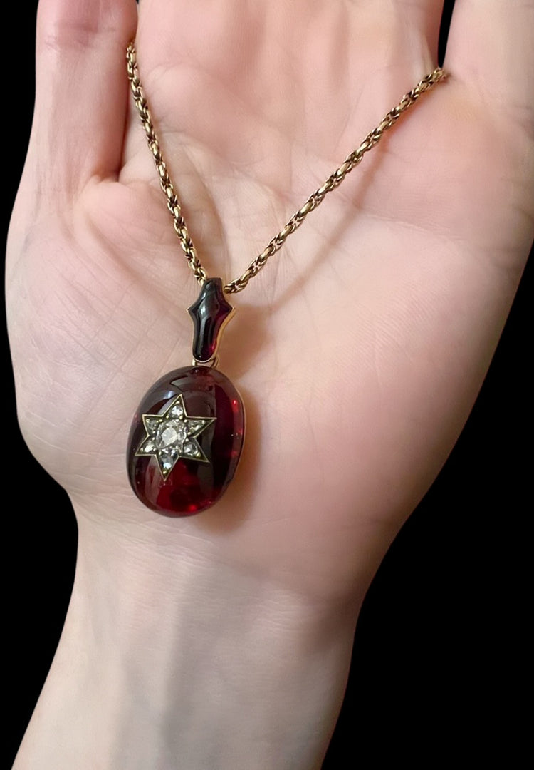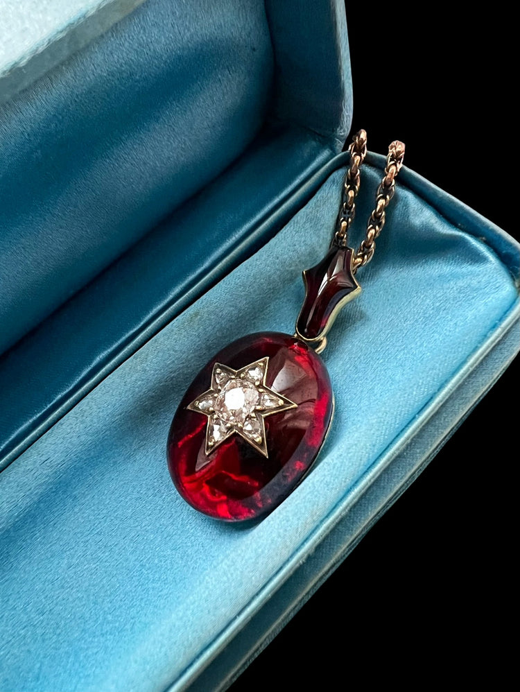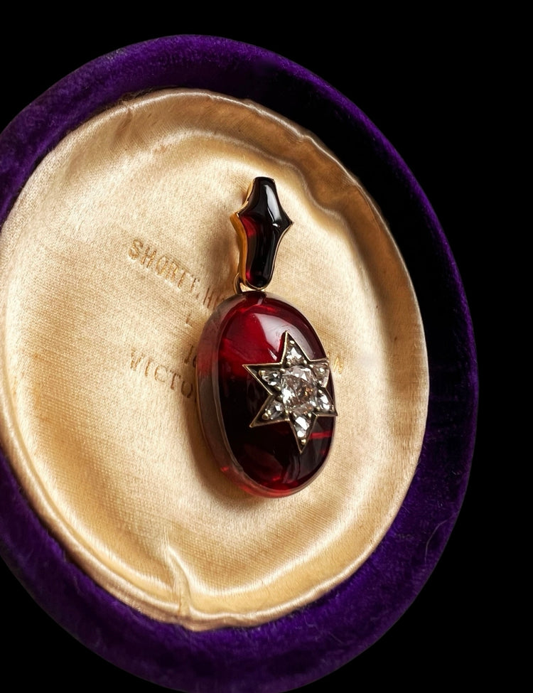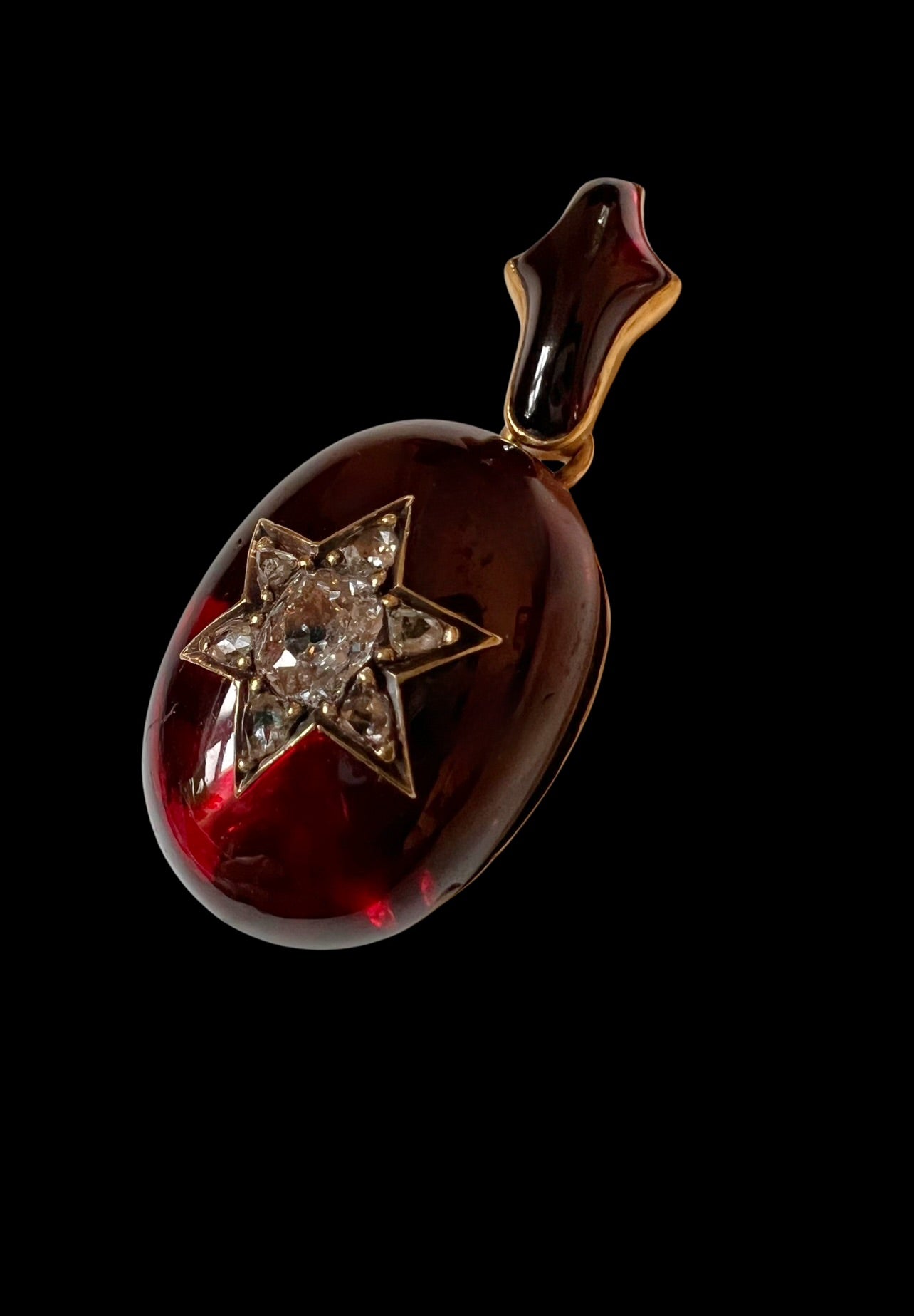 The carbuncle garnet has a wonderful diamond set, six point star at the centre.