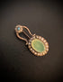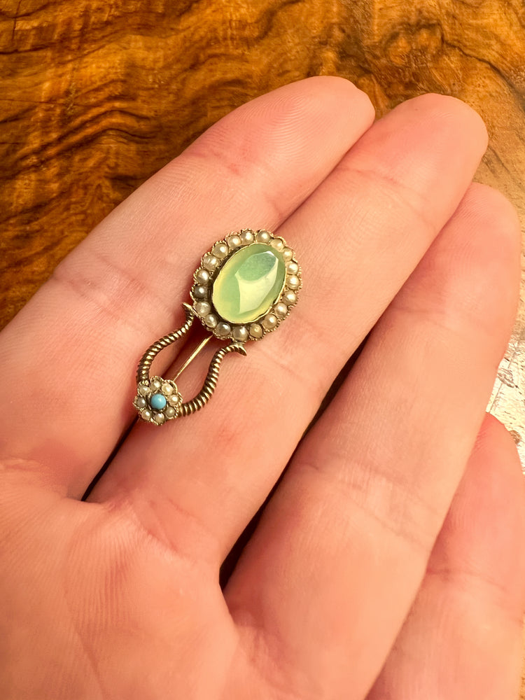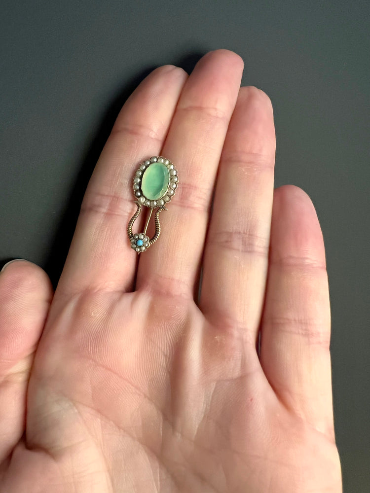 The main stone is a milky mint toned Chalcedony, surrounds by natural seed pearls.