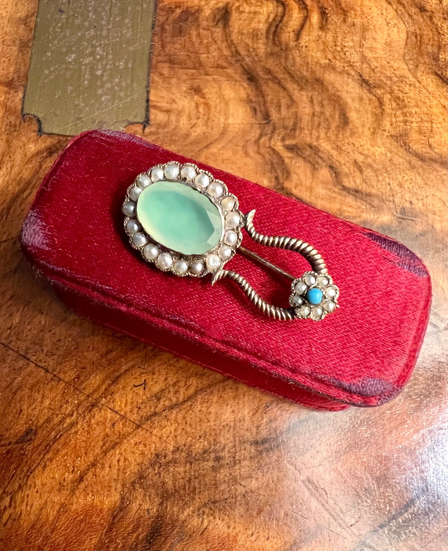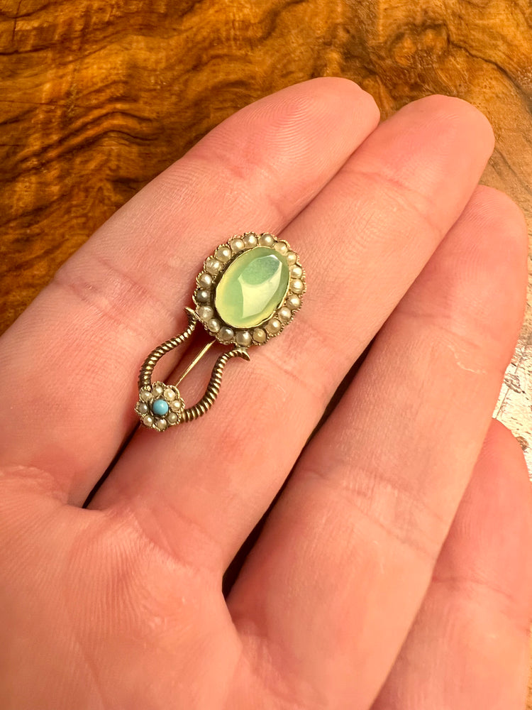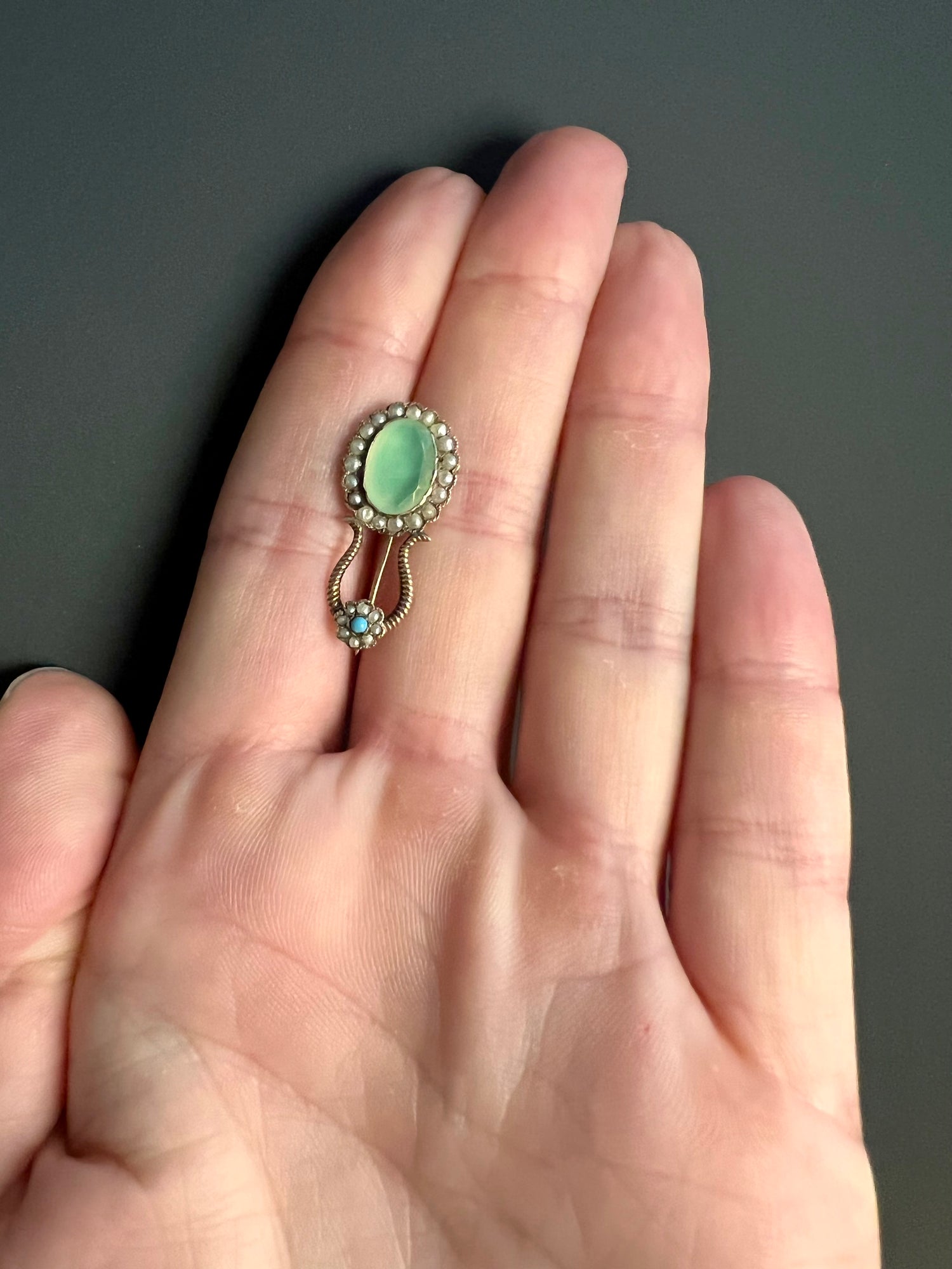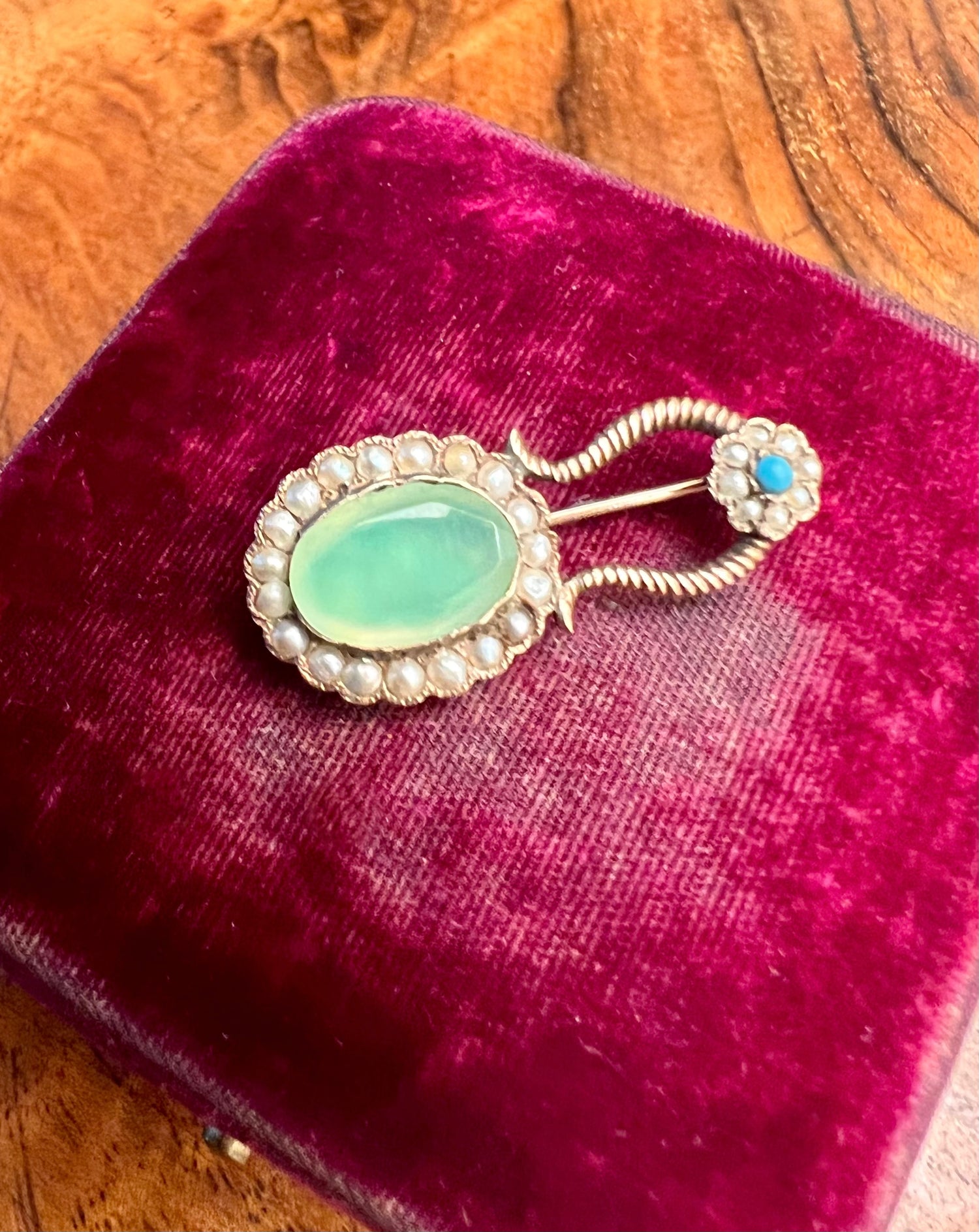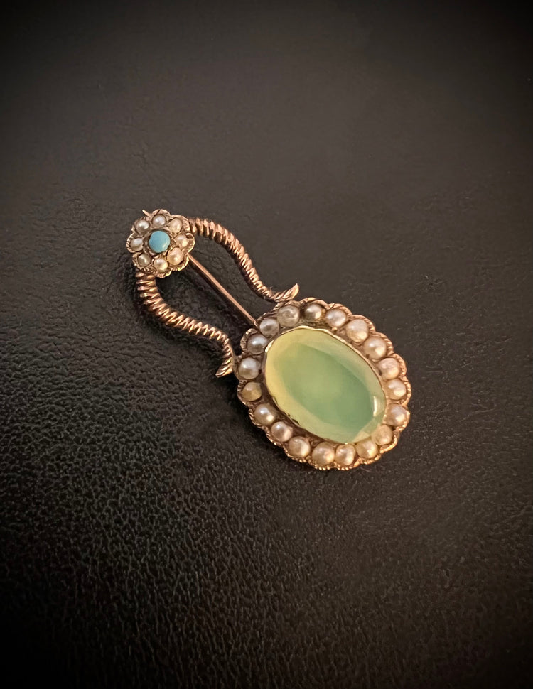 MATERIALS & FEATURES: Chalcedony, seed pearls, turquoise, 15ct gold