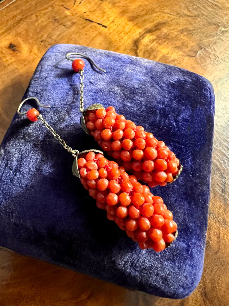 These are a lovely pair of Coral grape drop earrings c. 1880