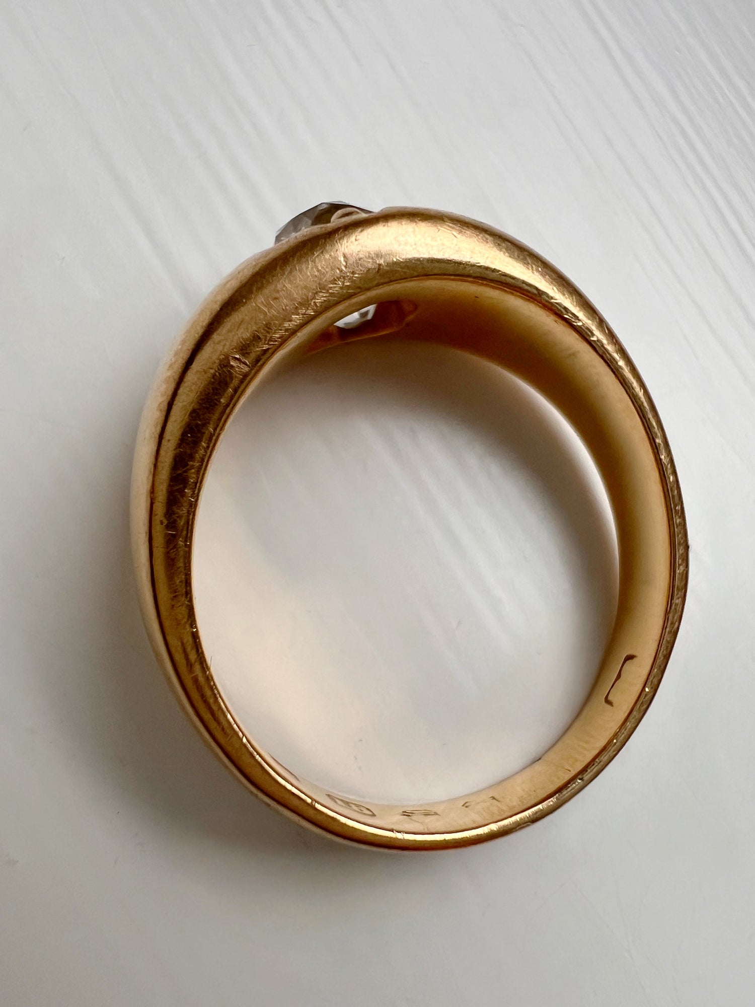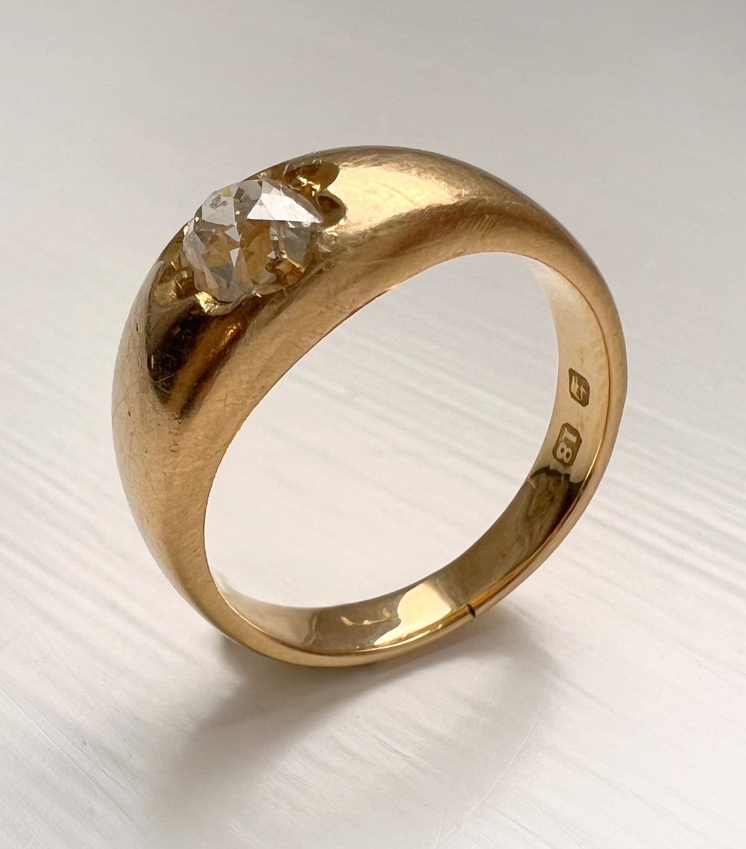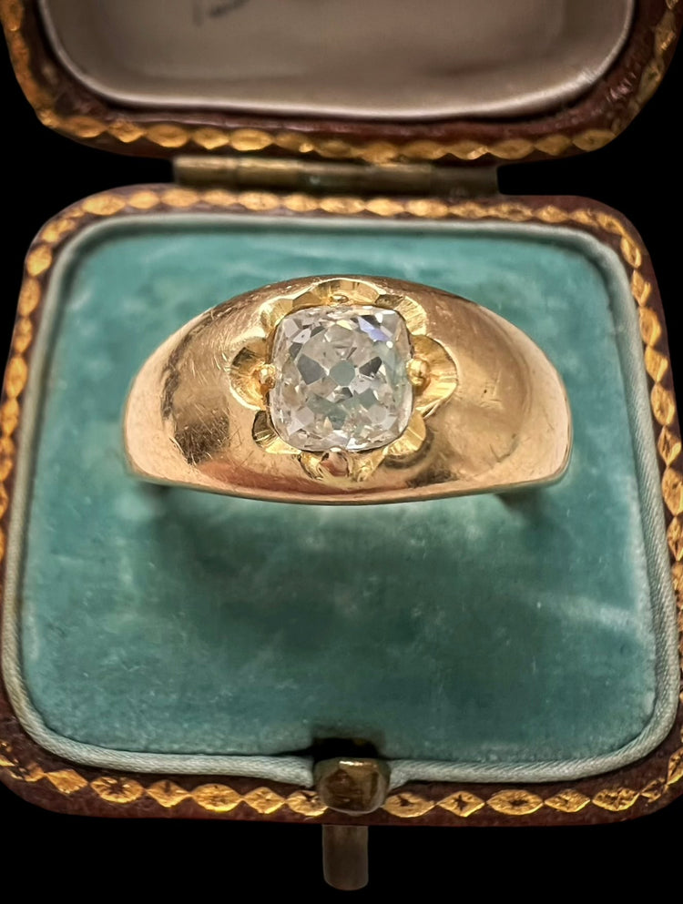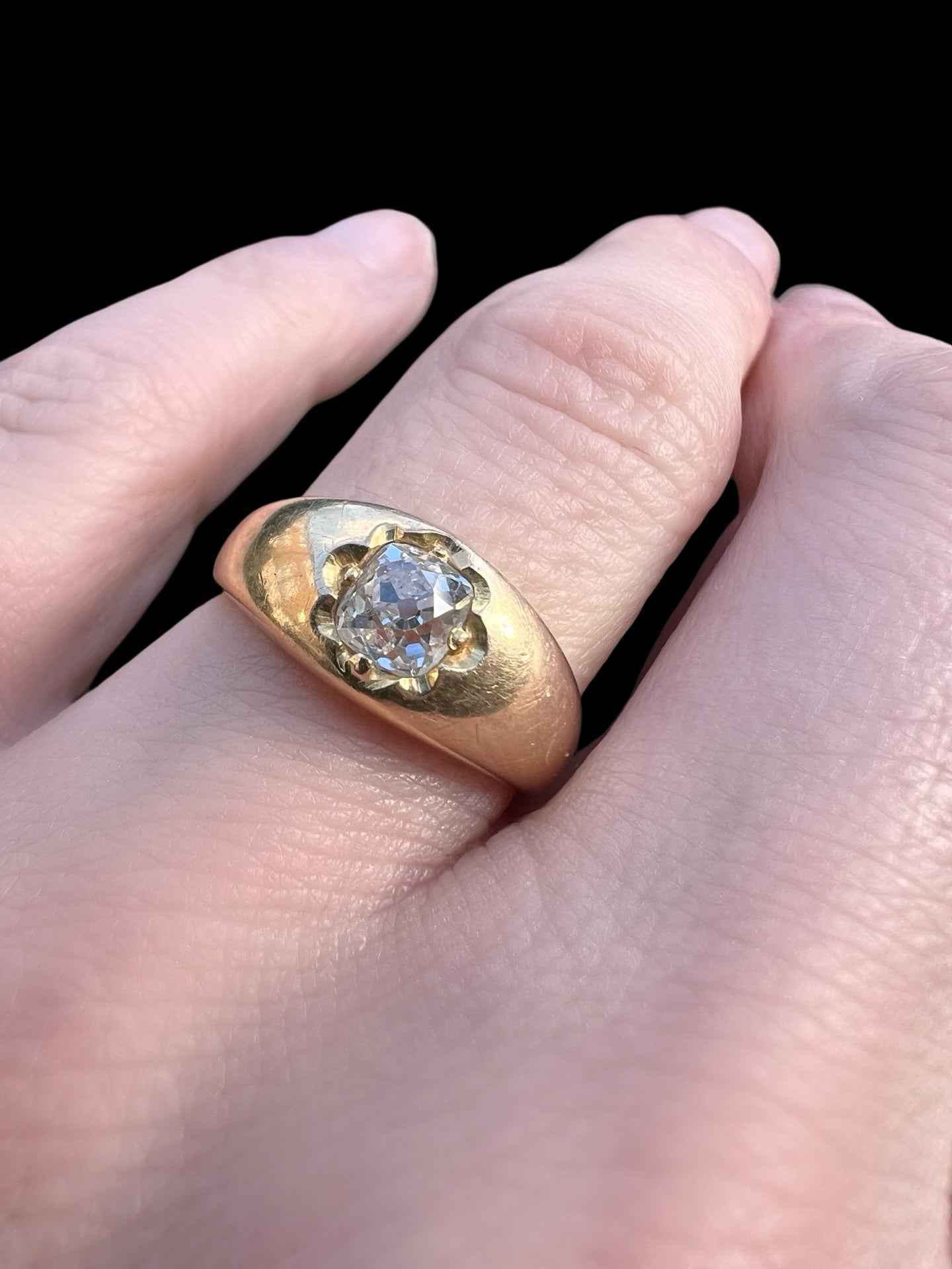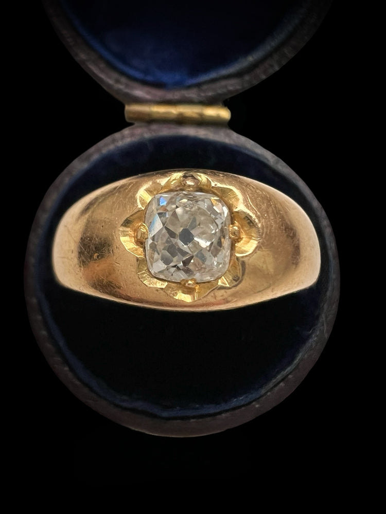 The chunky tapered 18ct gold band is set with a large cushion cut diamond in a scallop gypsy setting.