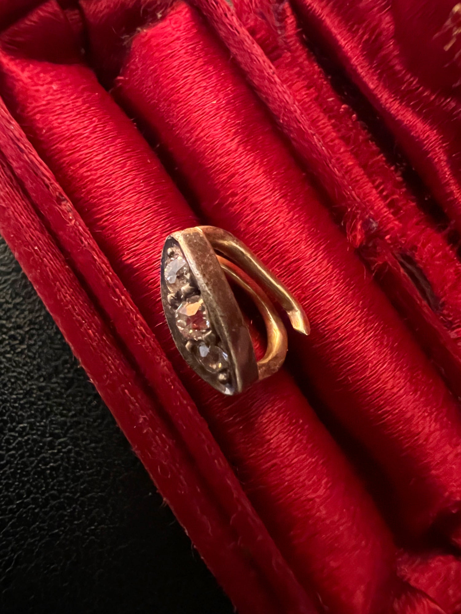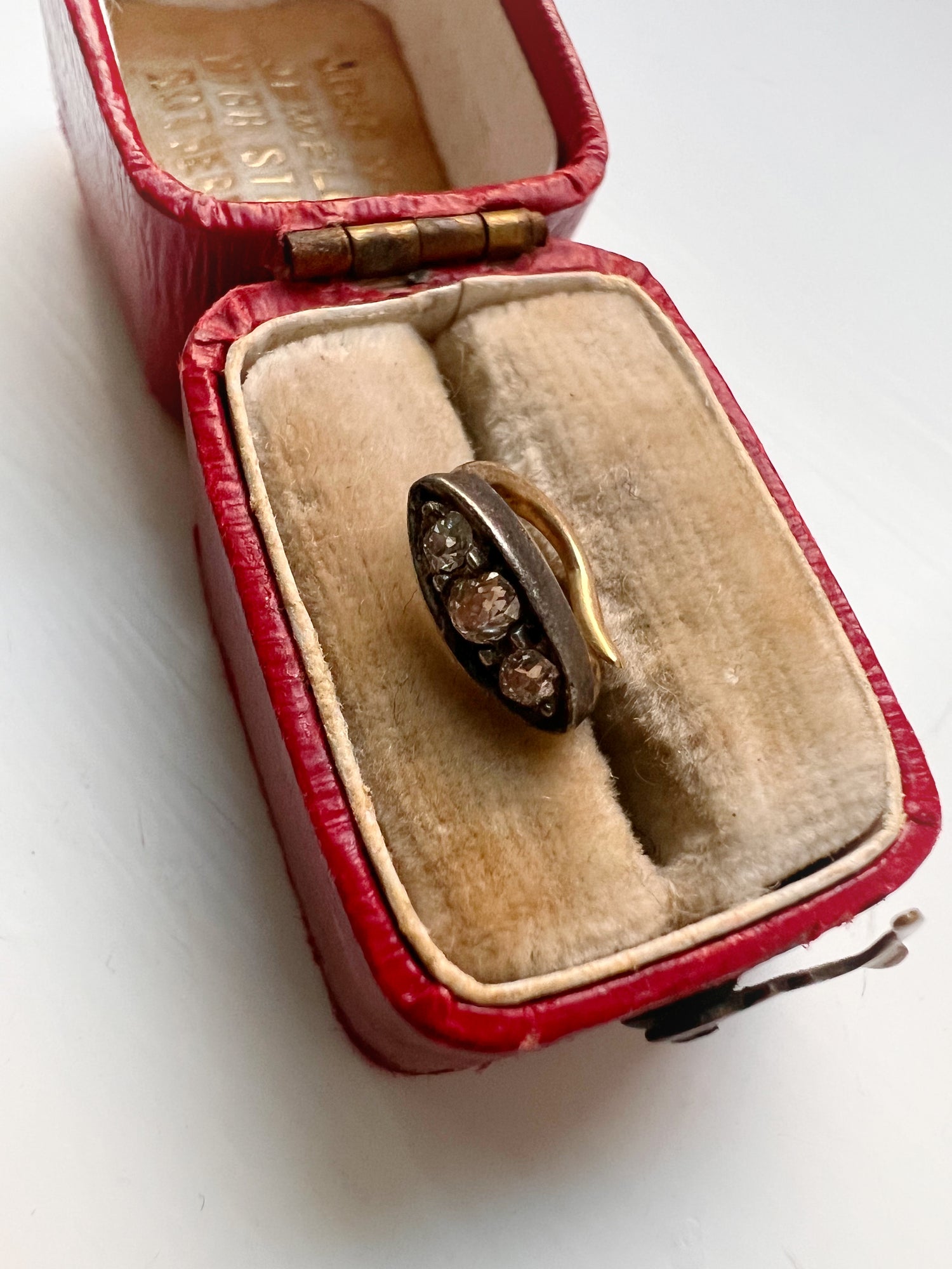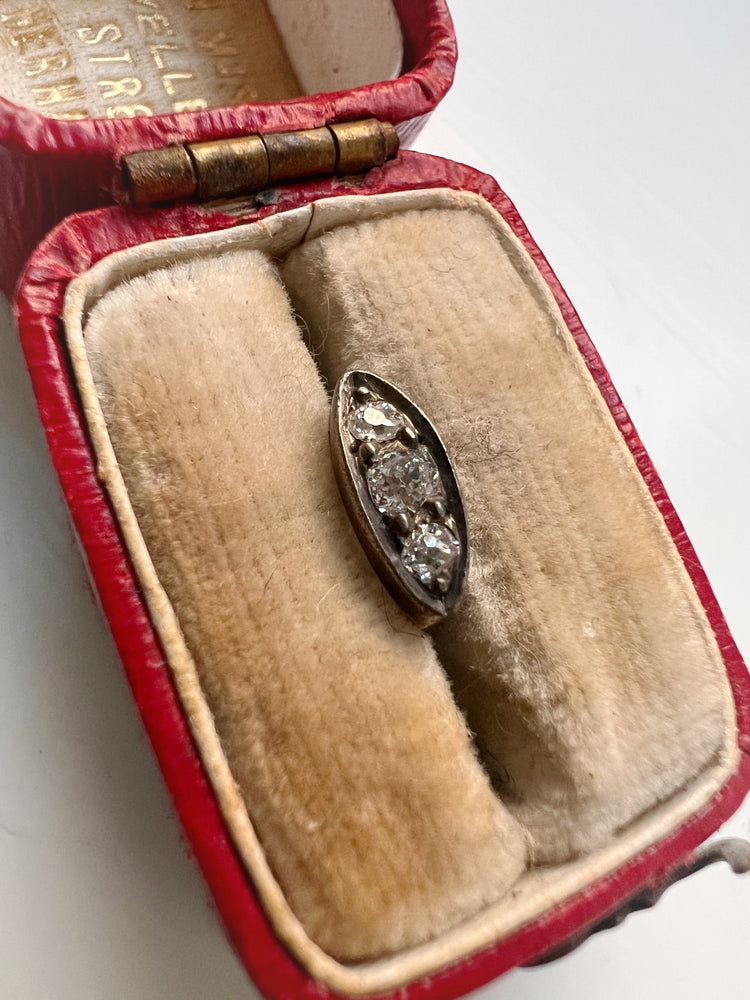 The three old cut diamonds are set in silver and backed in gold, they catch the light perfectly.