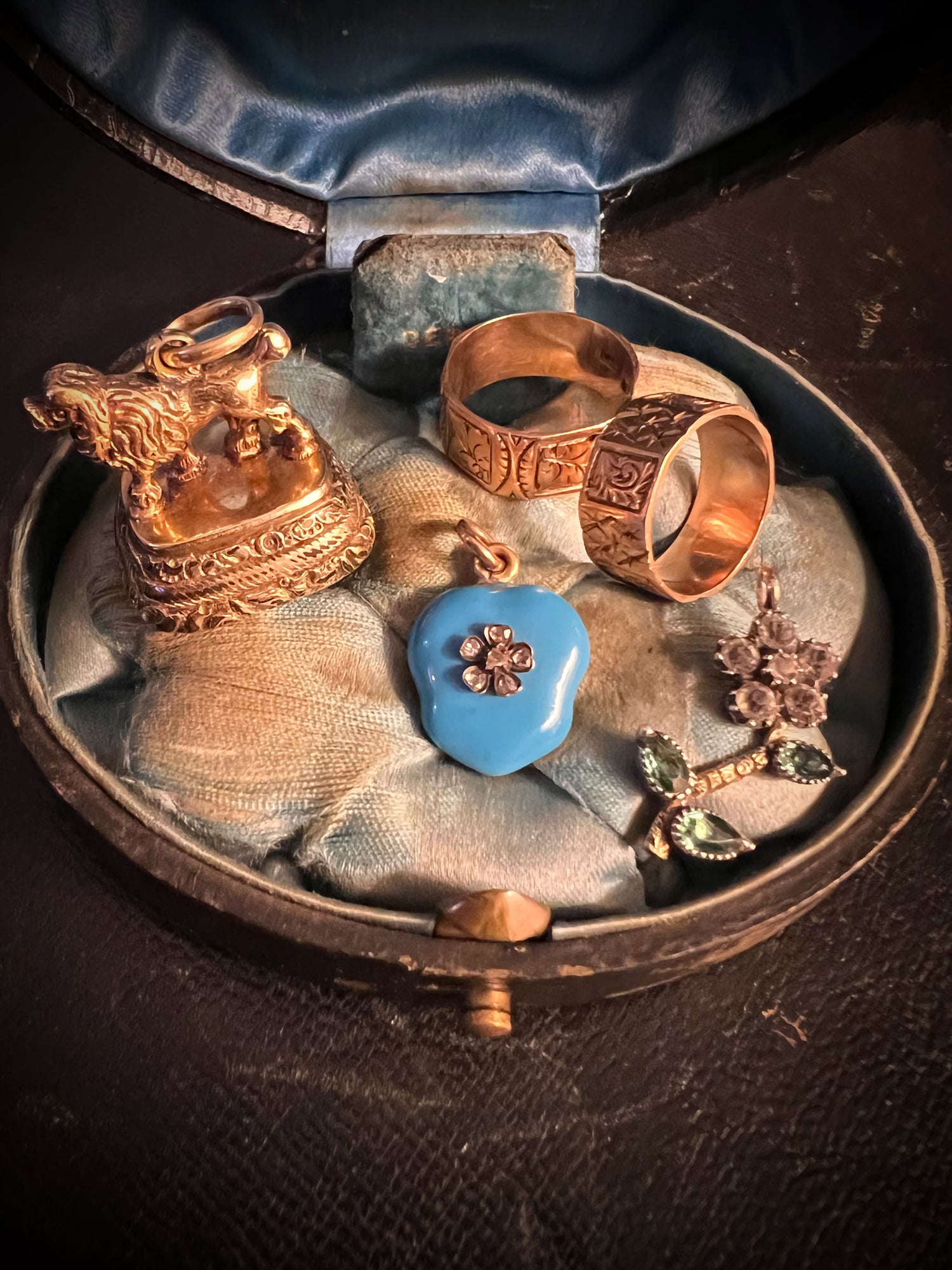 We recommend removing pieces of jewellery before washing hands or showering, as water can damage the antique settings.