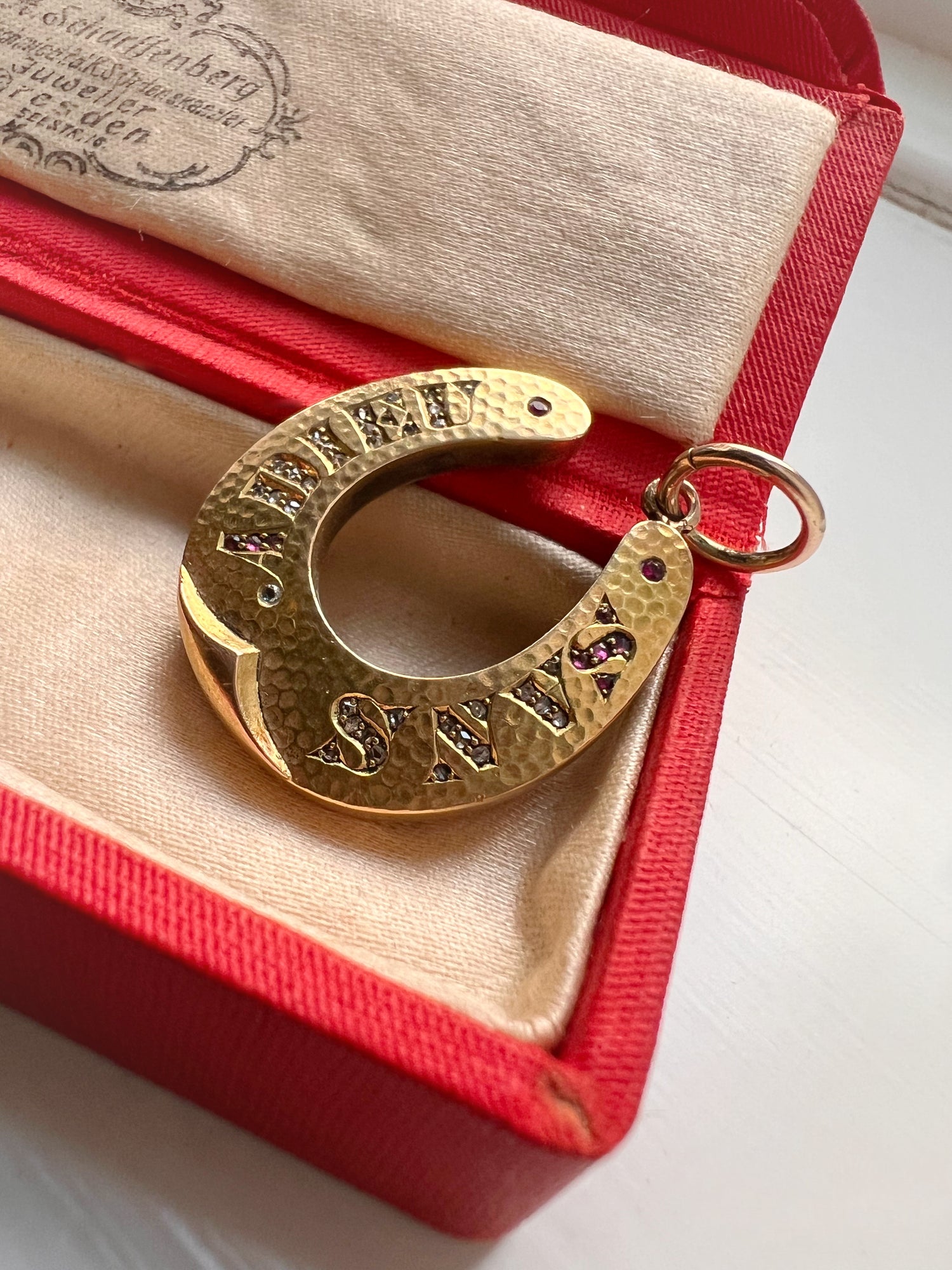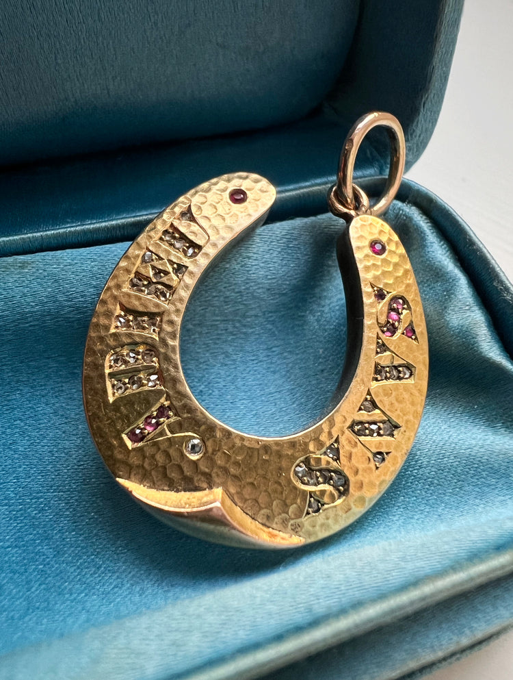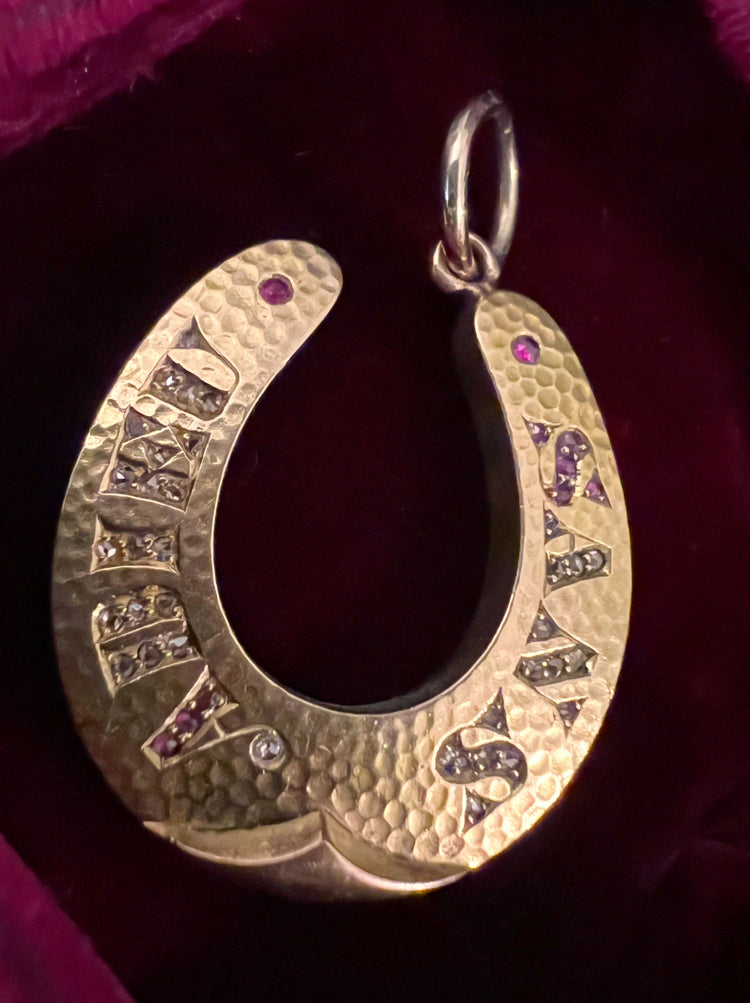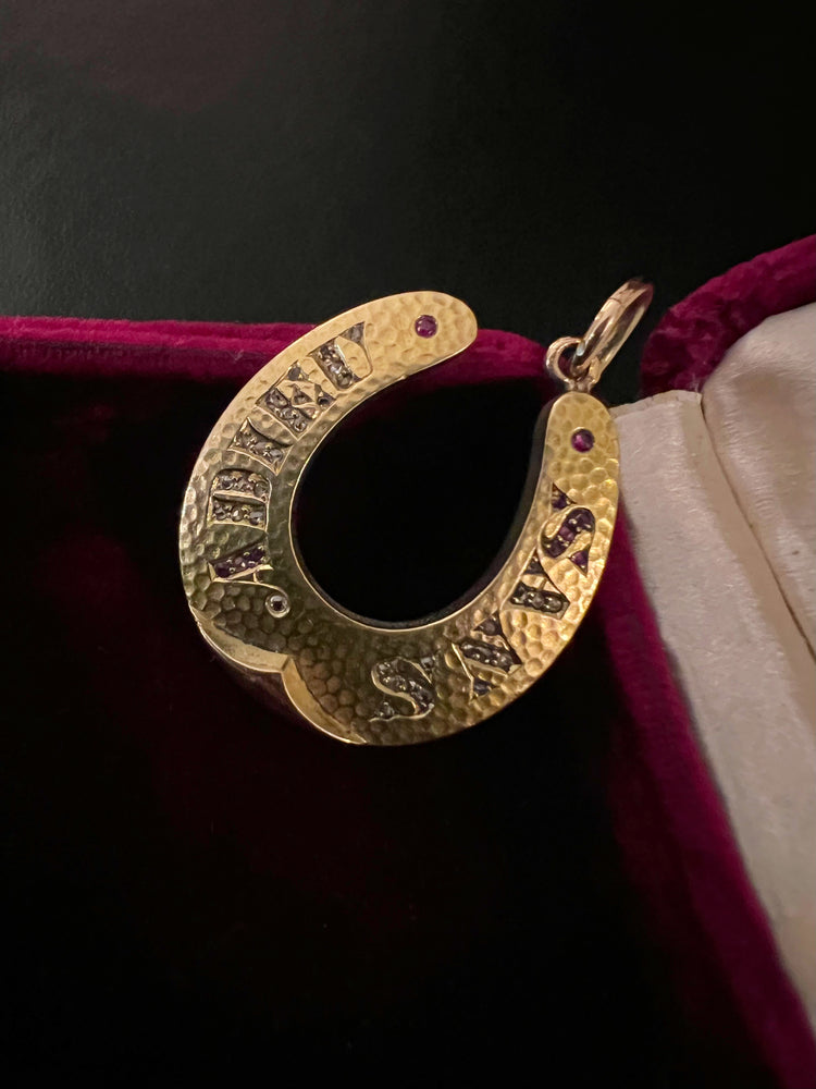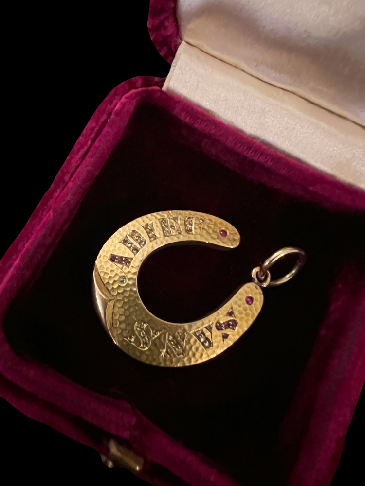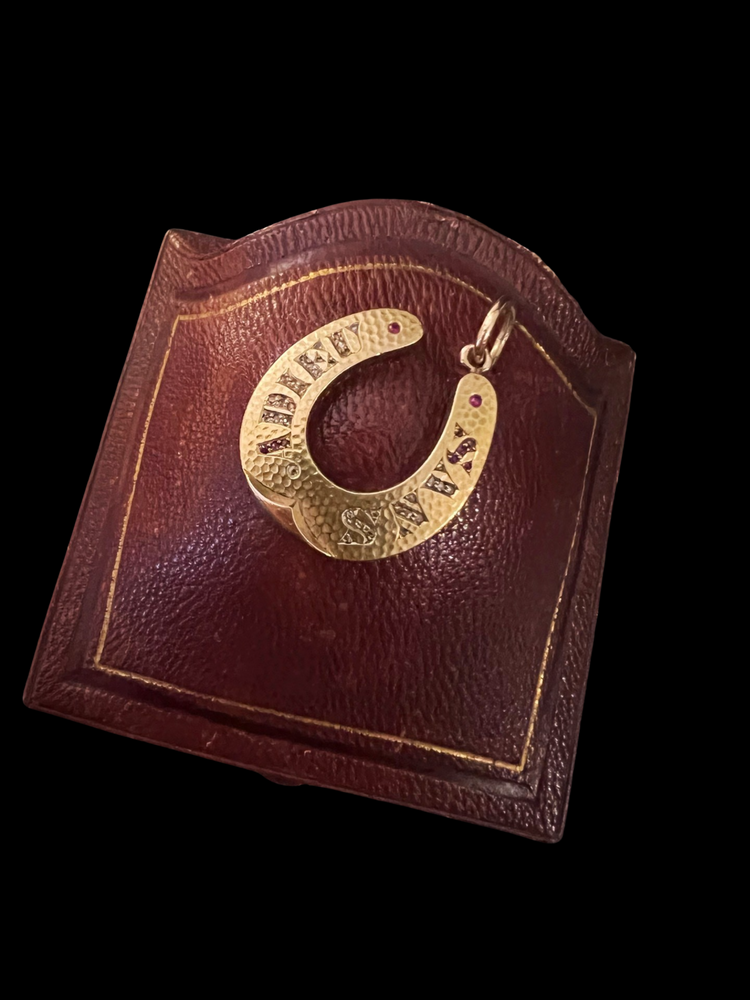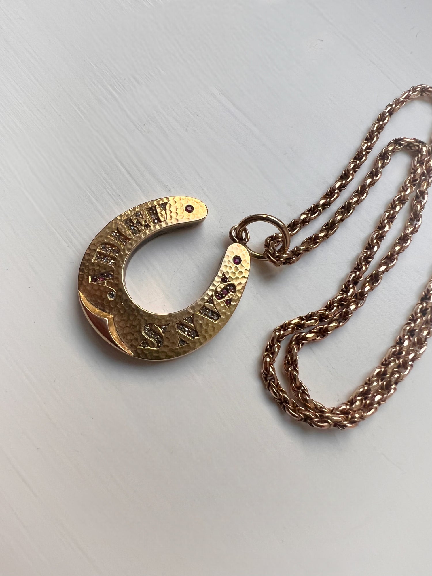 The most beautiful 15ct gold horseshoe pendant with the words ‘Sans Adieu’ written in tiny diamonds and rubies.